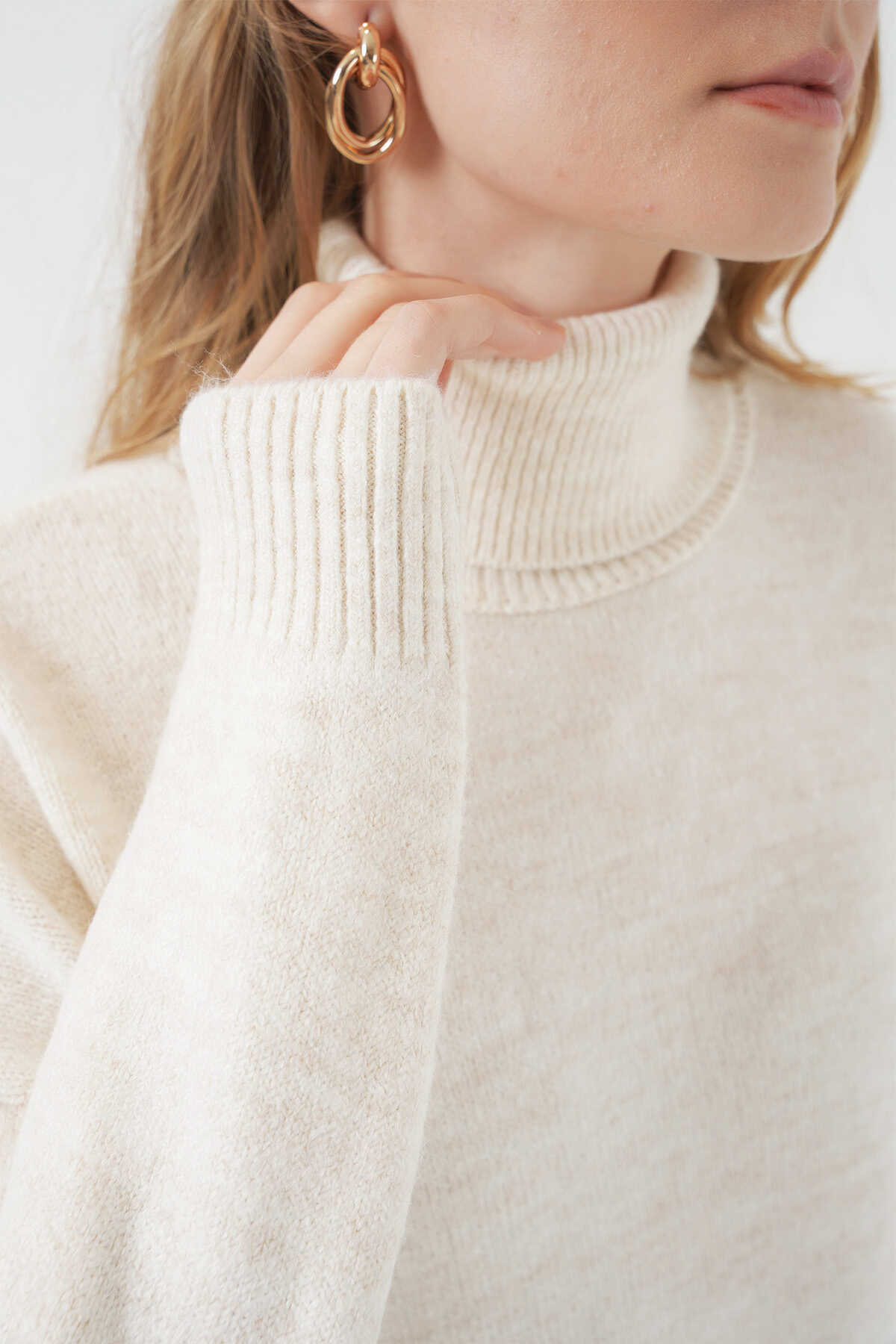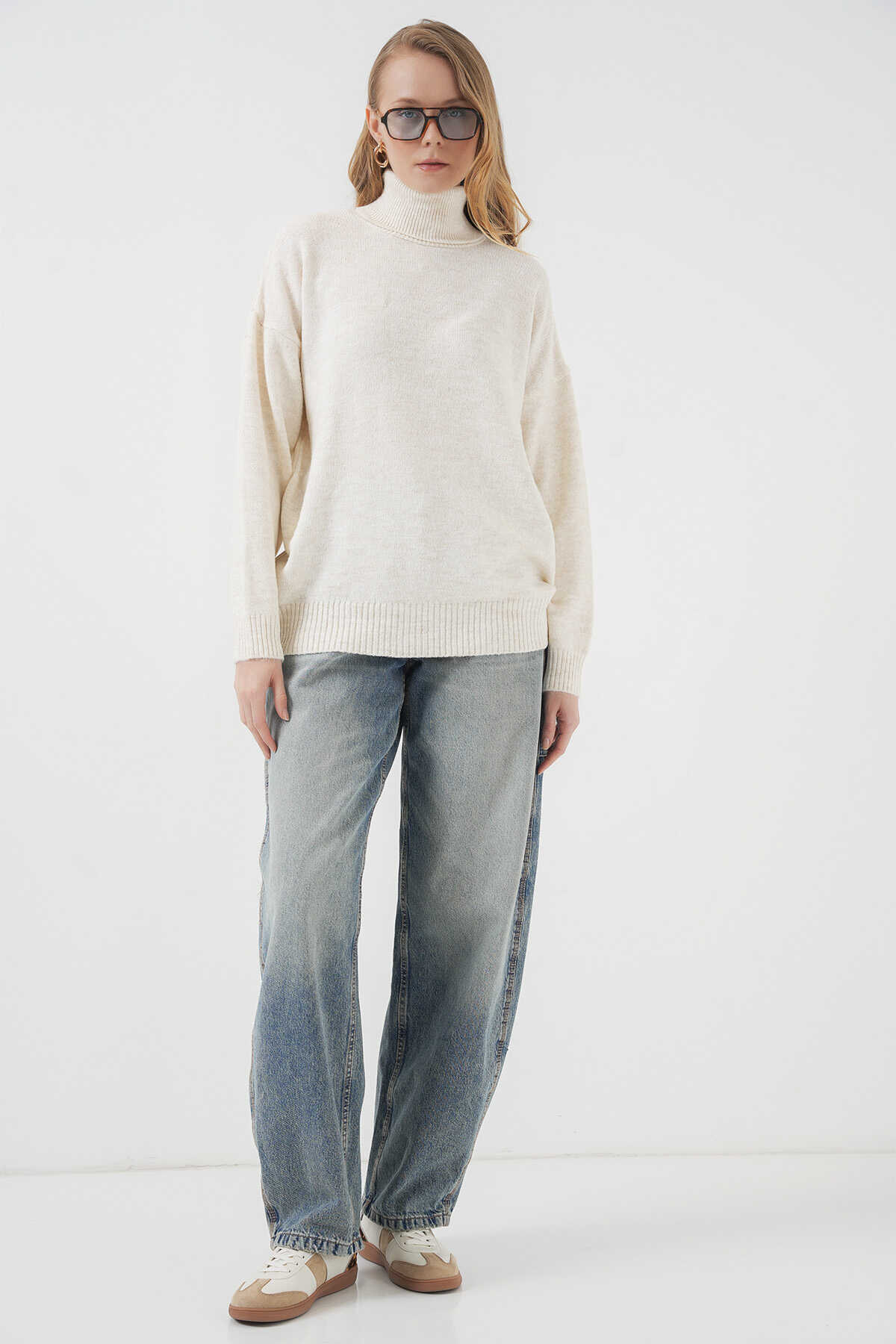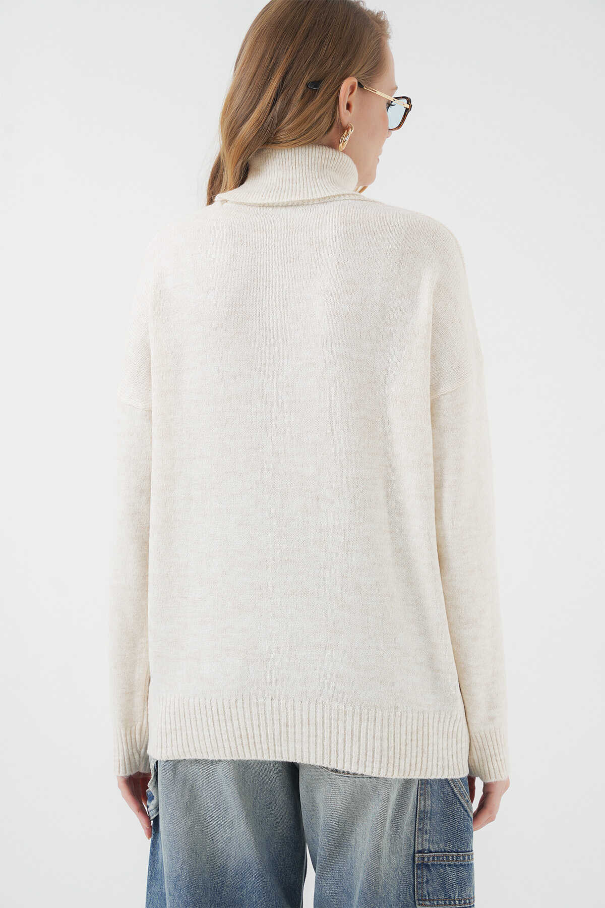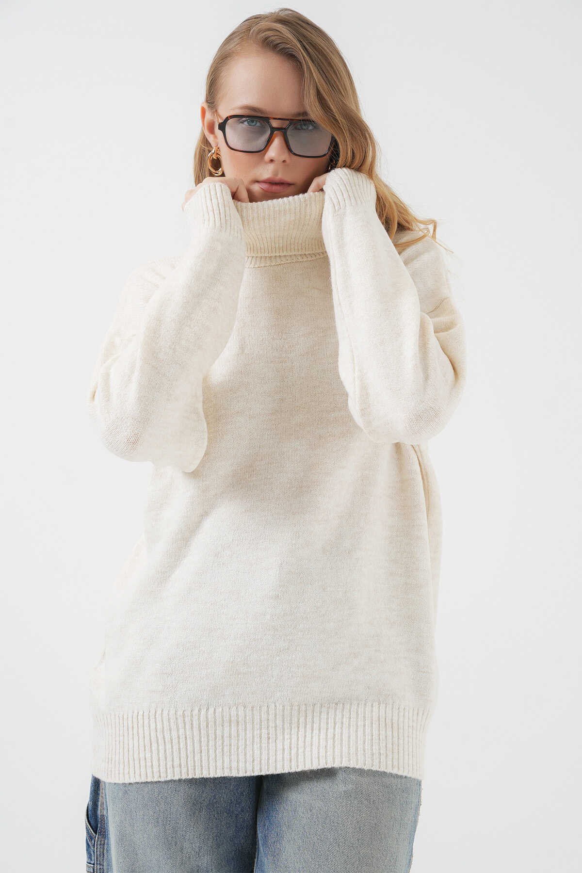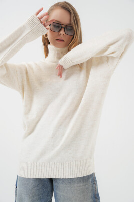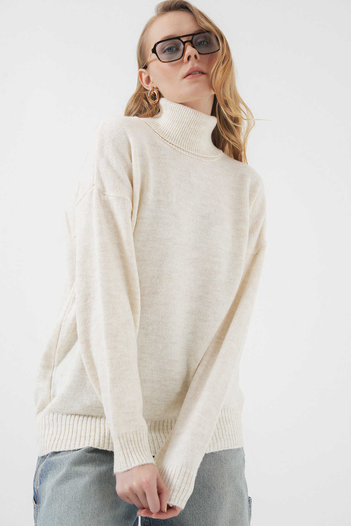 15917 Kadın Balıkçı Yaka Oversize Triko Kazak - Ekru - Kombin