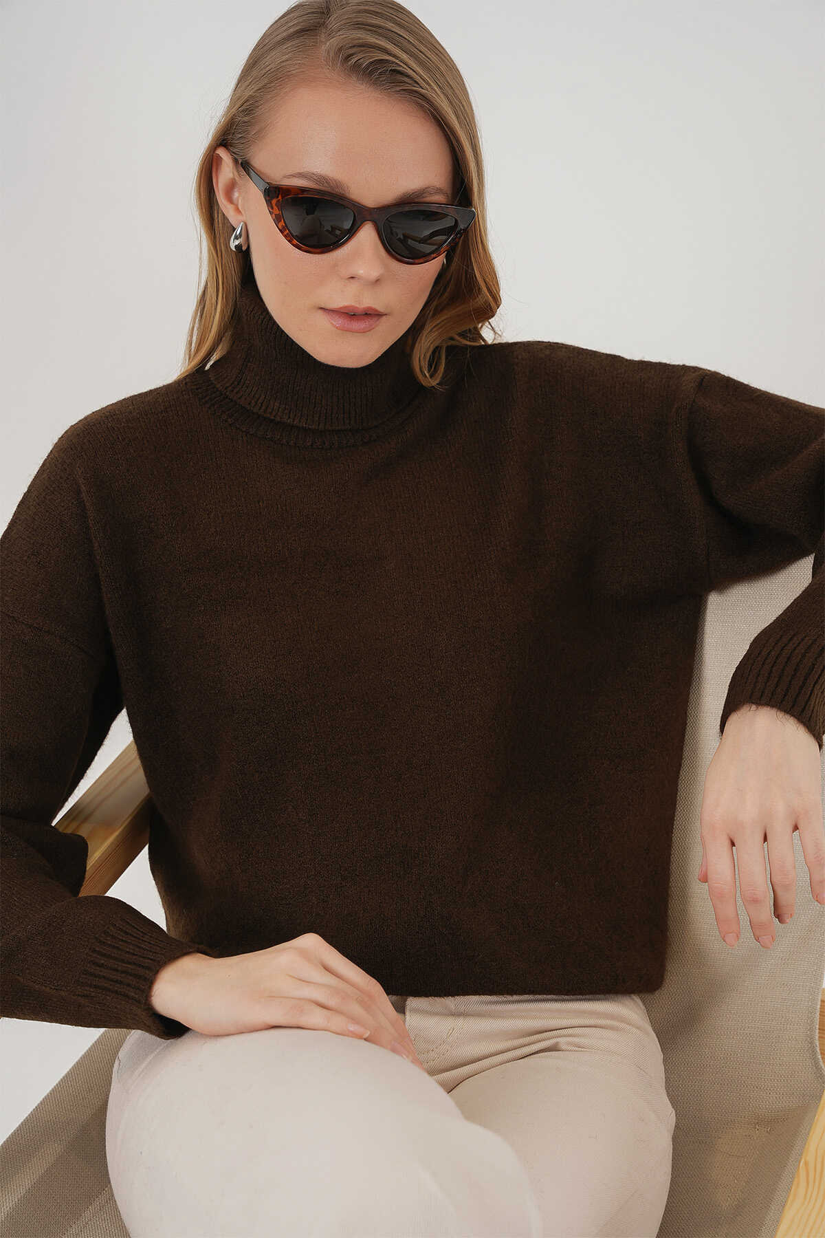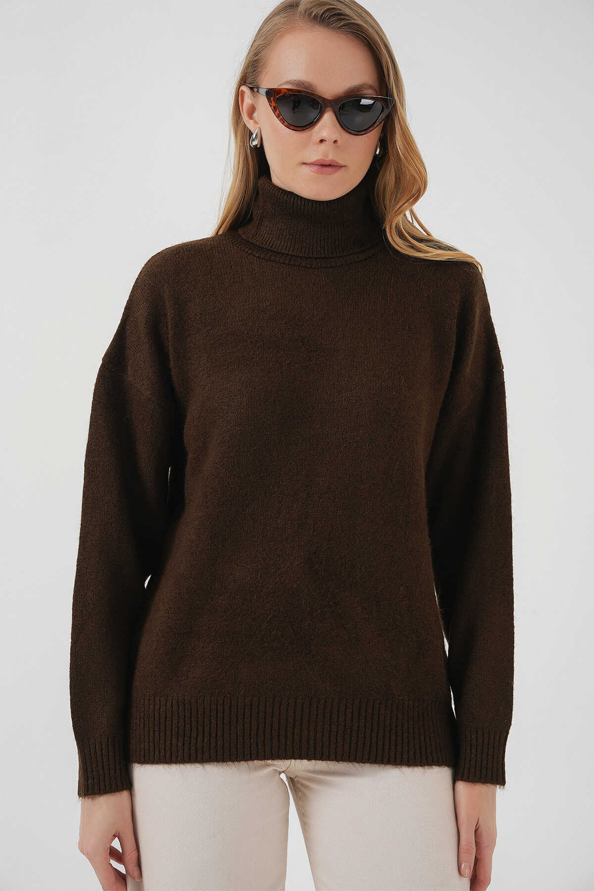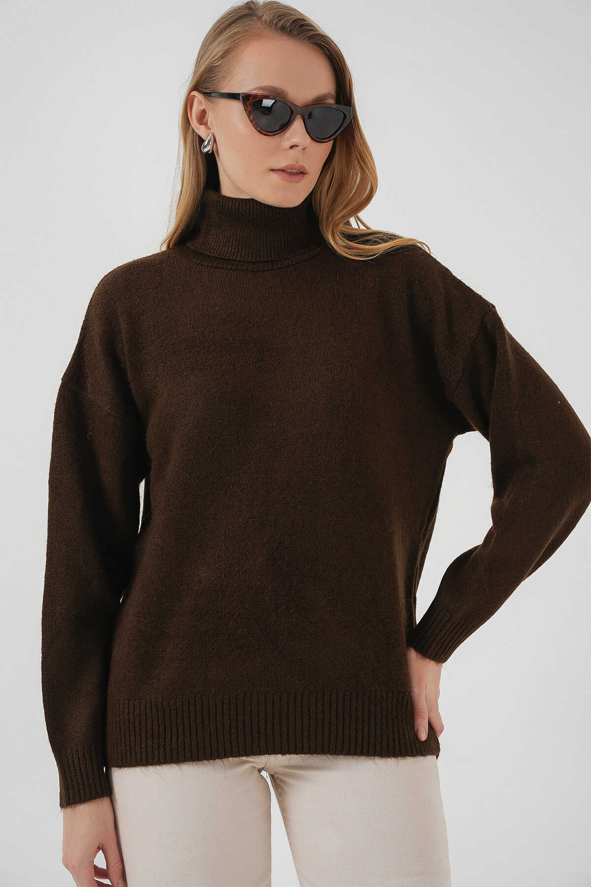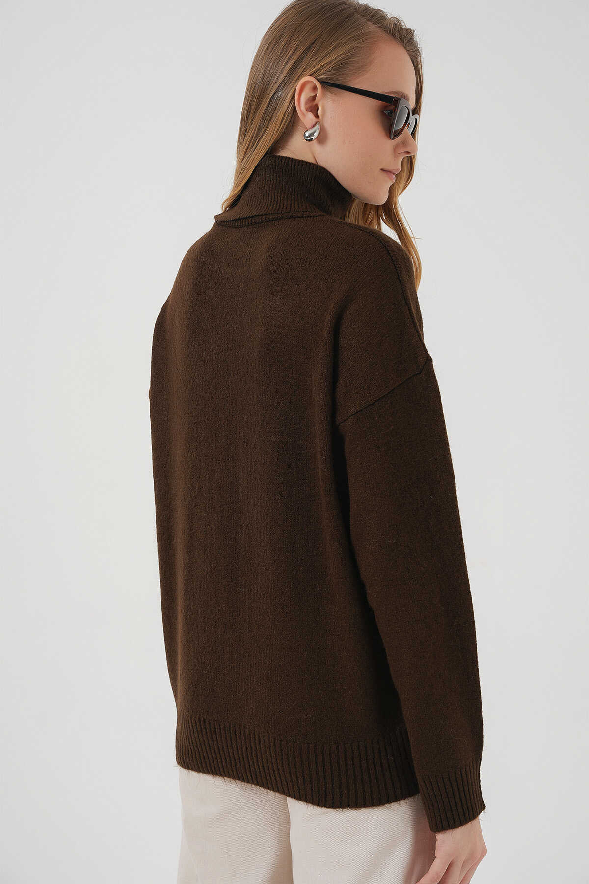 15917 Kadın Balıkçı Yaka Oversize Triko Kazak - Kahverengi
