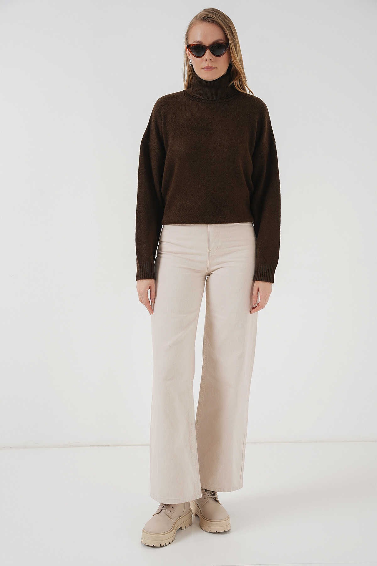 15917 Kadın Balıkçı Yaka Oversize Triko Kazak - Kahverengi - Kombin