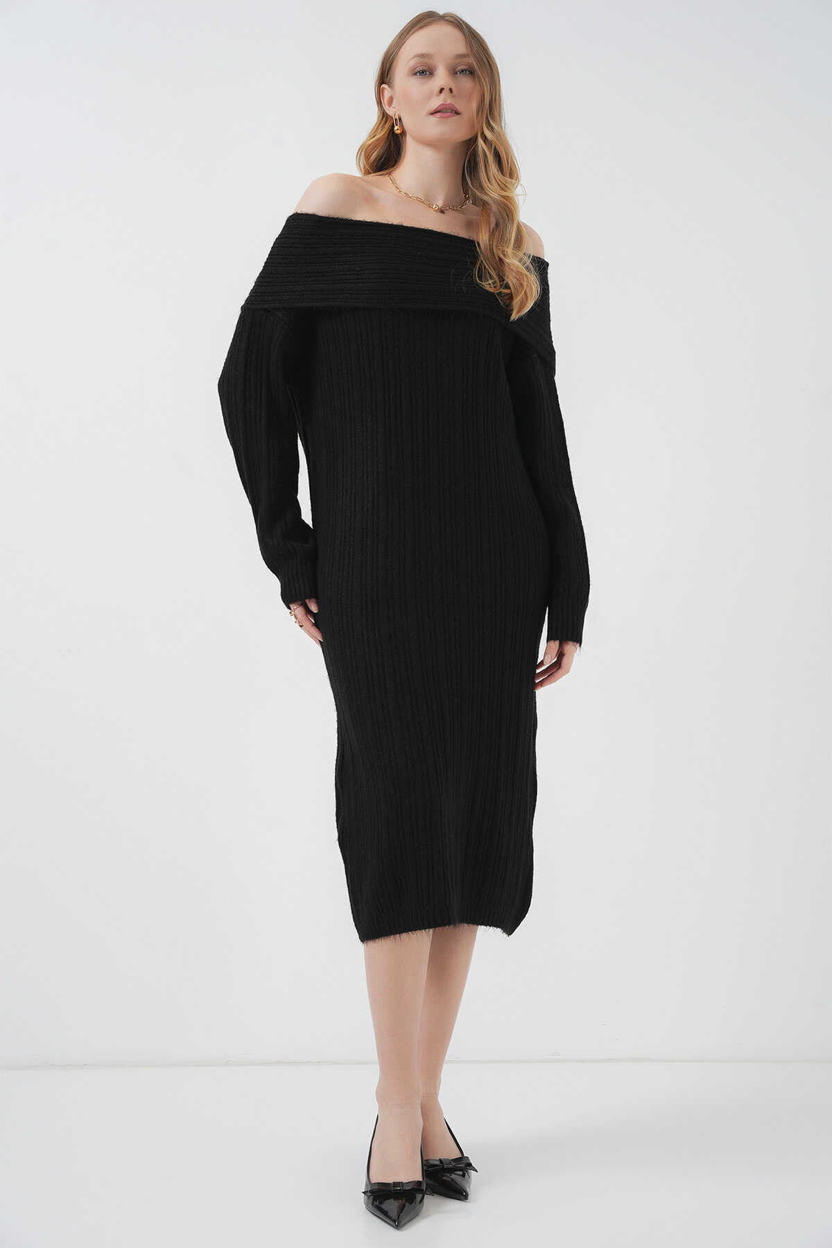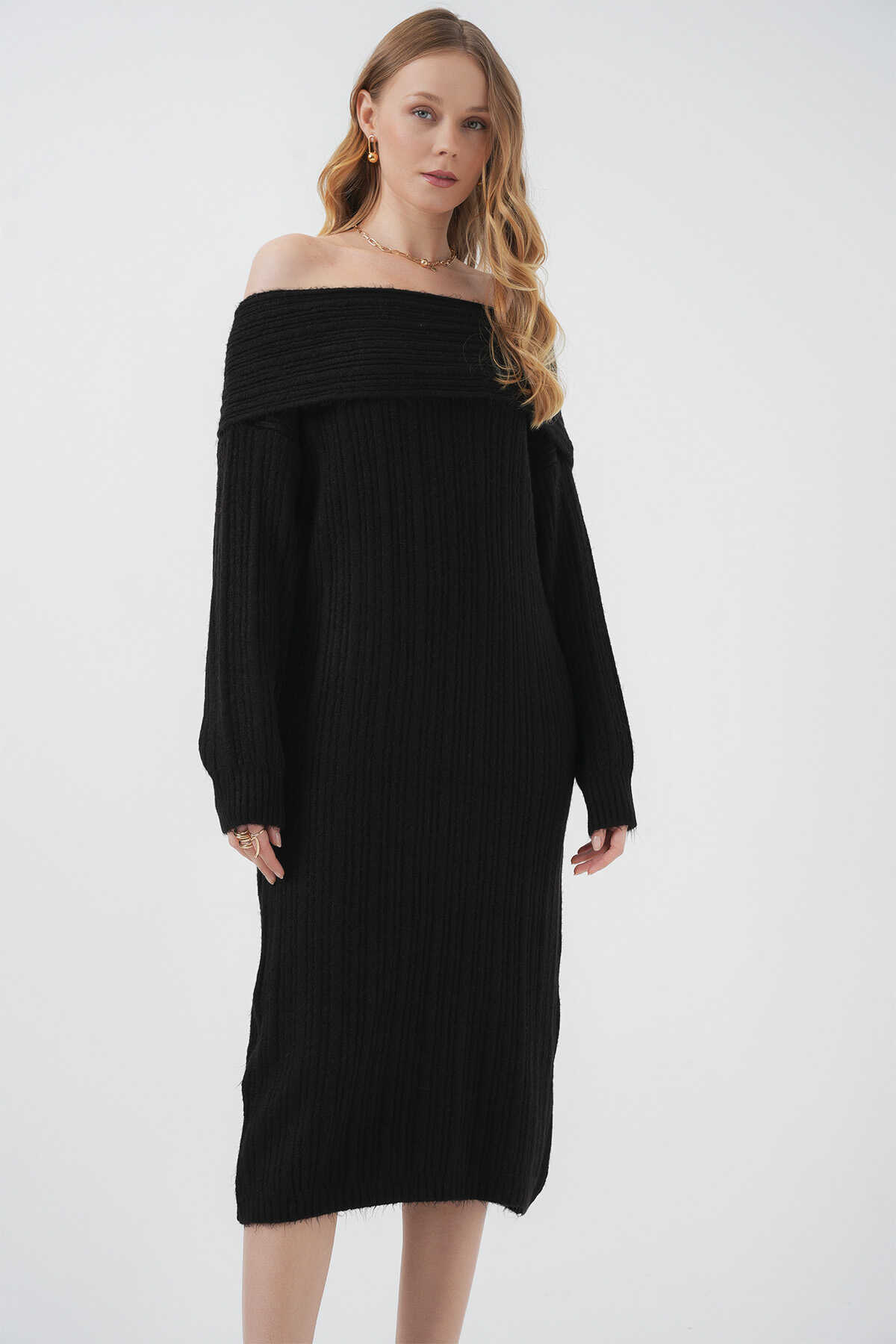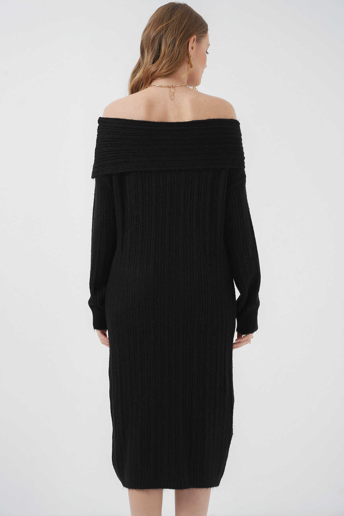 15920 Madonna Yaka Oversize Triko Elbise - Siyah - Kombin