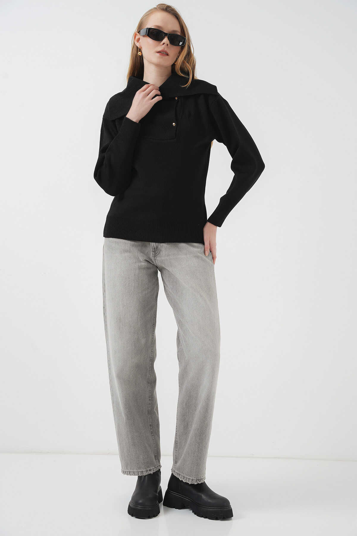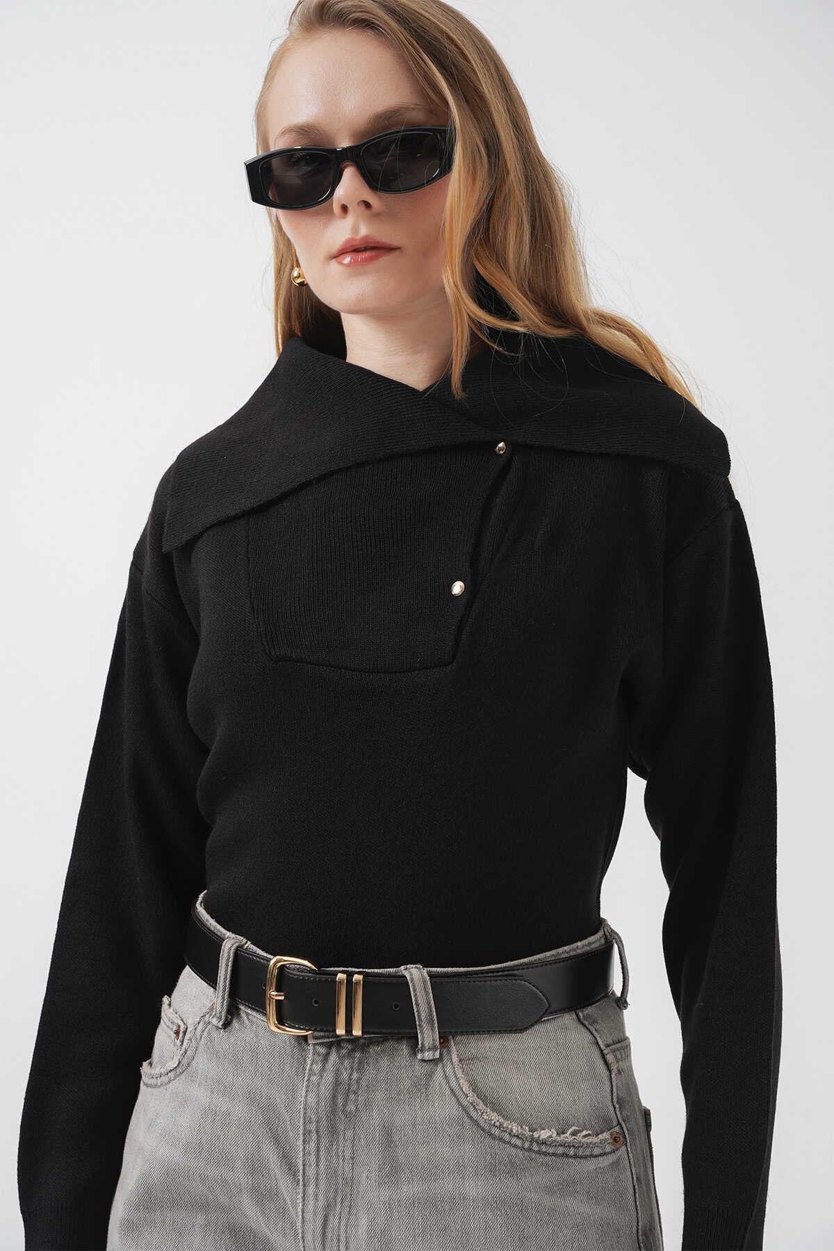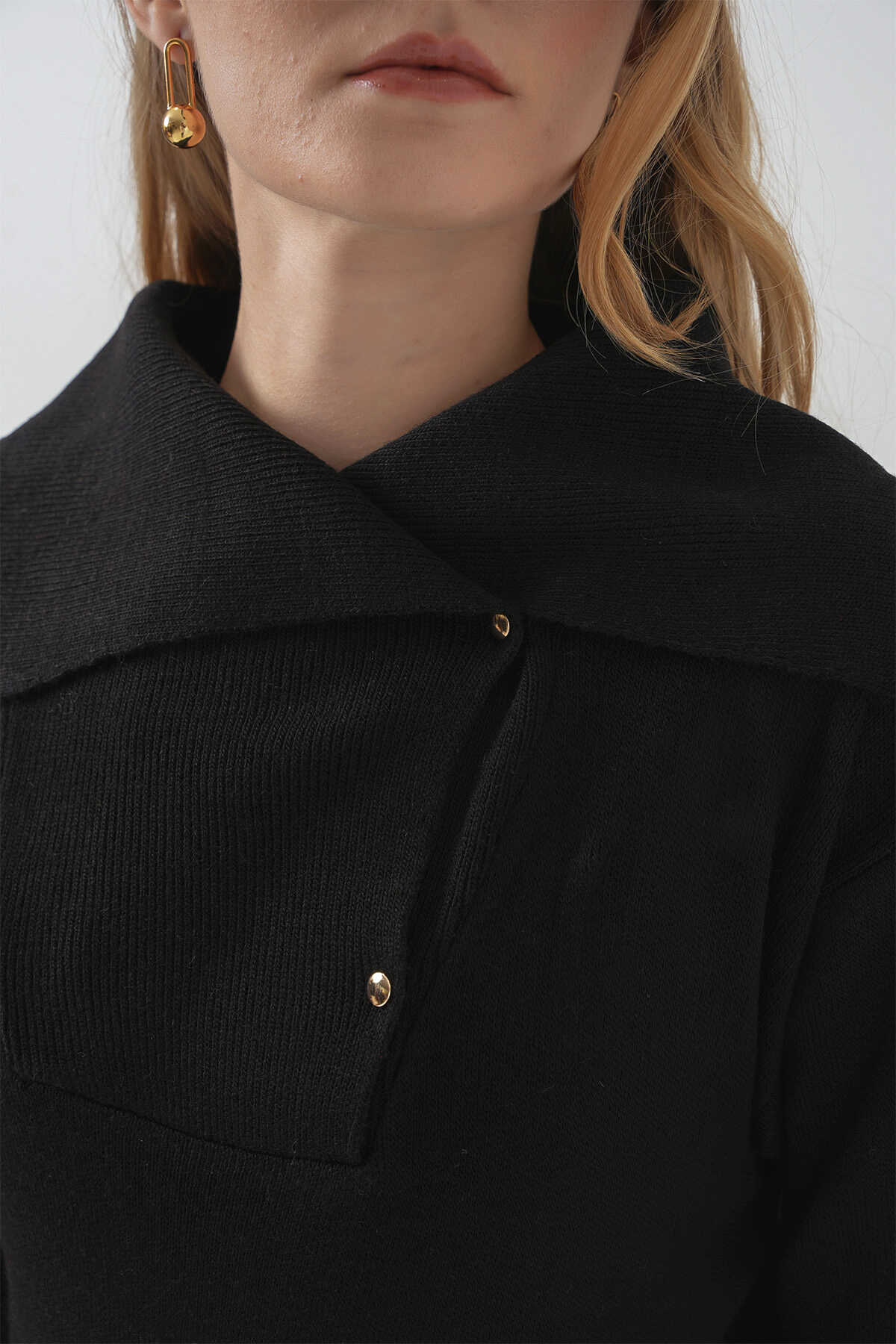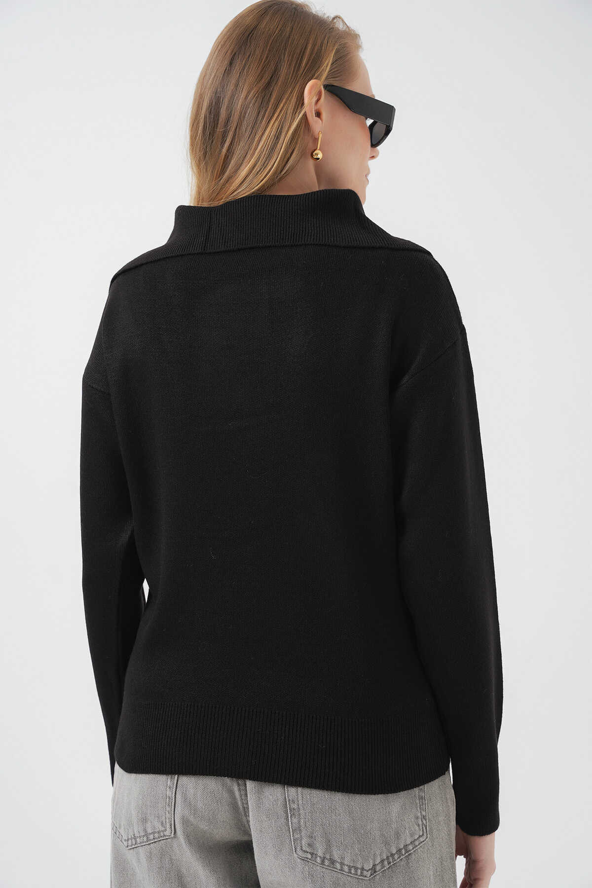 15921 Geniş Yaka Triko Kazak - Siyah - Kombin