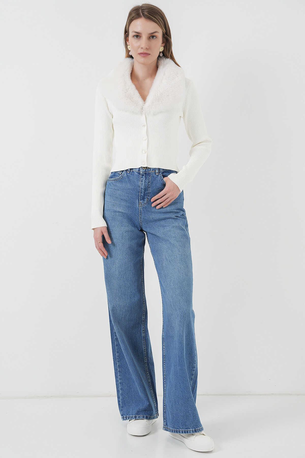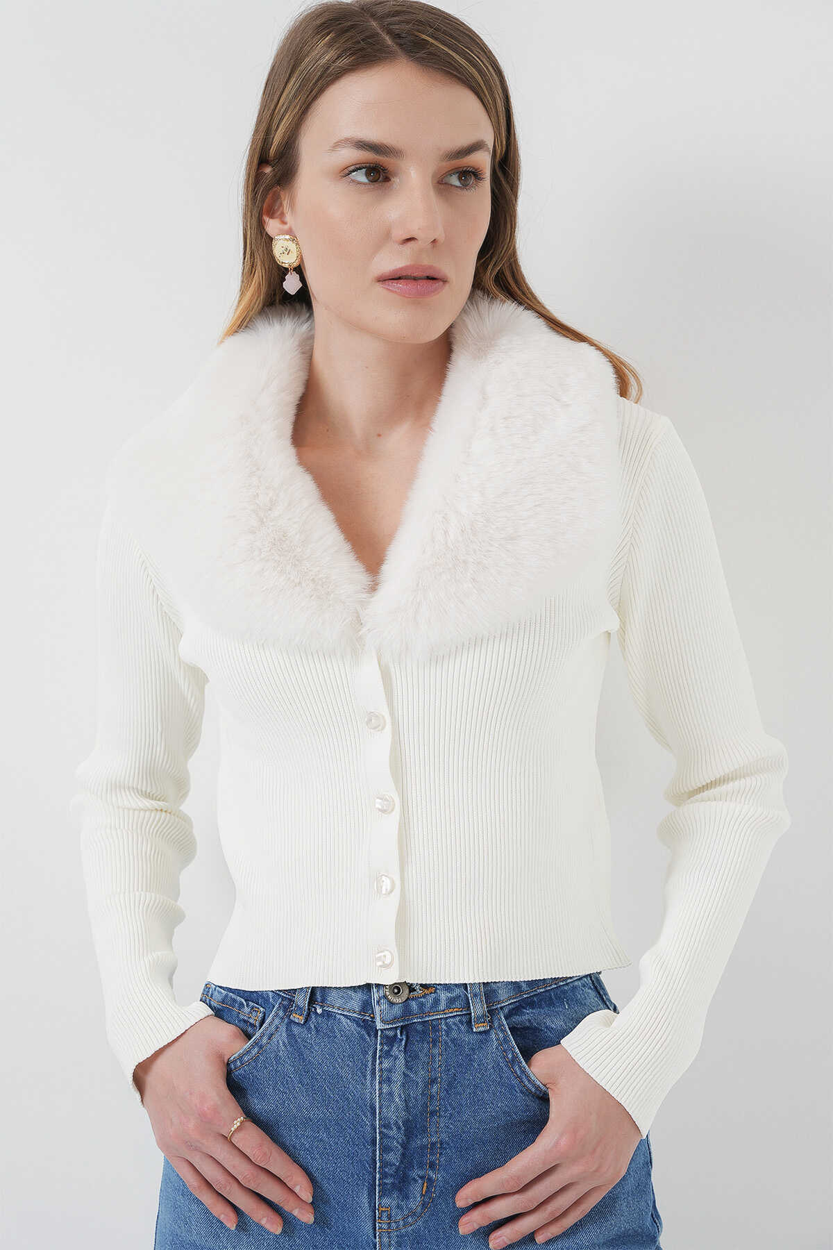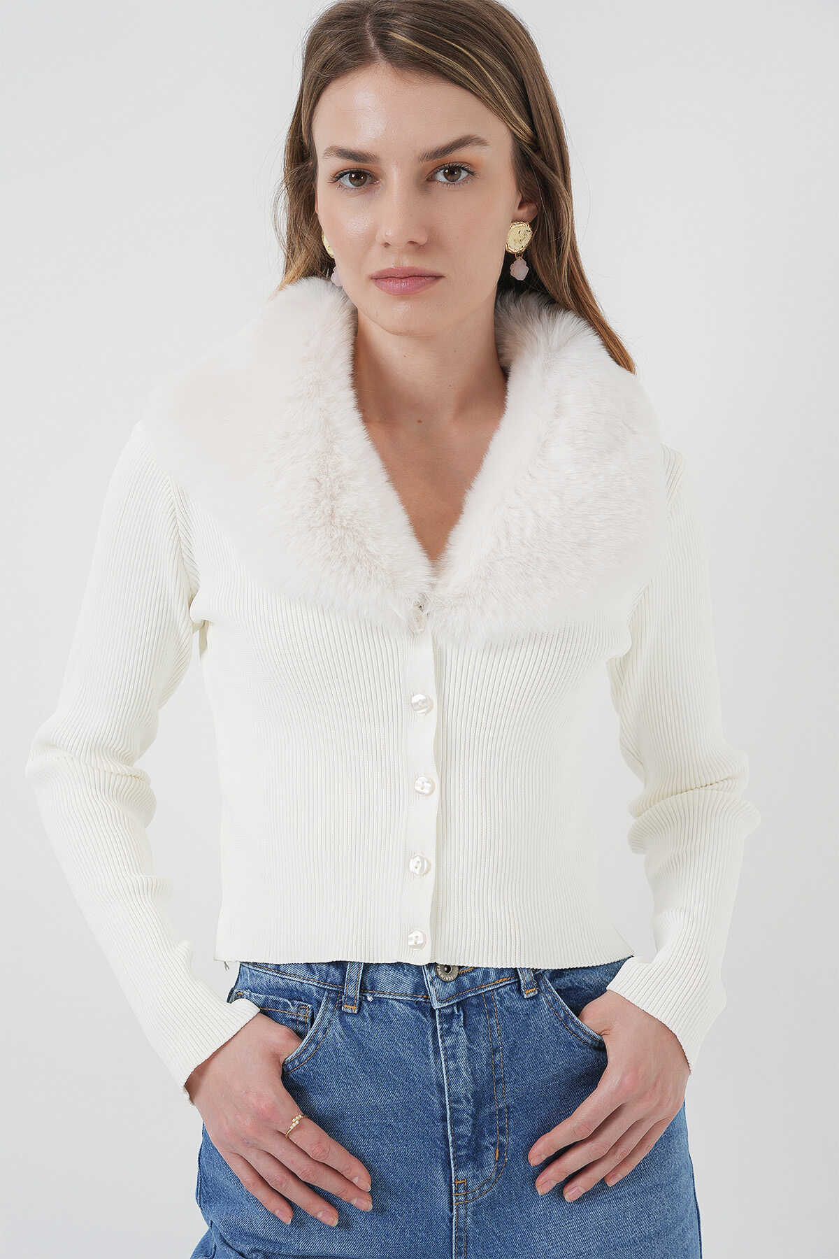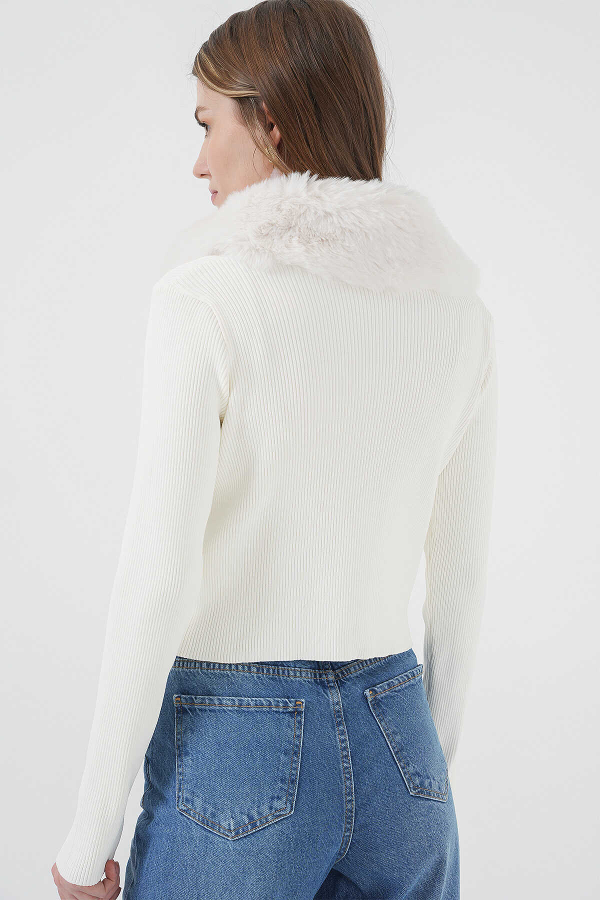 15922 Yakası Kürklü Triko Hırka - Beyaz - Kombin
