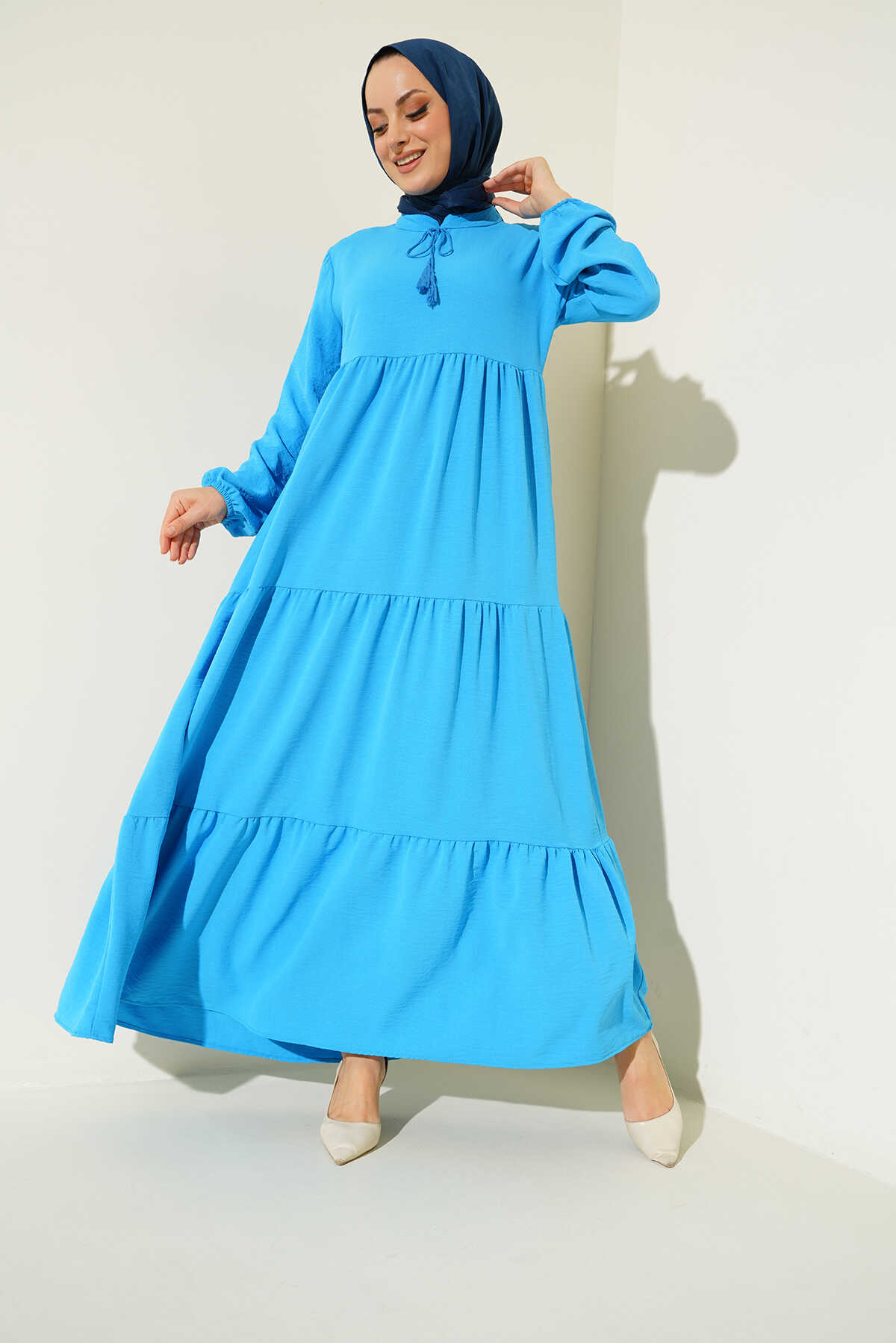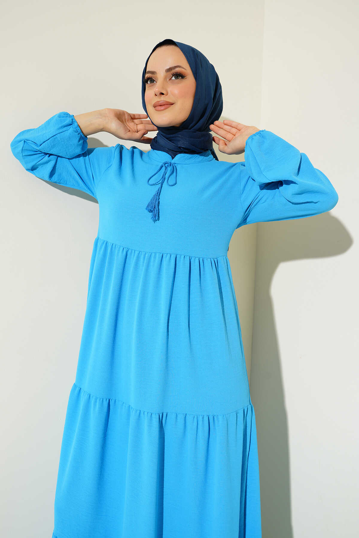 1627 Yaka Bağcıklı Tesettür Elbise - C.Mavi - Kombin