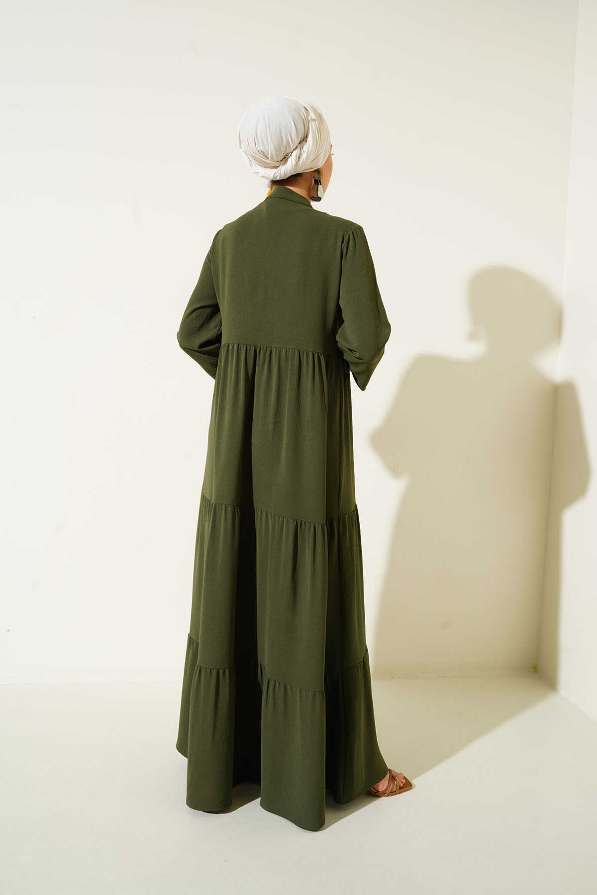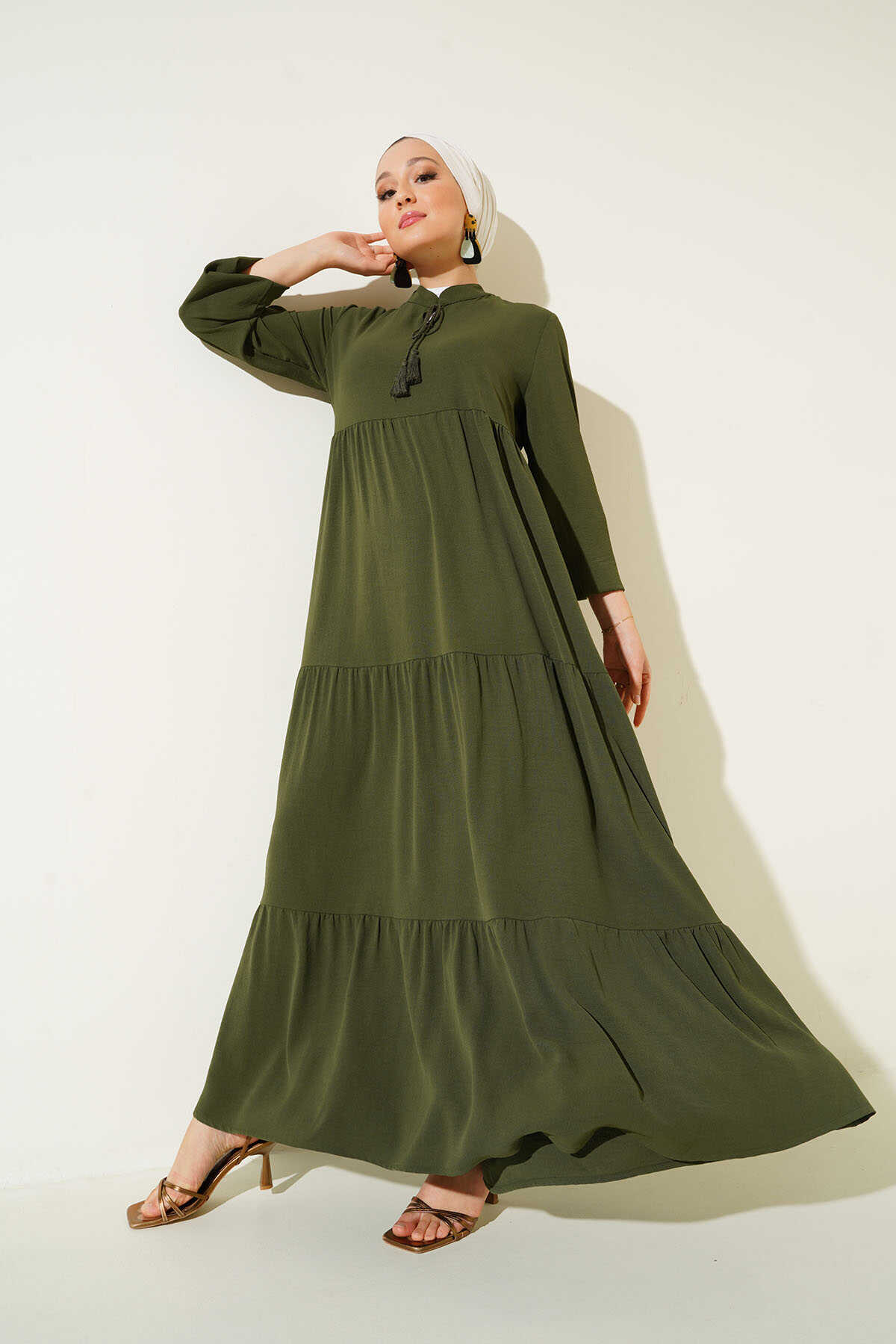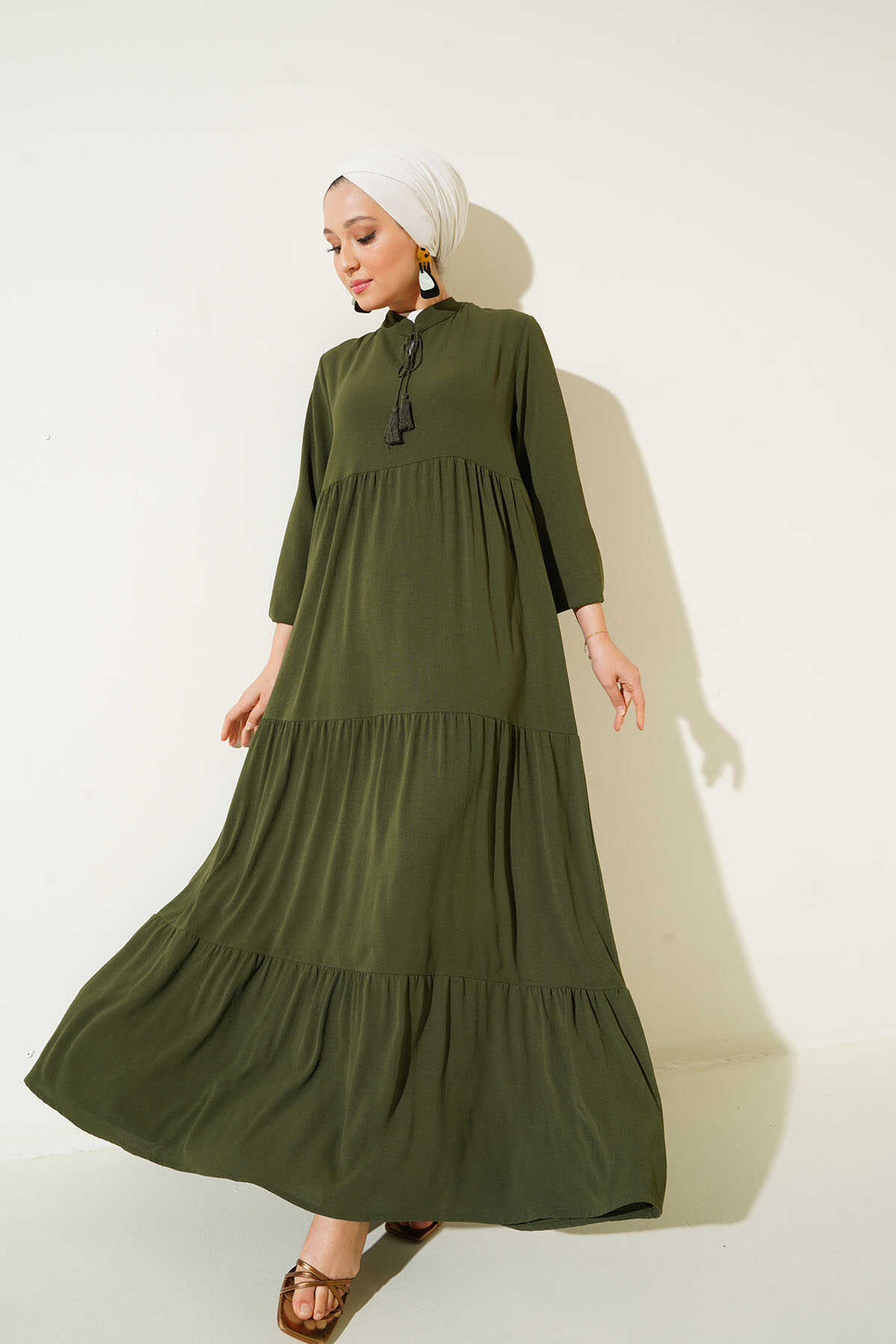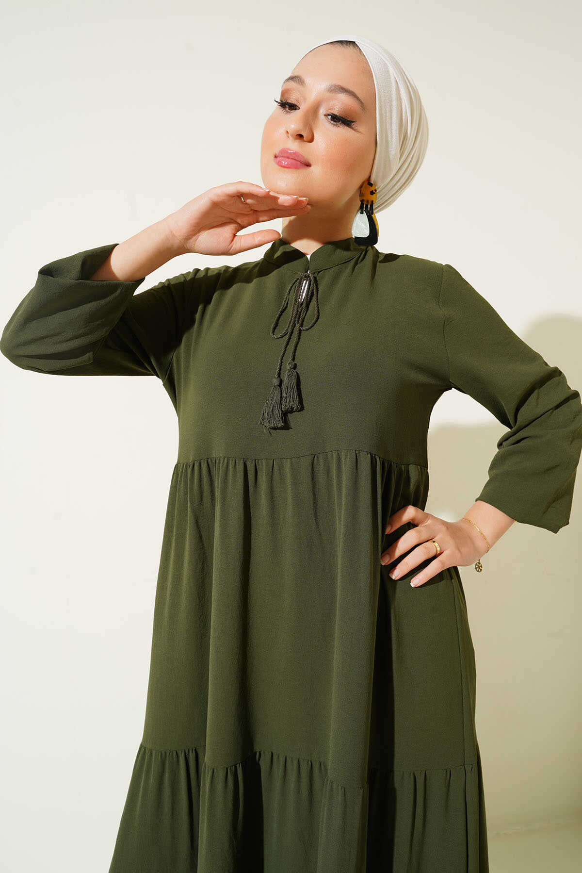 1627 Yaka Bağcıklı Tesettür Elbise - D.Haki - Kombin