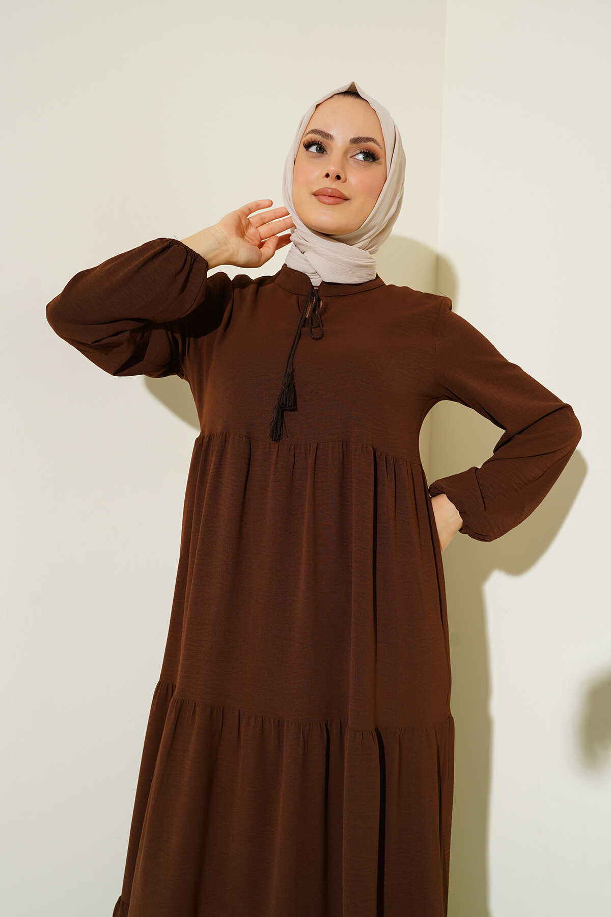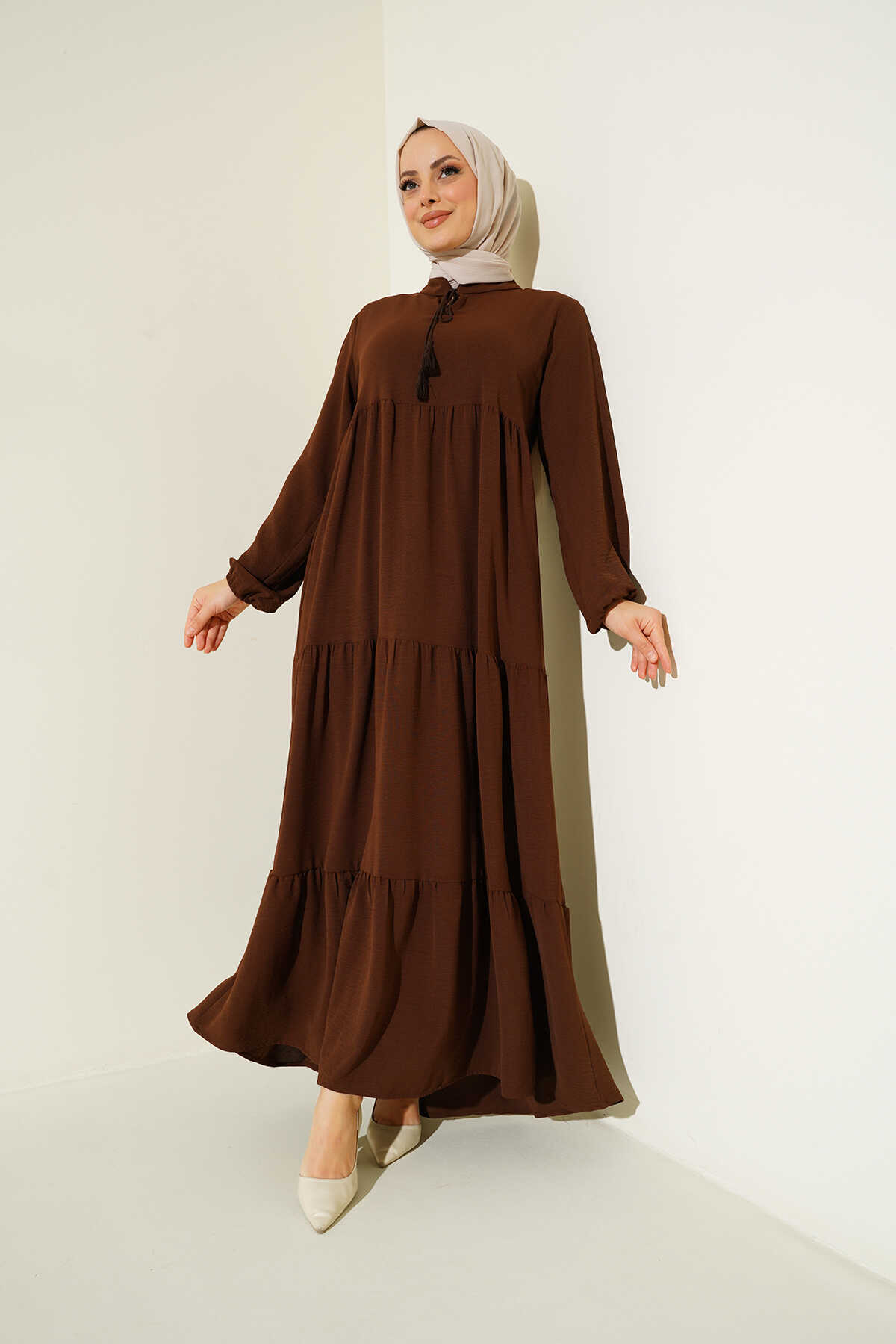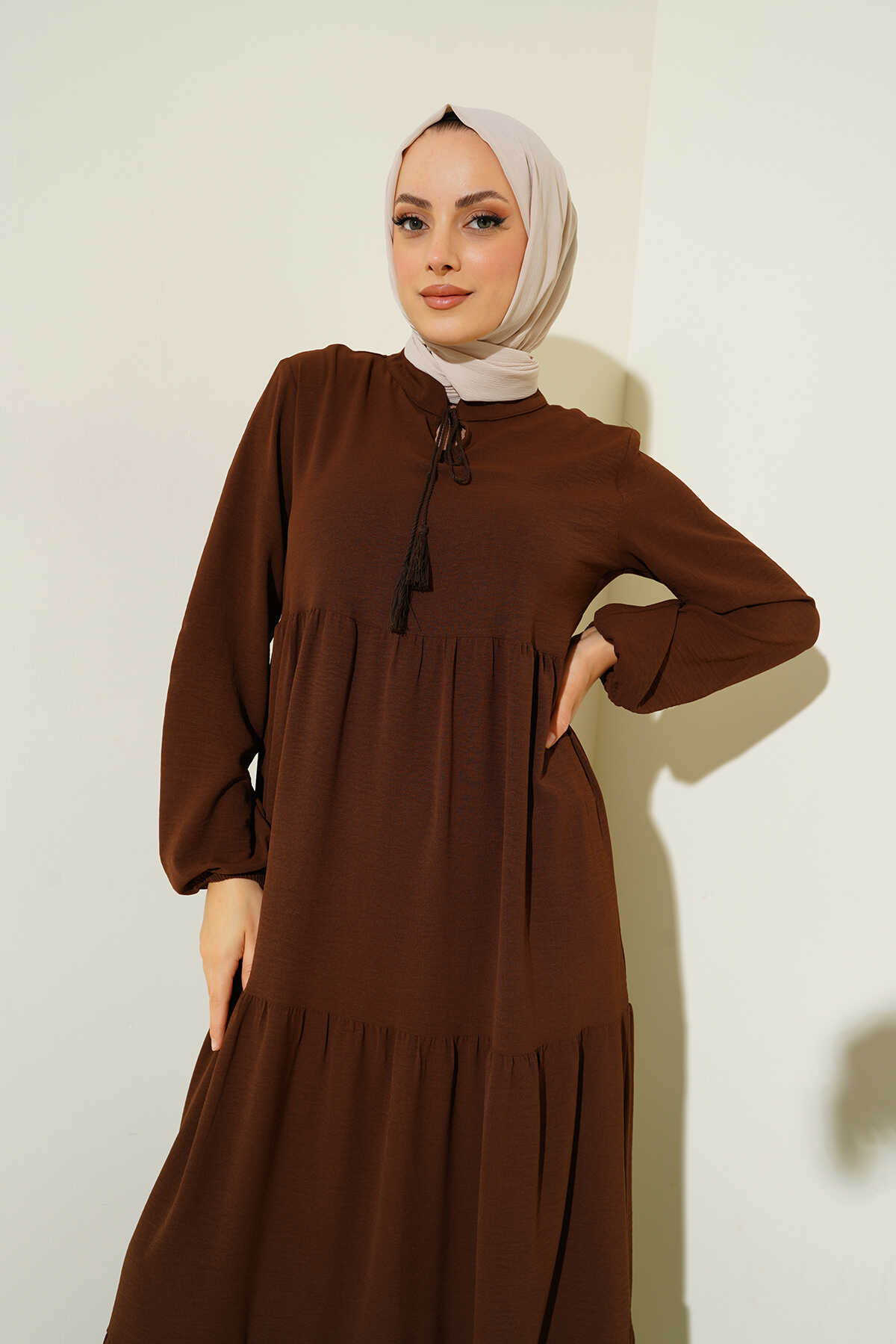 1627 Yaka Bağcıklı Tesettür Elbise - E. Kahve