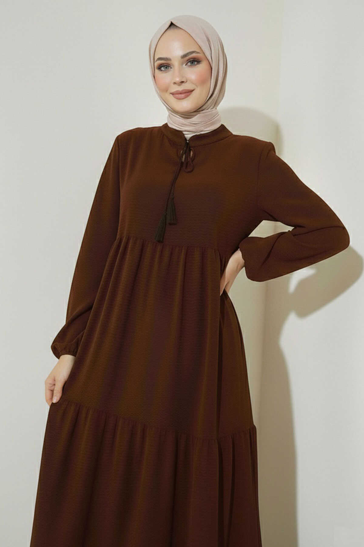 1627 Yaka Bağcıklı Tesettür Elbise - E. Kahve - Kombin