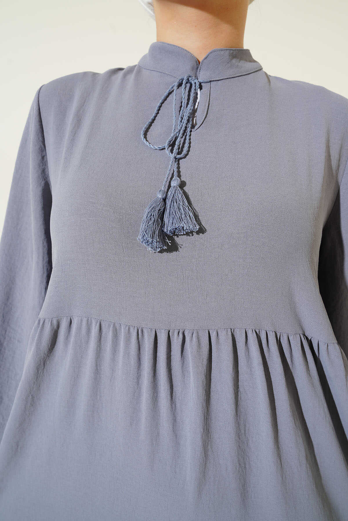 1627 Yaka Bağcıklı Tesettür Elbise - Gri