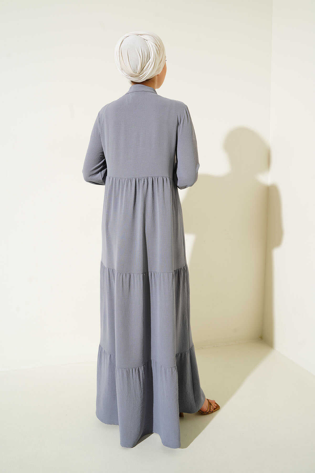 1627 Yaka Bağcıklı Tesettür Elbise - Gri - Kombin