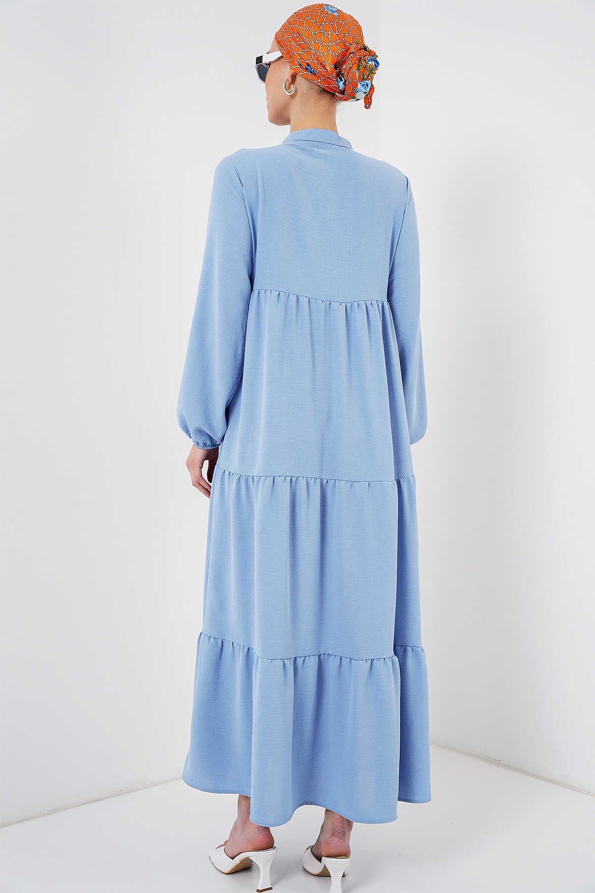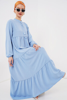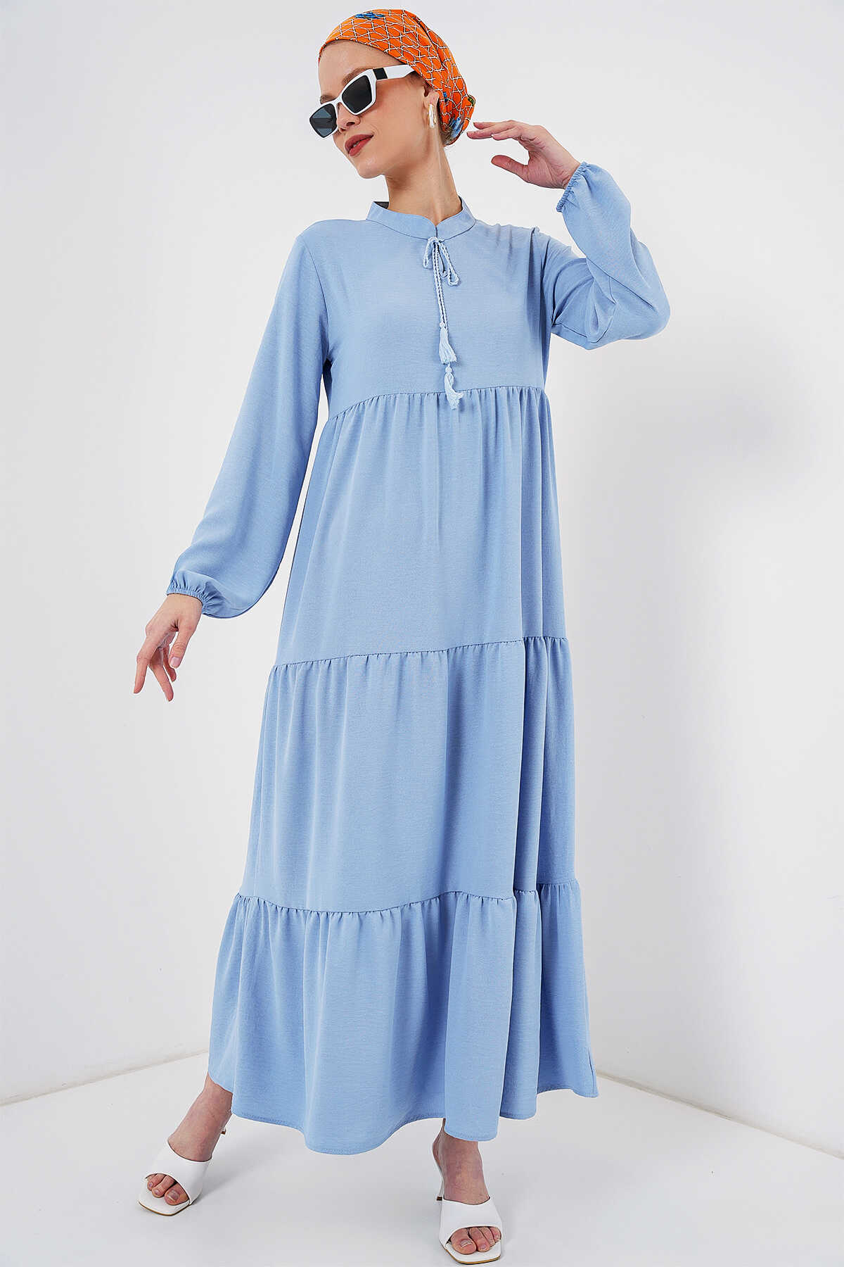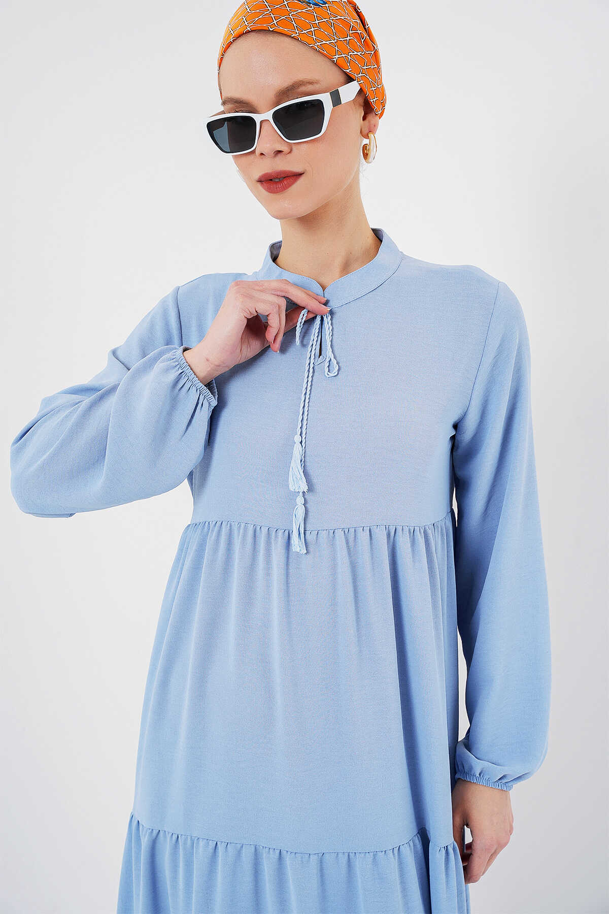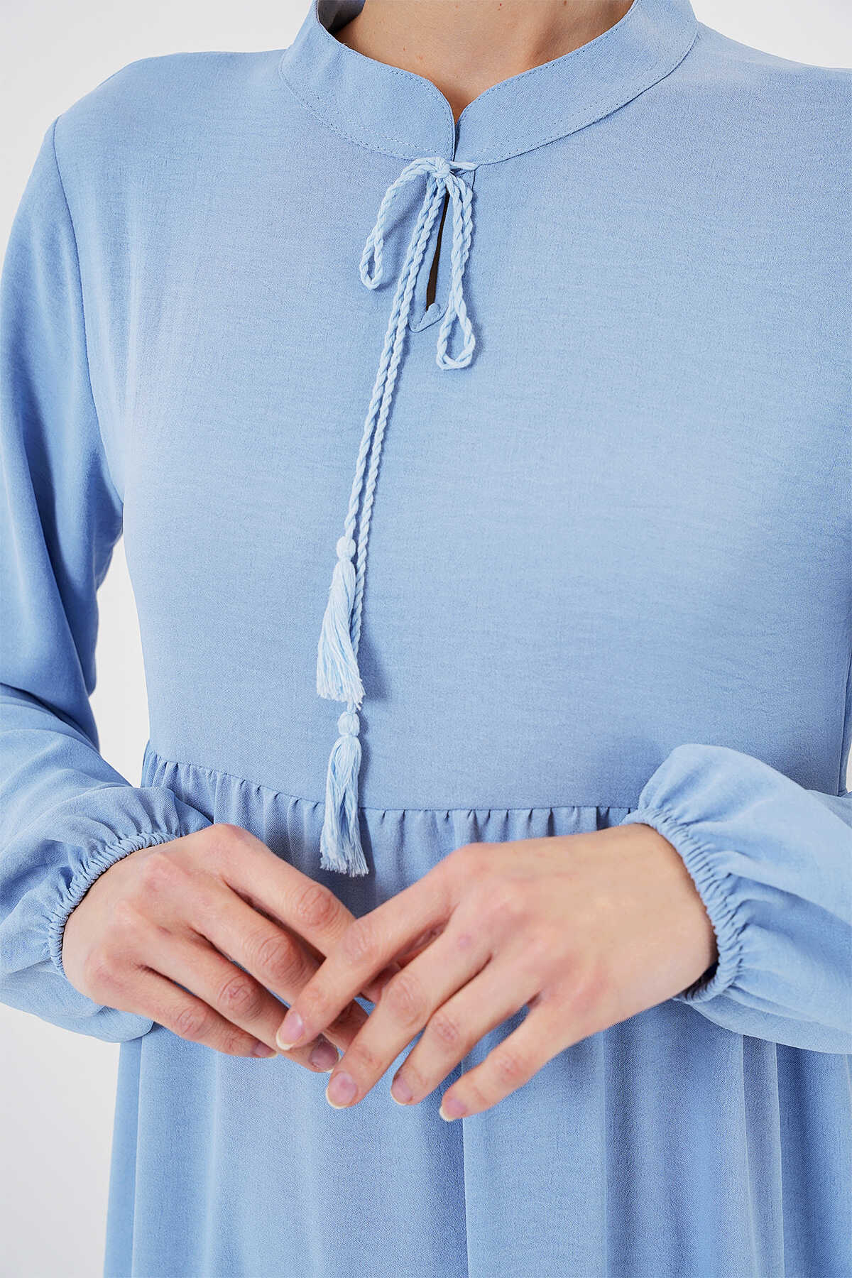 1627 Yaka Bağcıklı Tesettür Elbise - Koyu Mavi