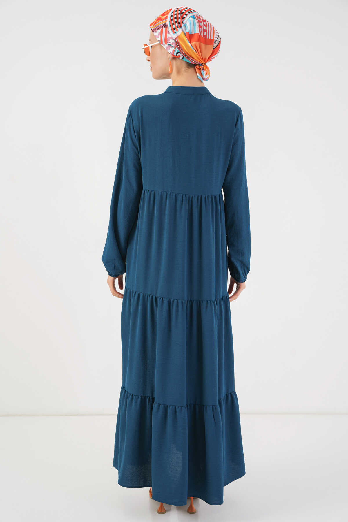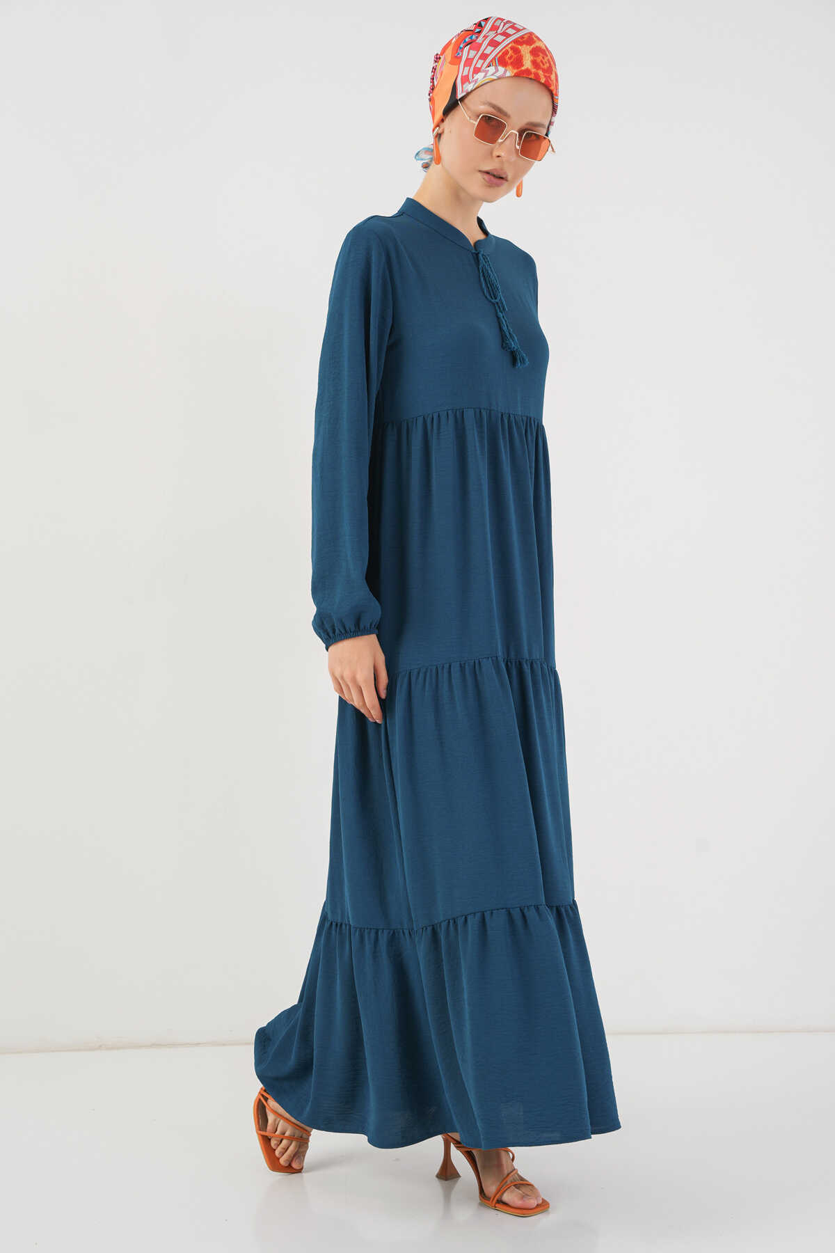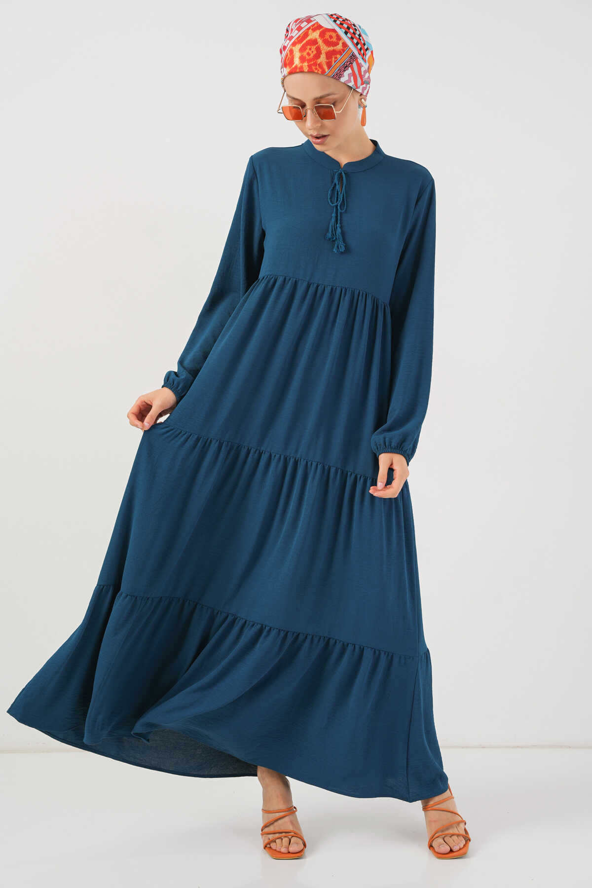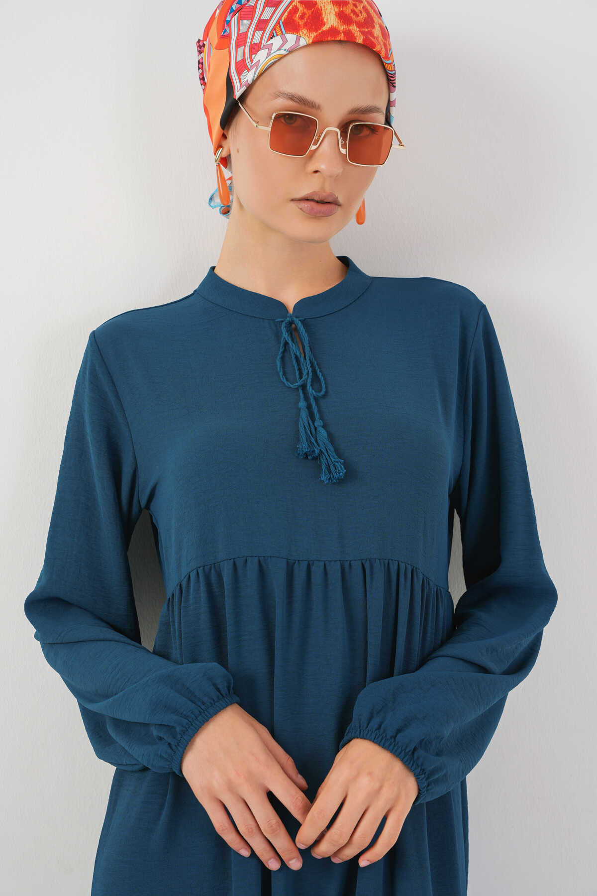 1627 Yaka Bağcıklı Tesettür Elbise - Petrol - Kombin