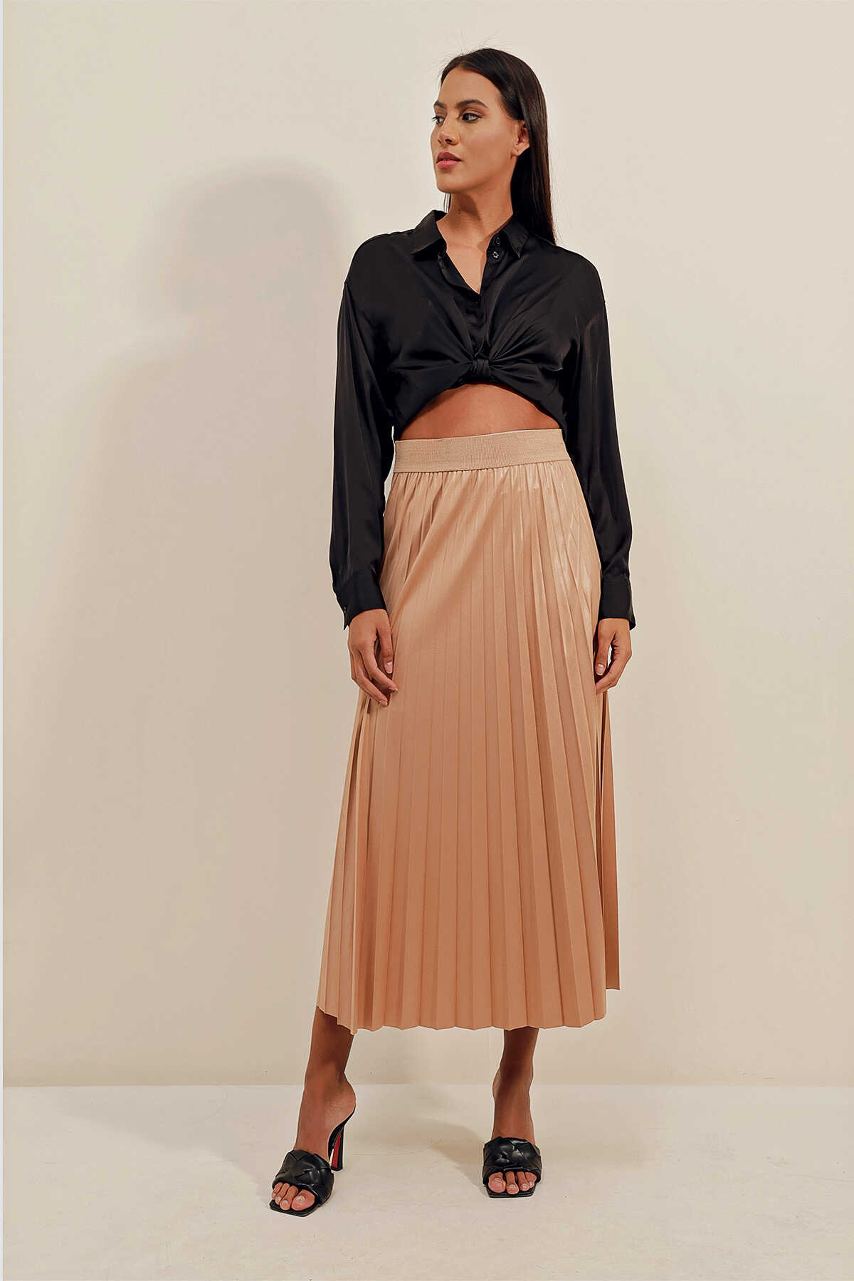 1894 Deri Görünümlü Piliseli Etek - Bej - Kombin