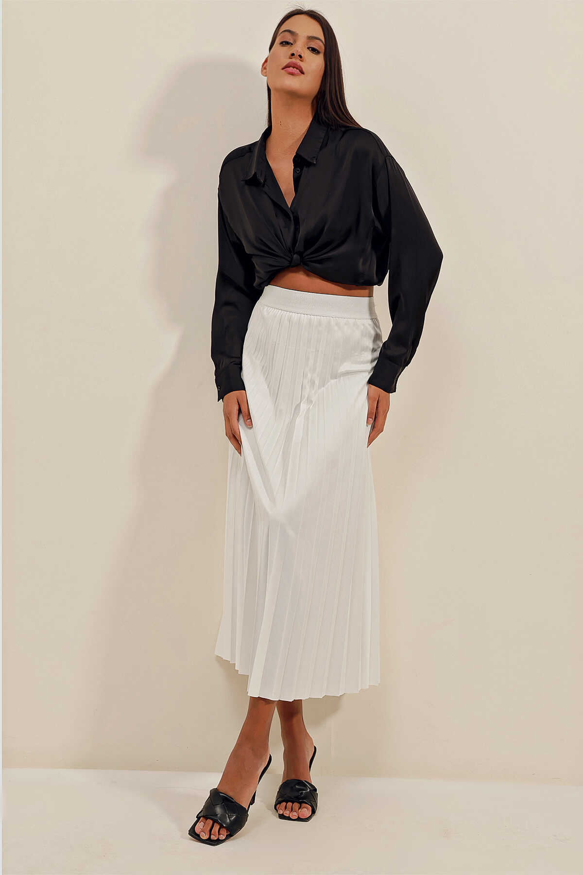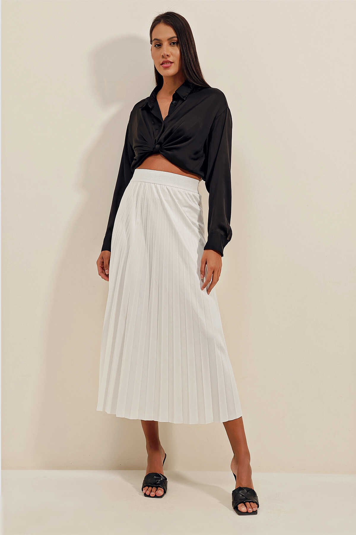 1894 Deri Görünümlü Piliseli Etek - Beyaz - Kombin