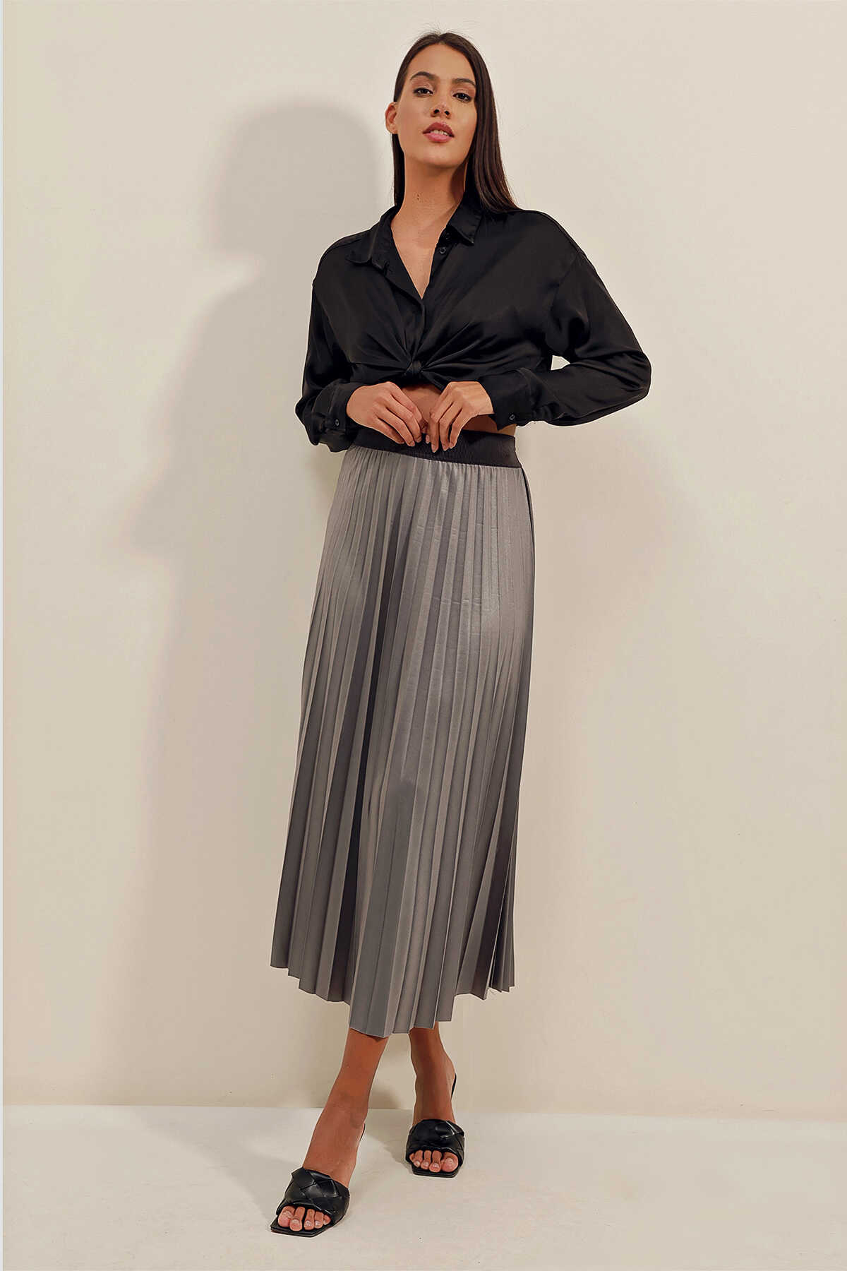 1894 Deri Görünümlü Piliseli Etek - Gri - Kombin