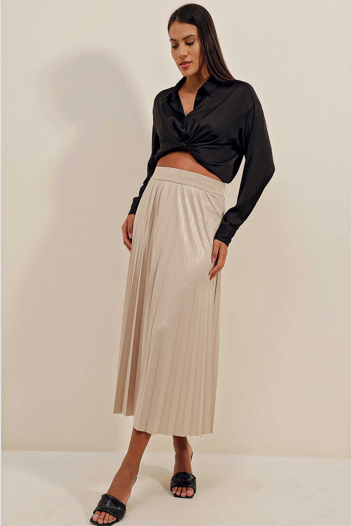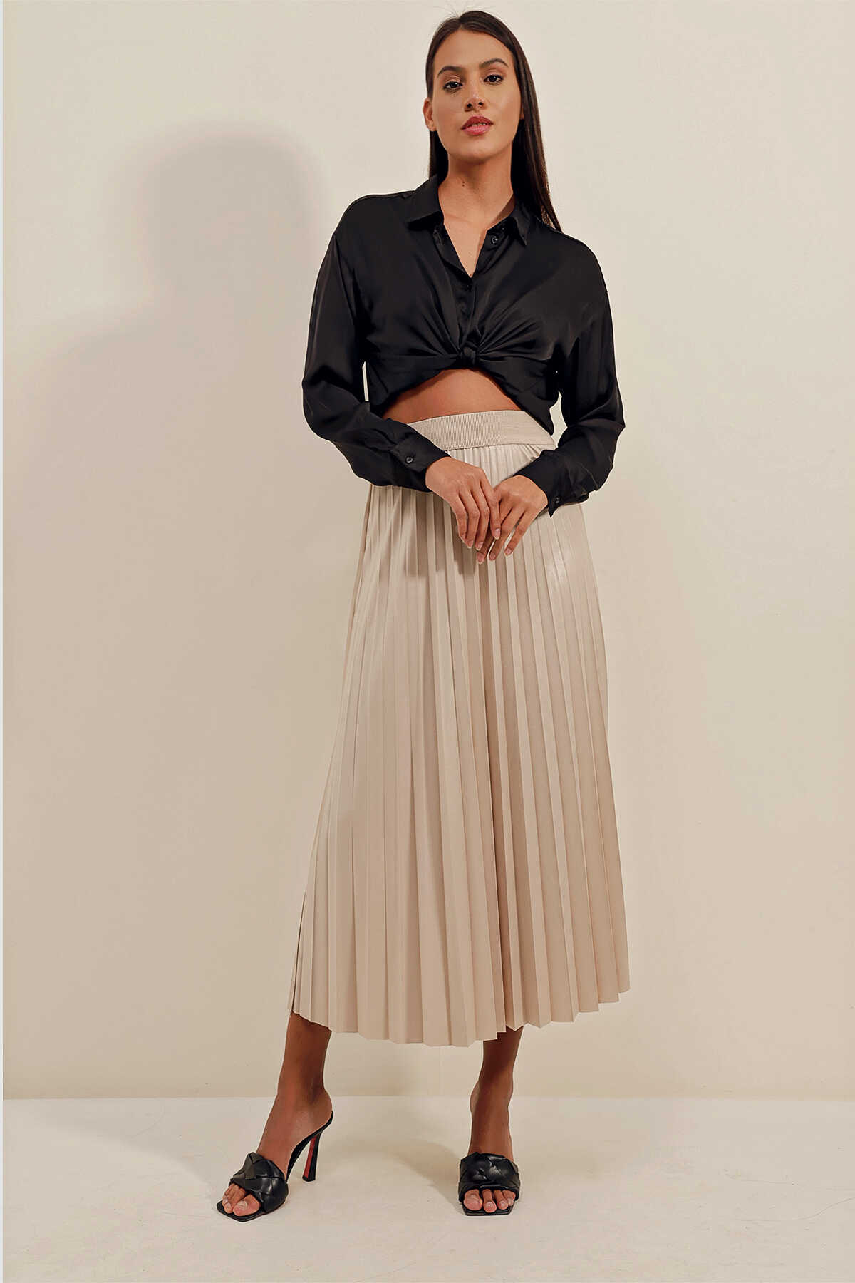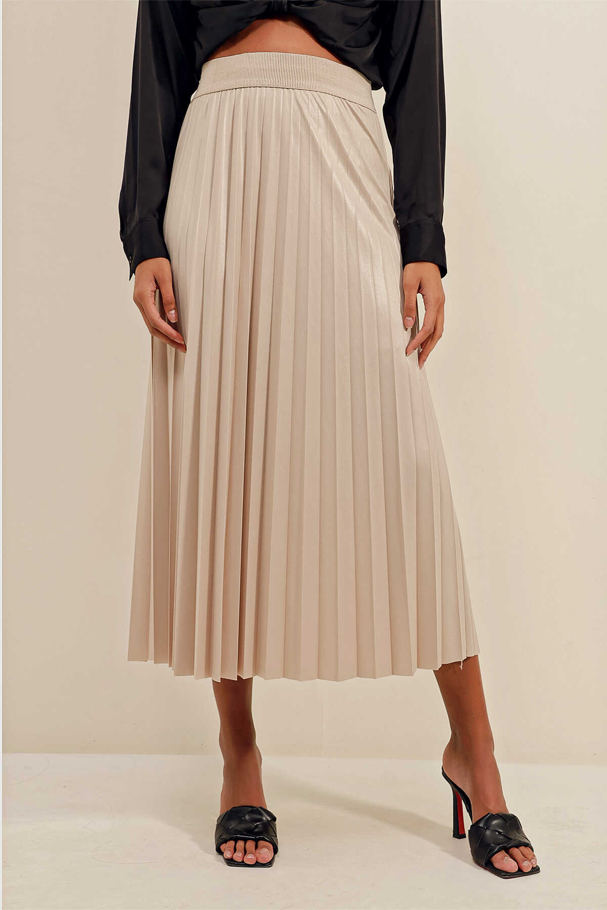 1894 Deri Görünümlü Piliseli Etek - Krem - Kombin
