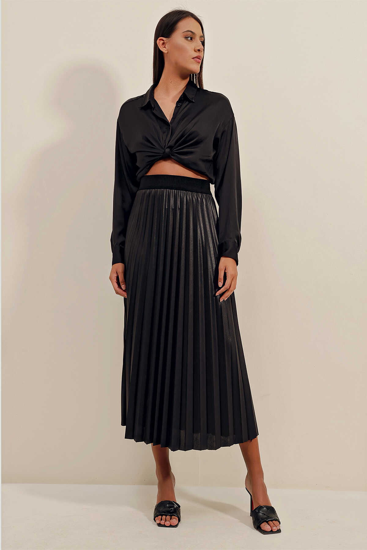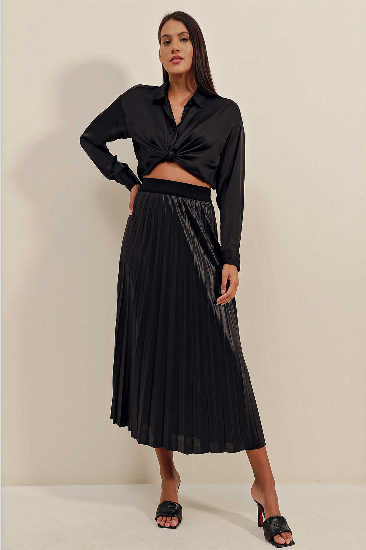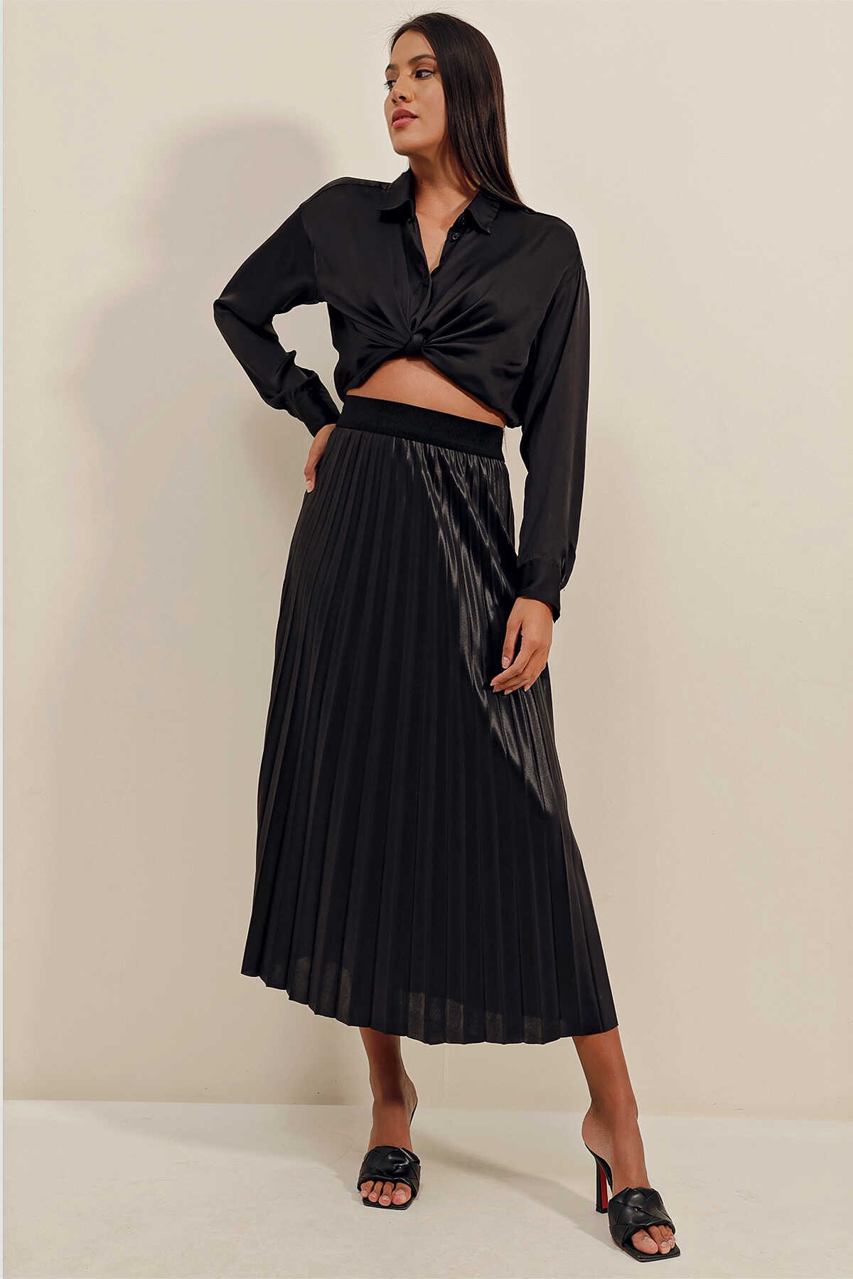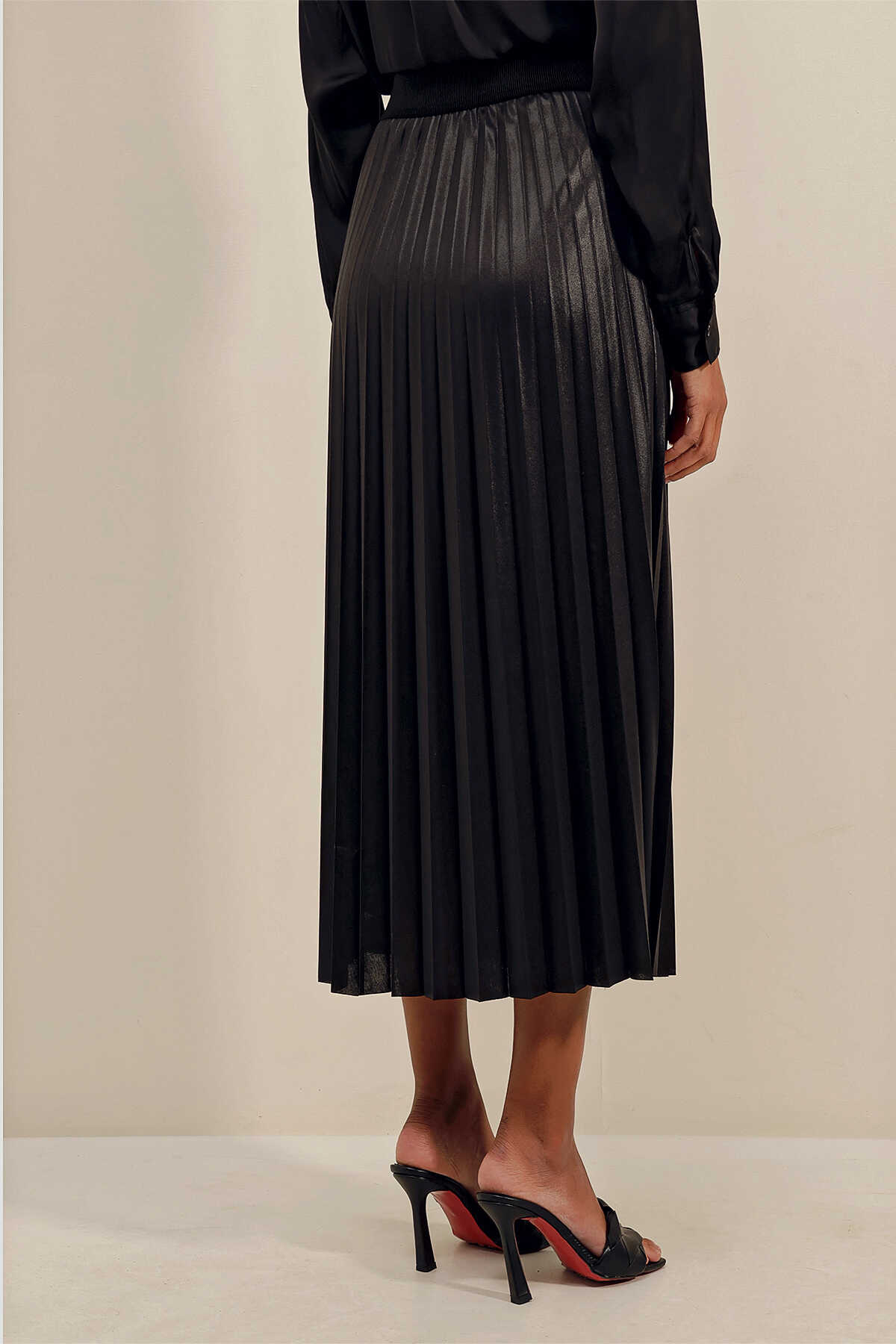 1894 Deri Görünümlü Piliseli Etek - Siyah