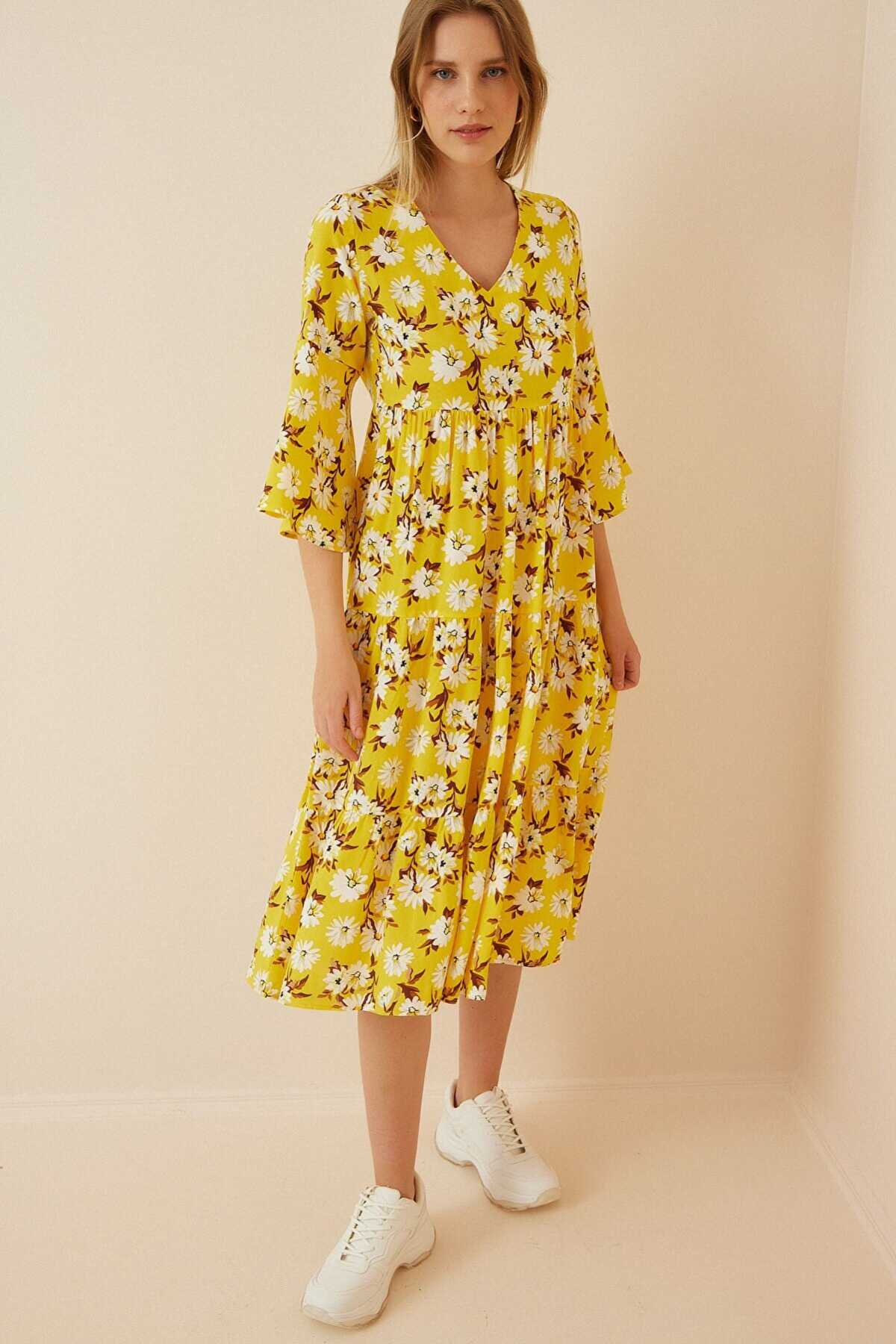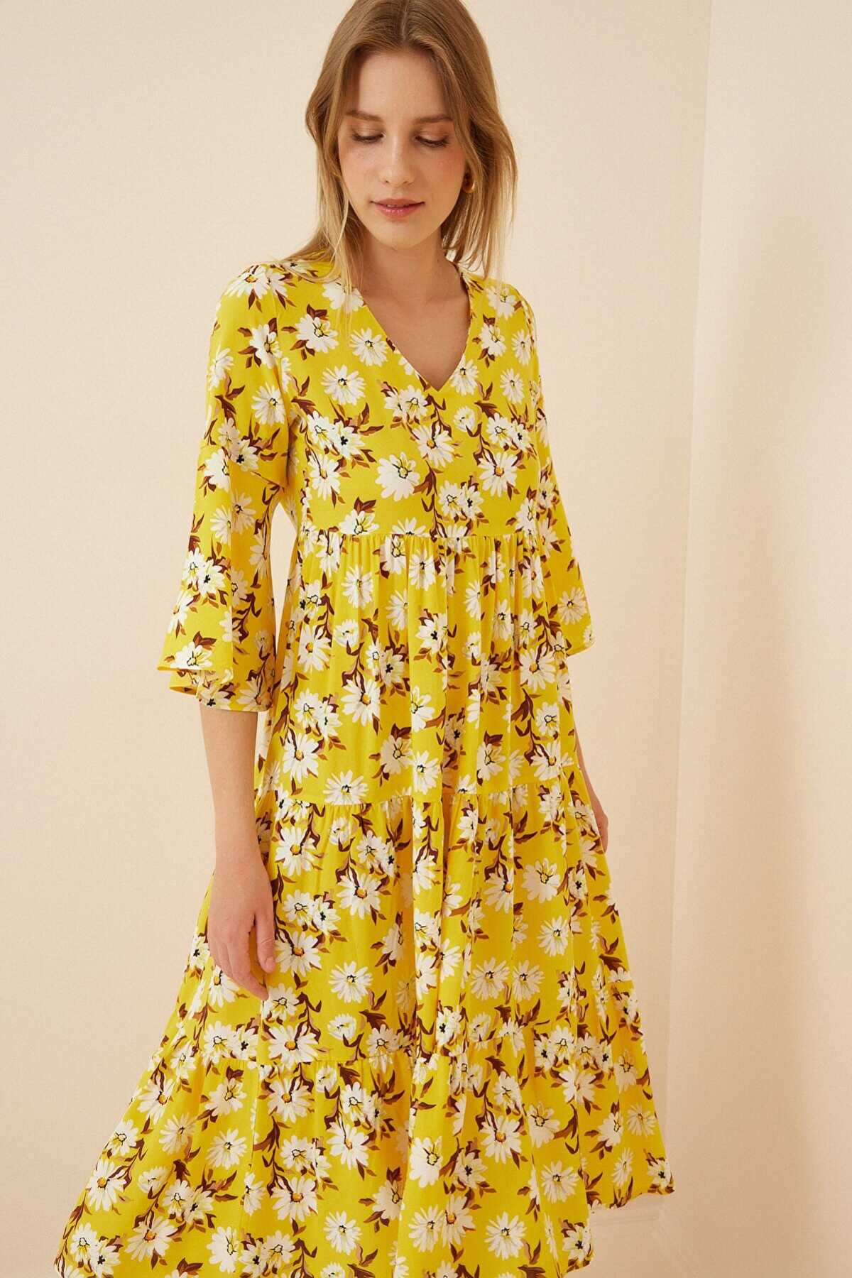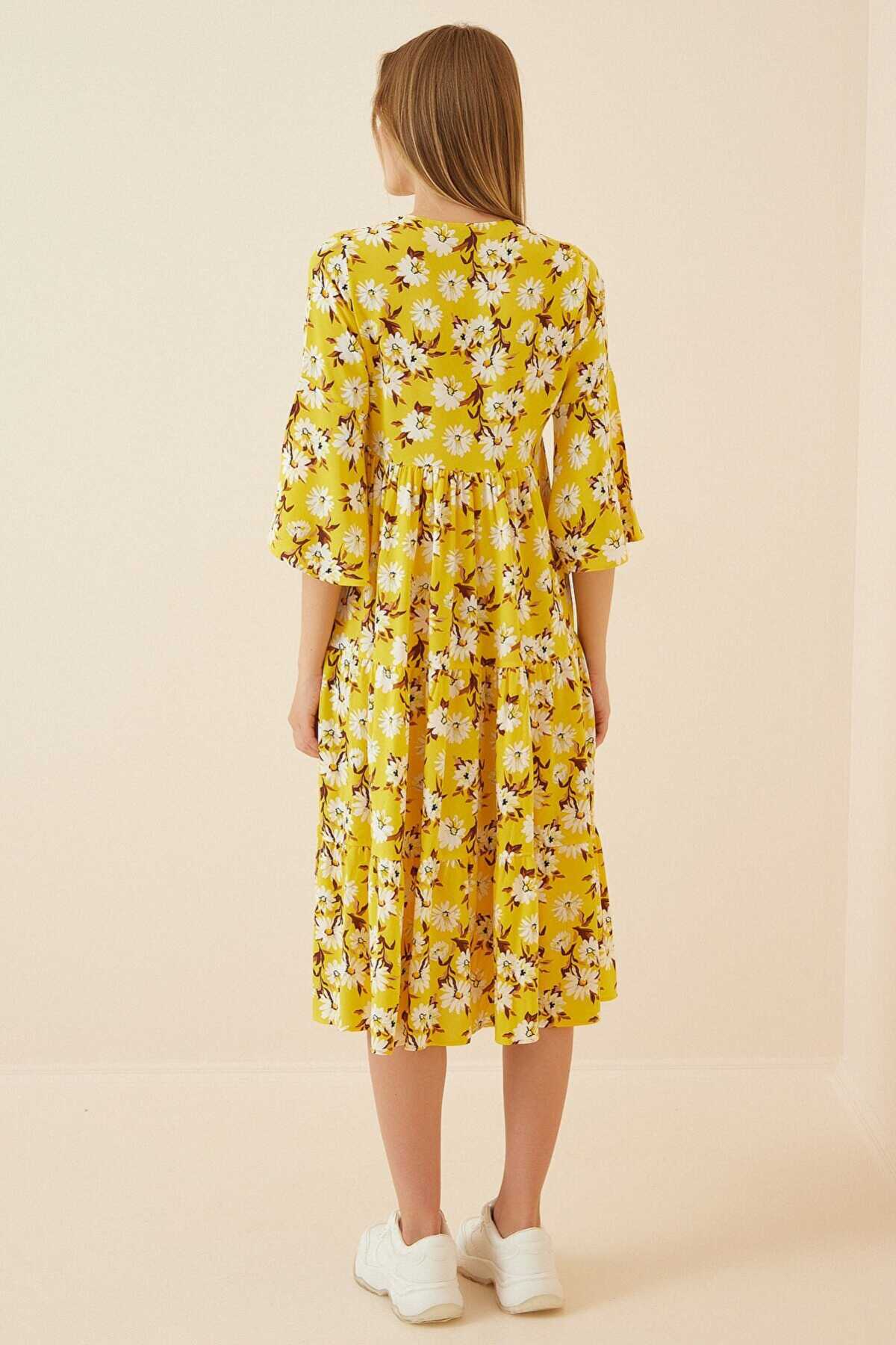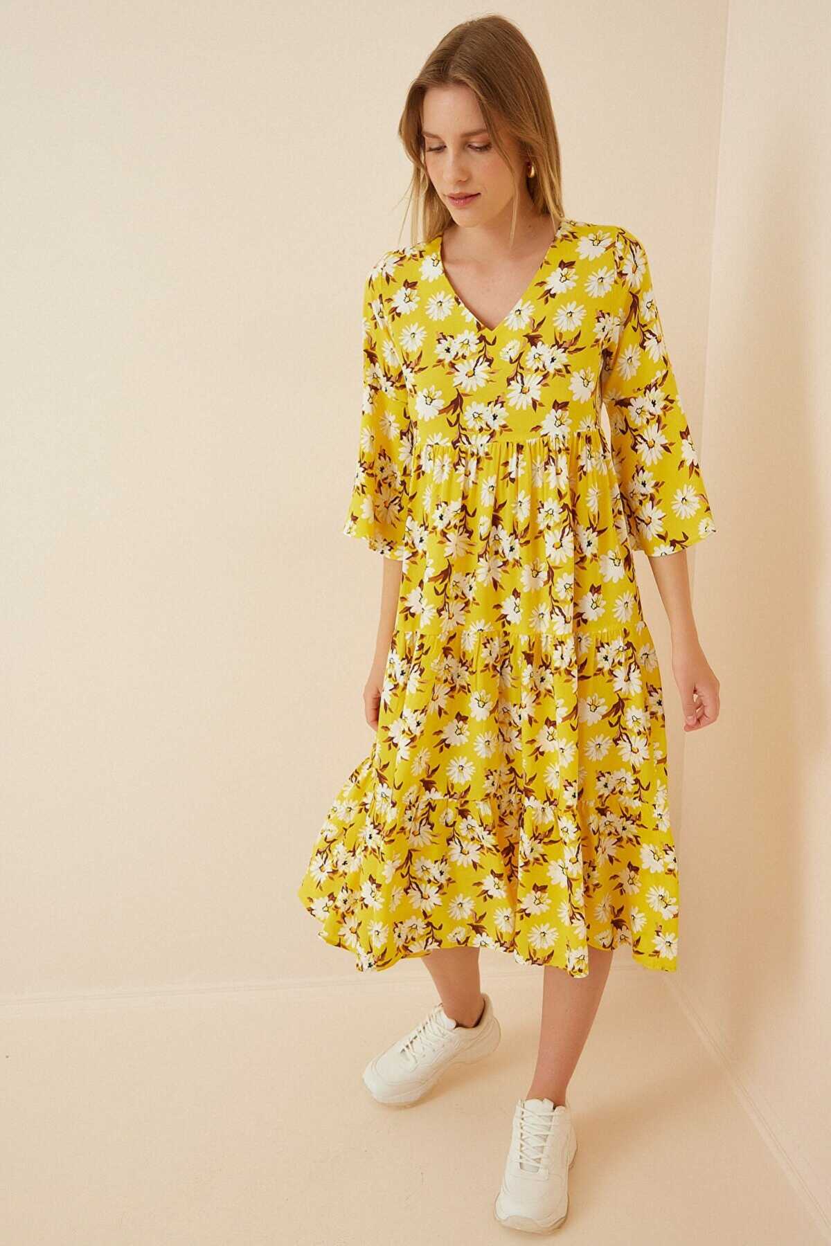 1959 Desenli Viskon Elbise - B.Sarı - Kombin