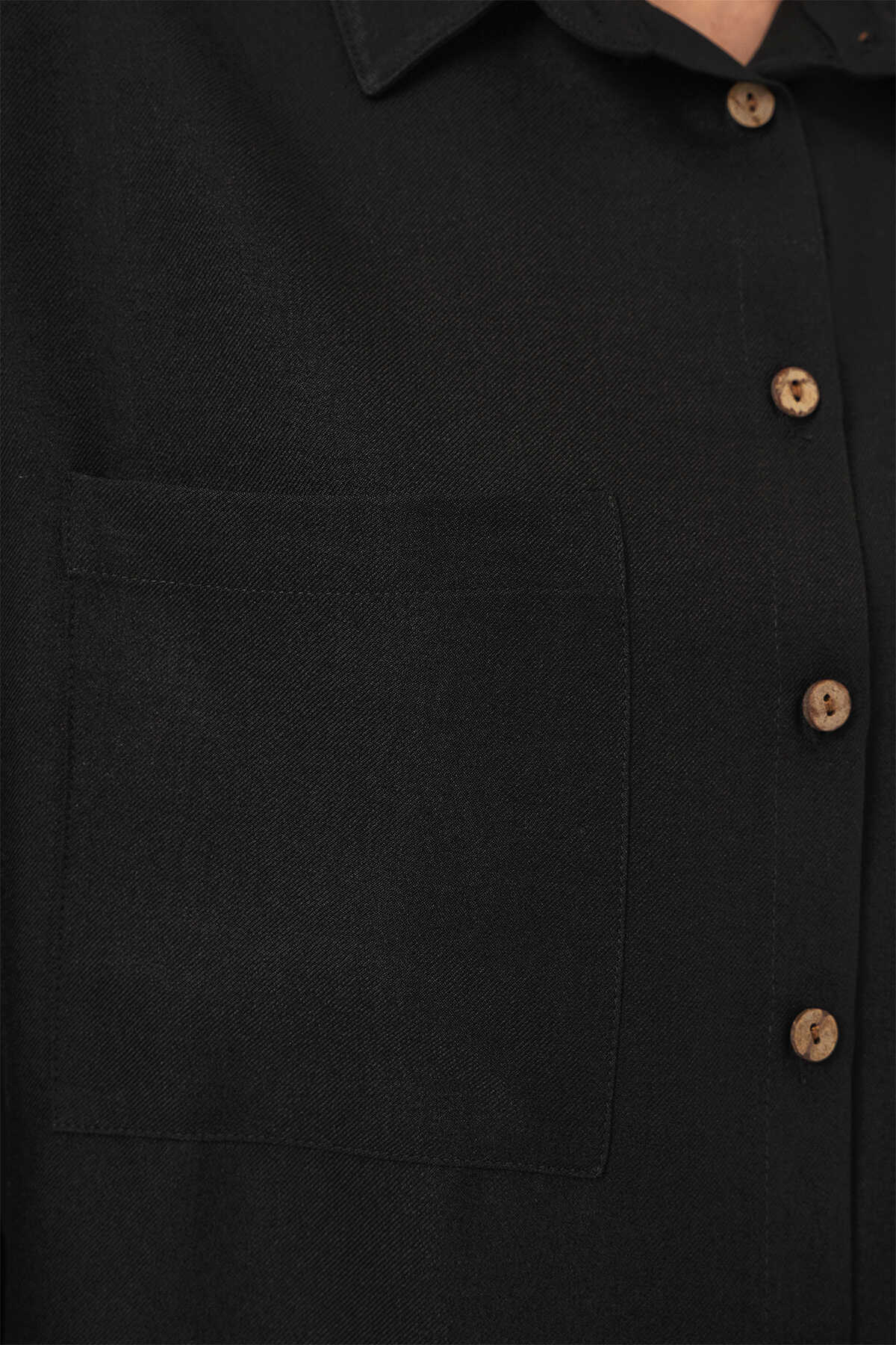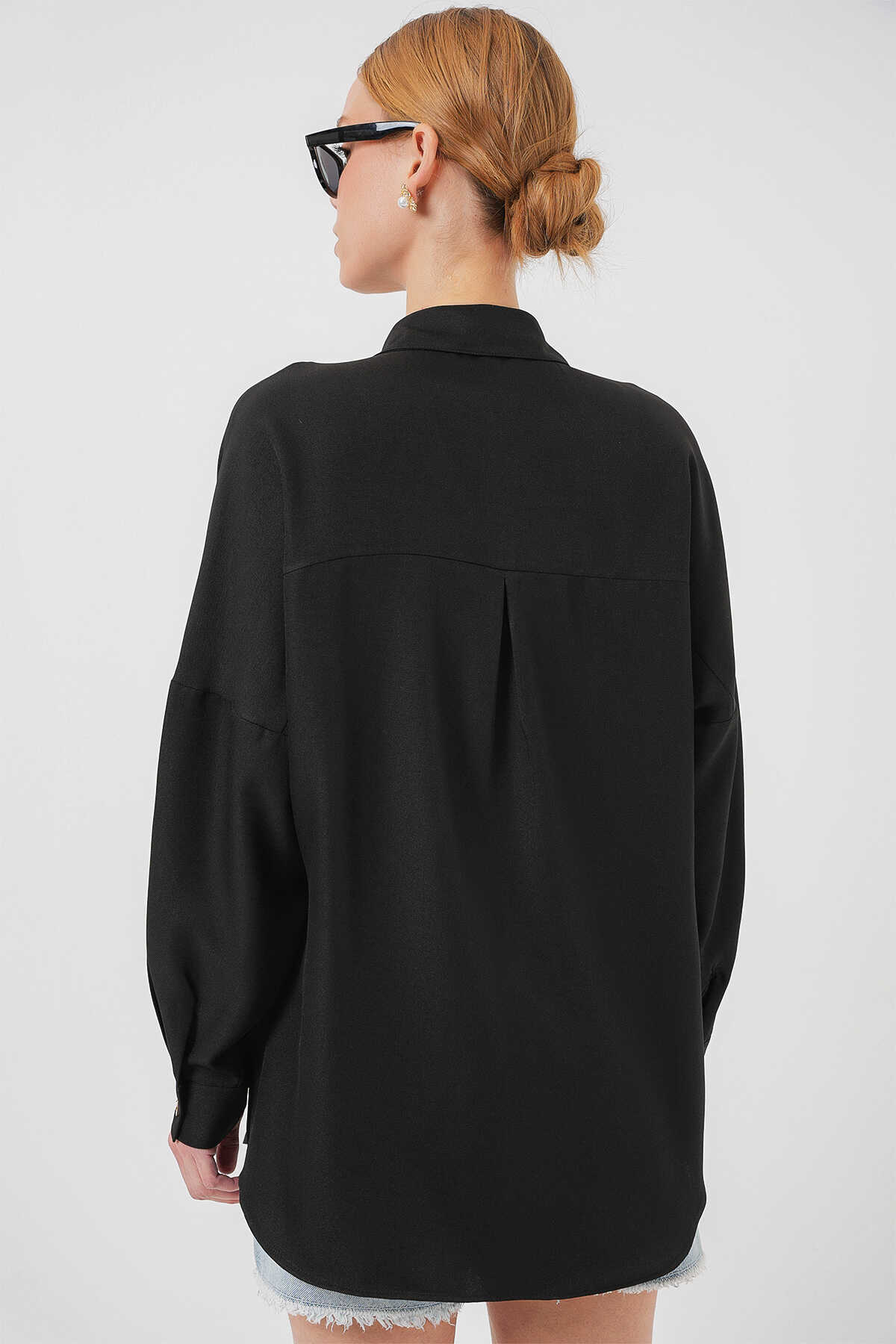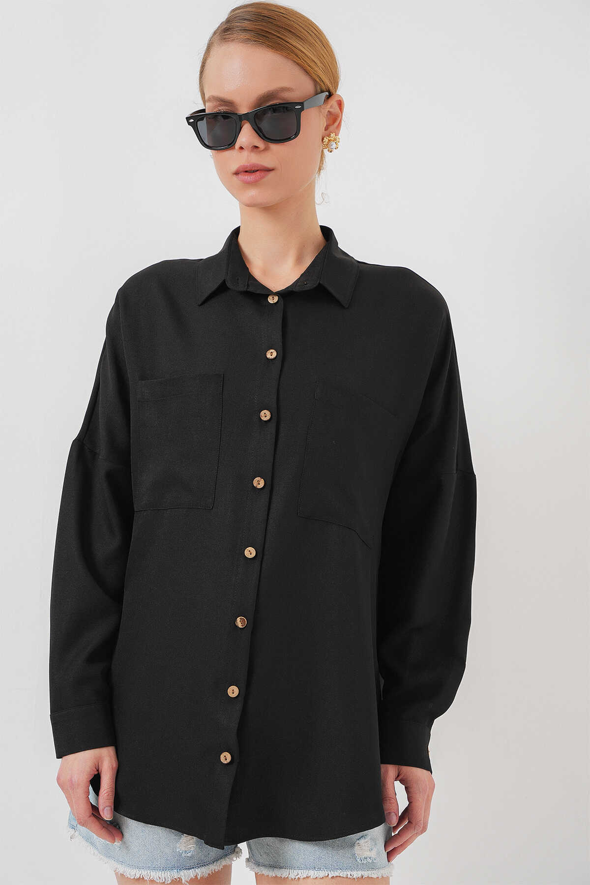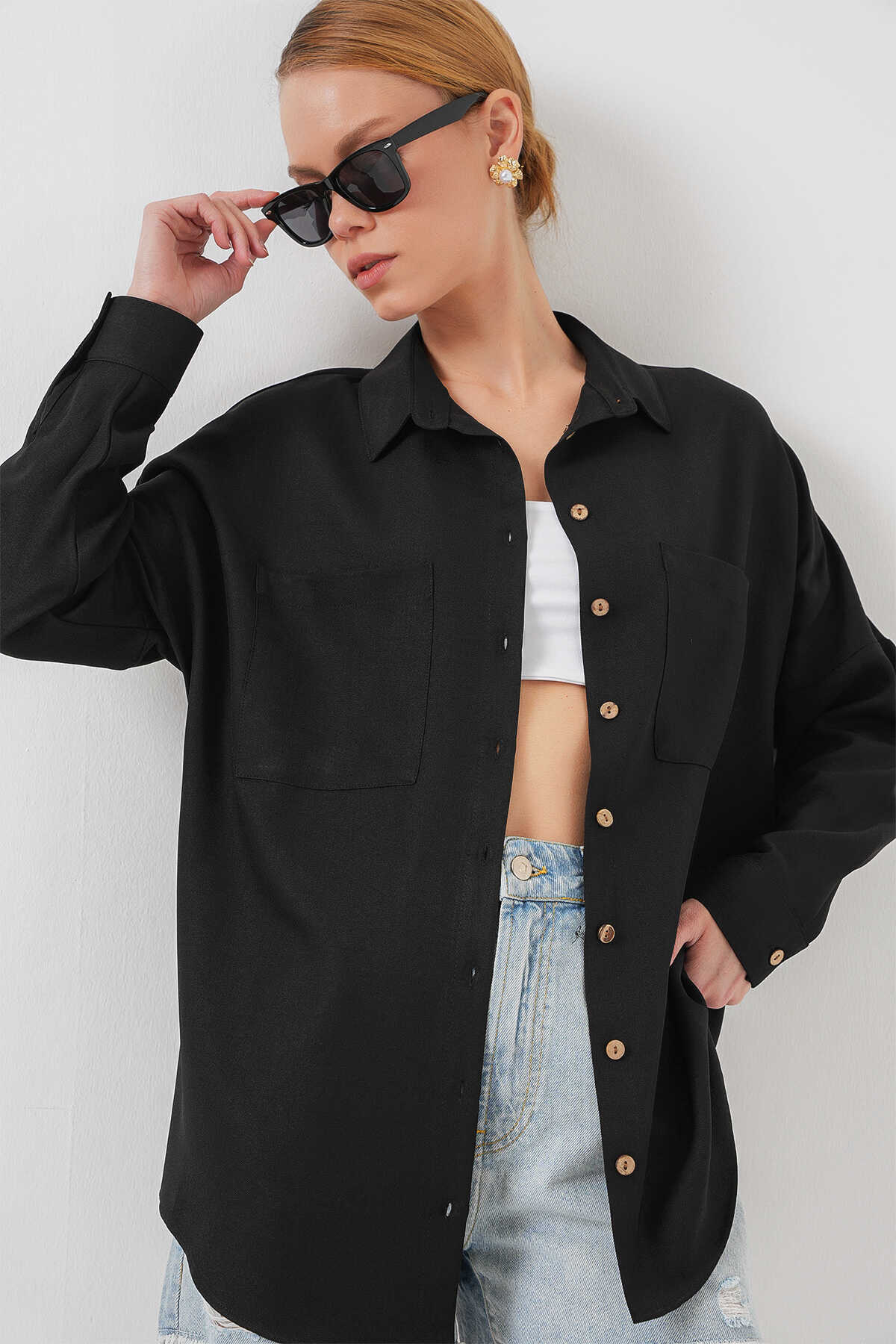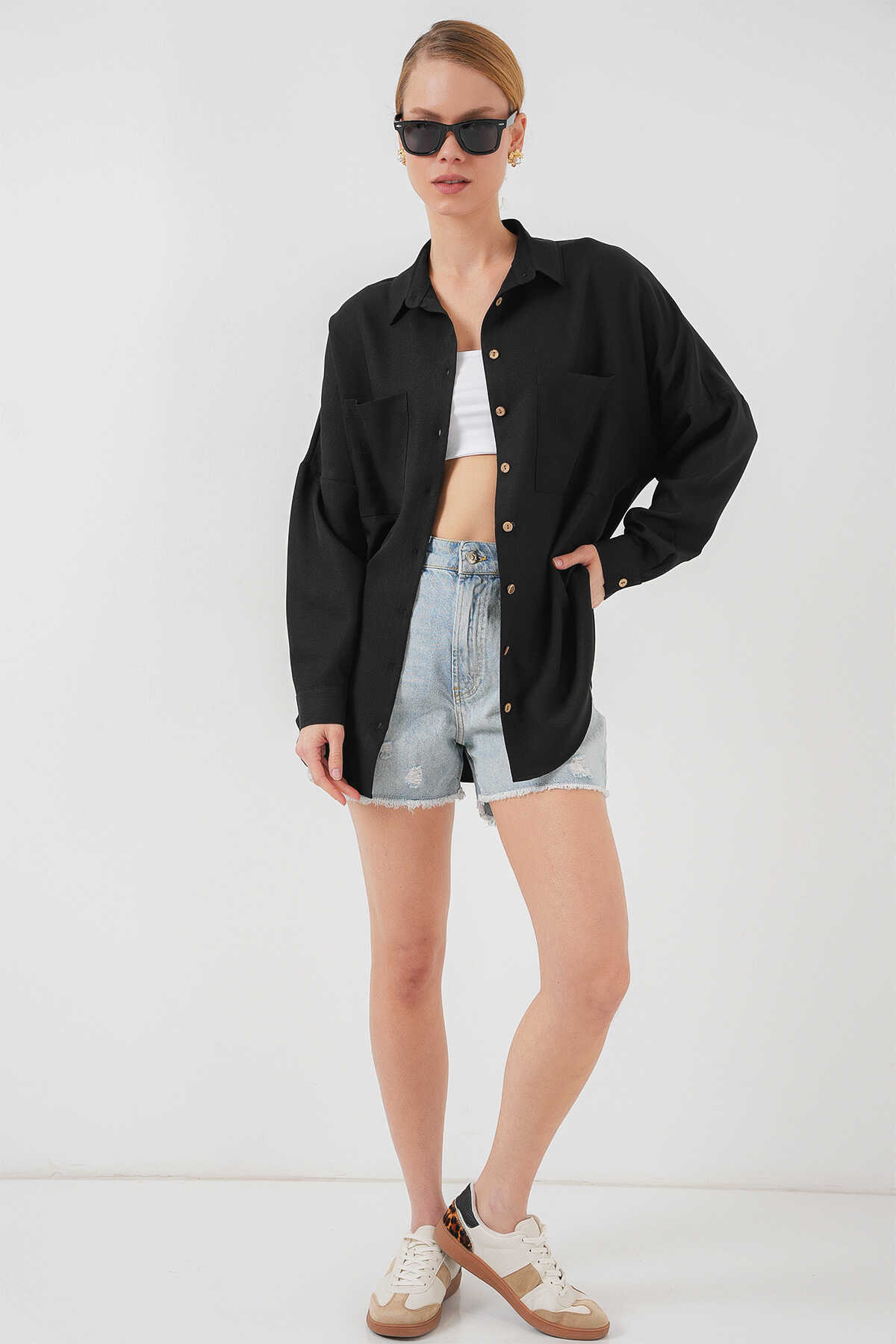 20126 Oversize Keten Gömlek - Siyah - Kombin