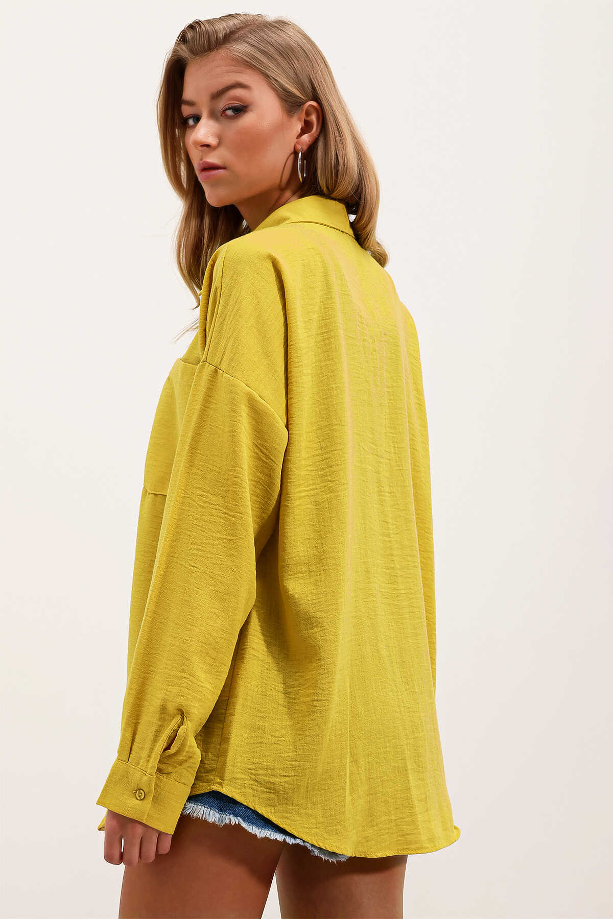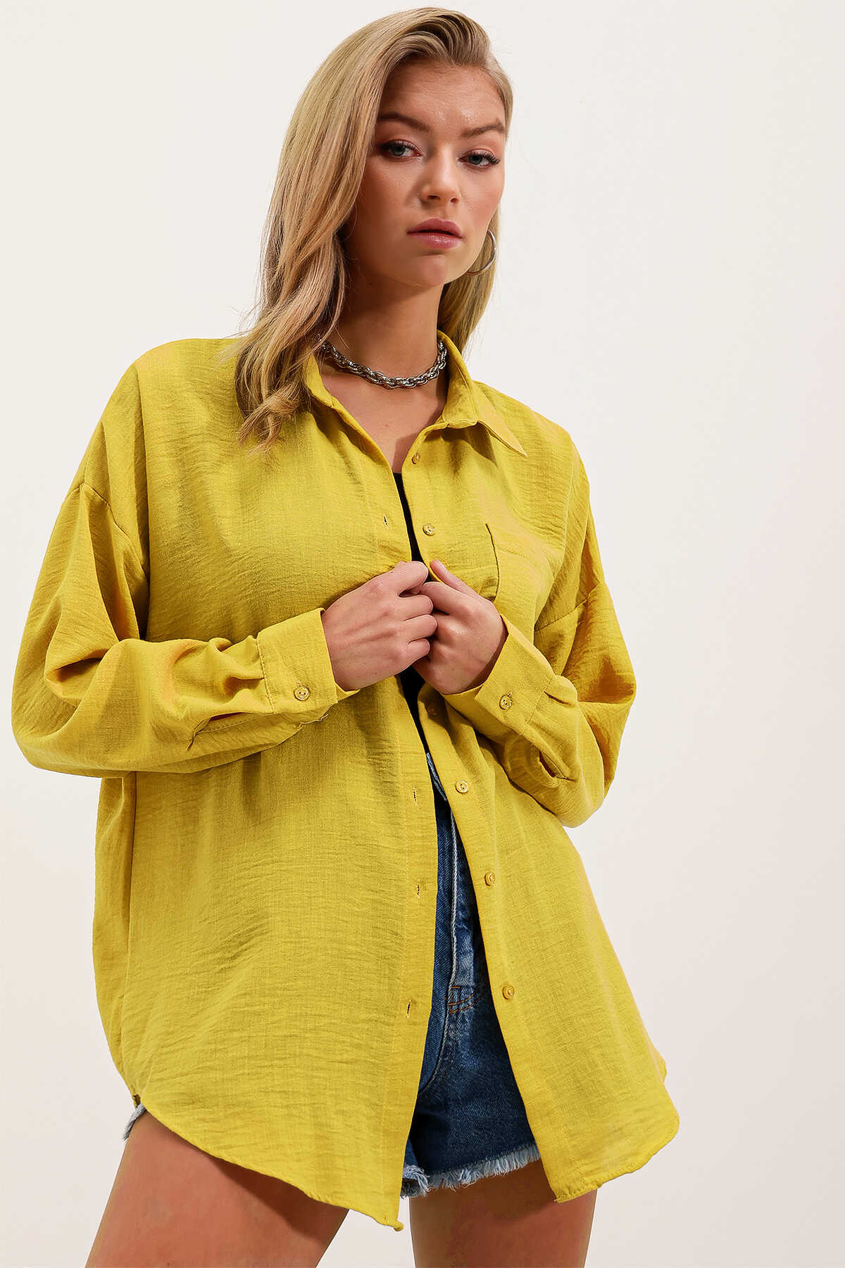 20153 Tek Cepli Oversize Keten Gömlek - Hardal - Kombin