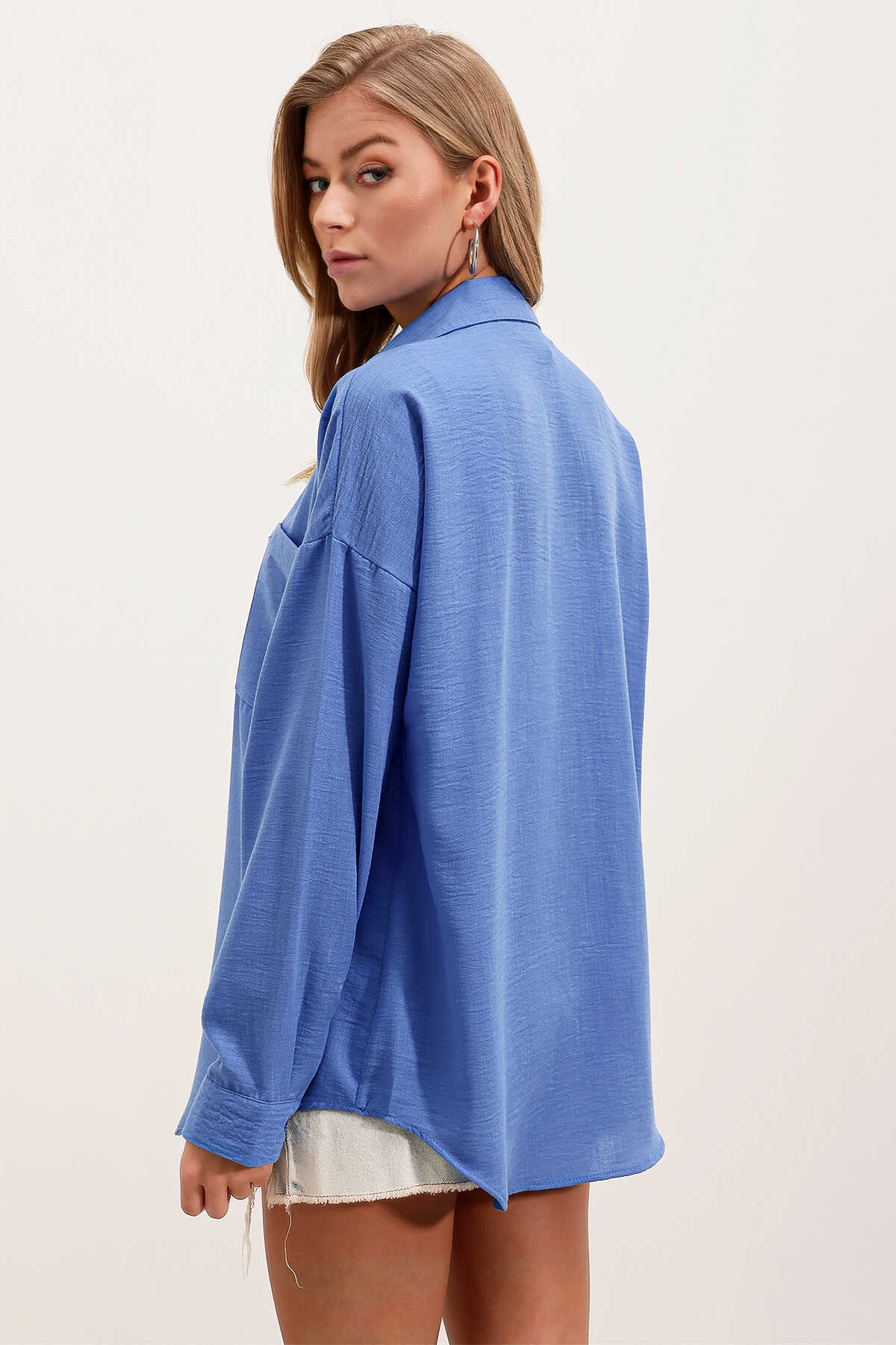 20153 Tek Cepli Oversize Keten Gömlek - Saks - Kombin