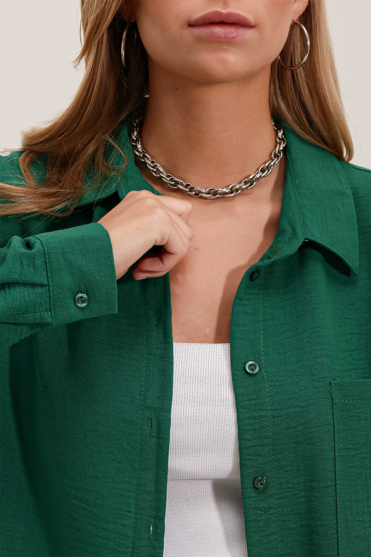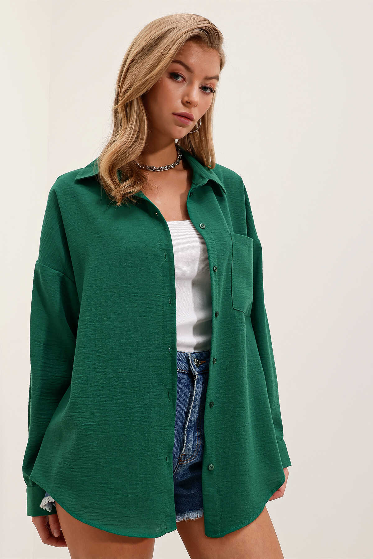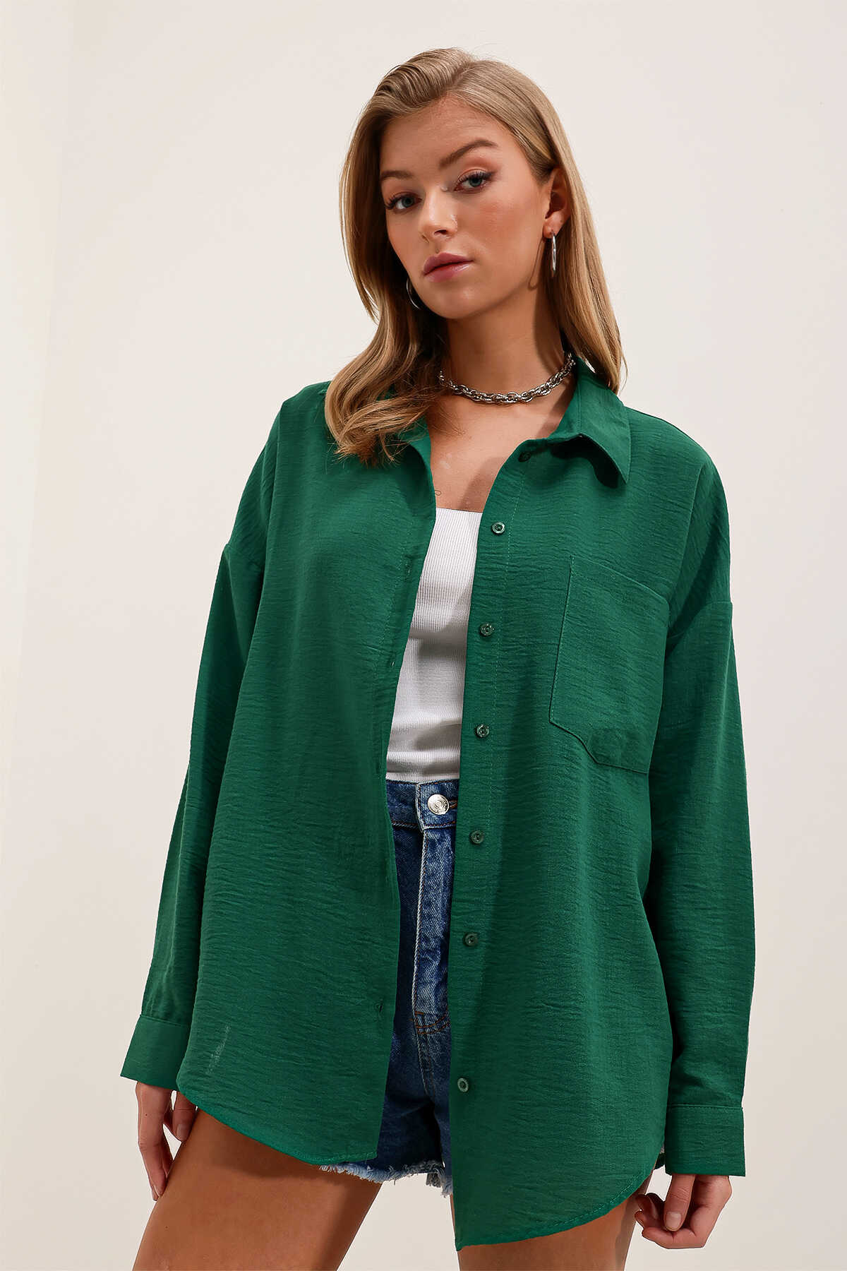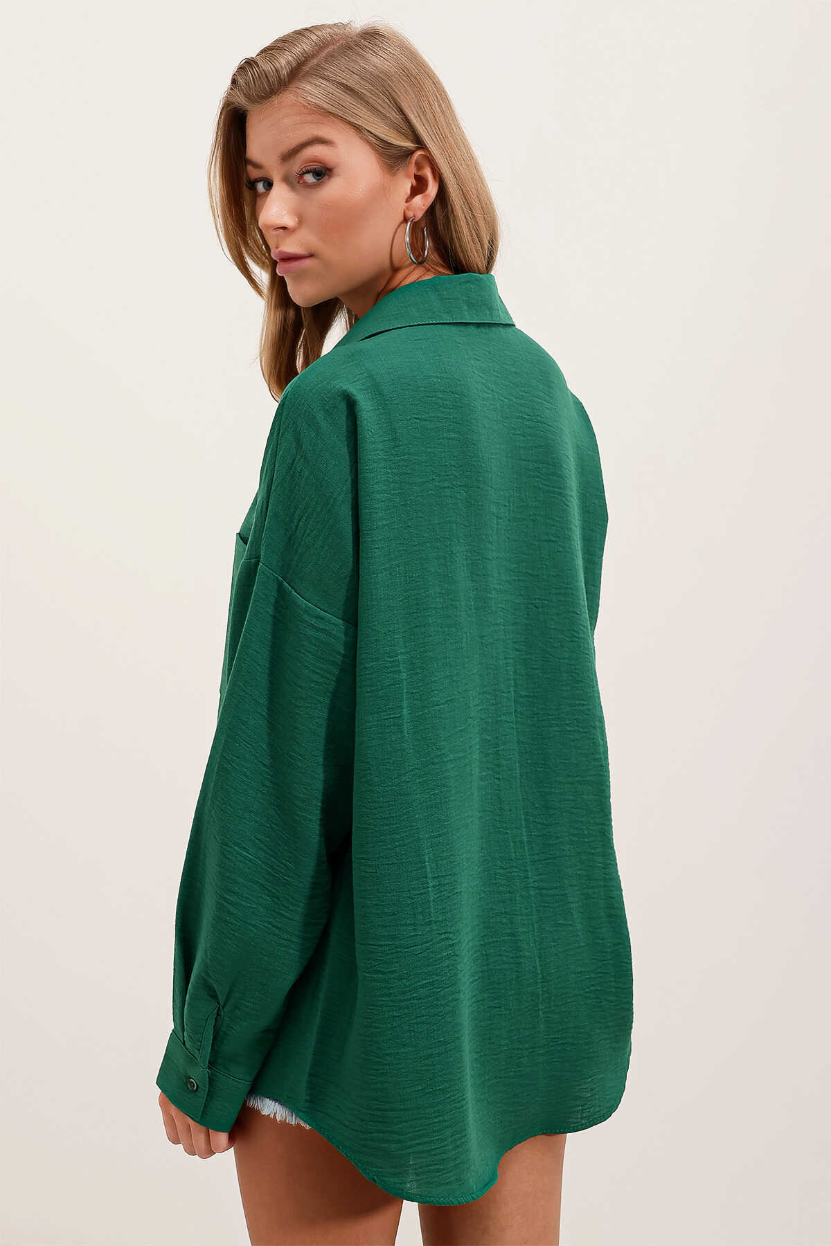 20153 Tek Cepli Oversize Keten Gömlek - Zümrüt Yeşili - Kombin