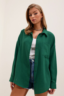20153 Tek Cepli Oversize Keten Gömlek - Zümrüt Yeşili