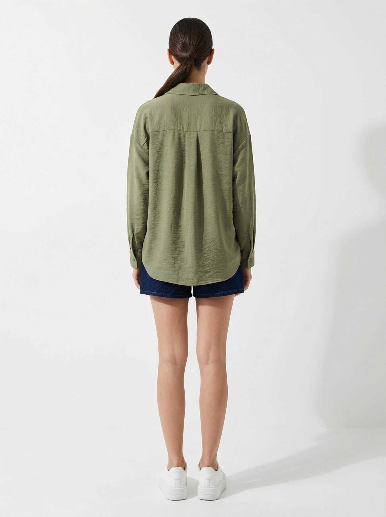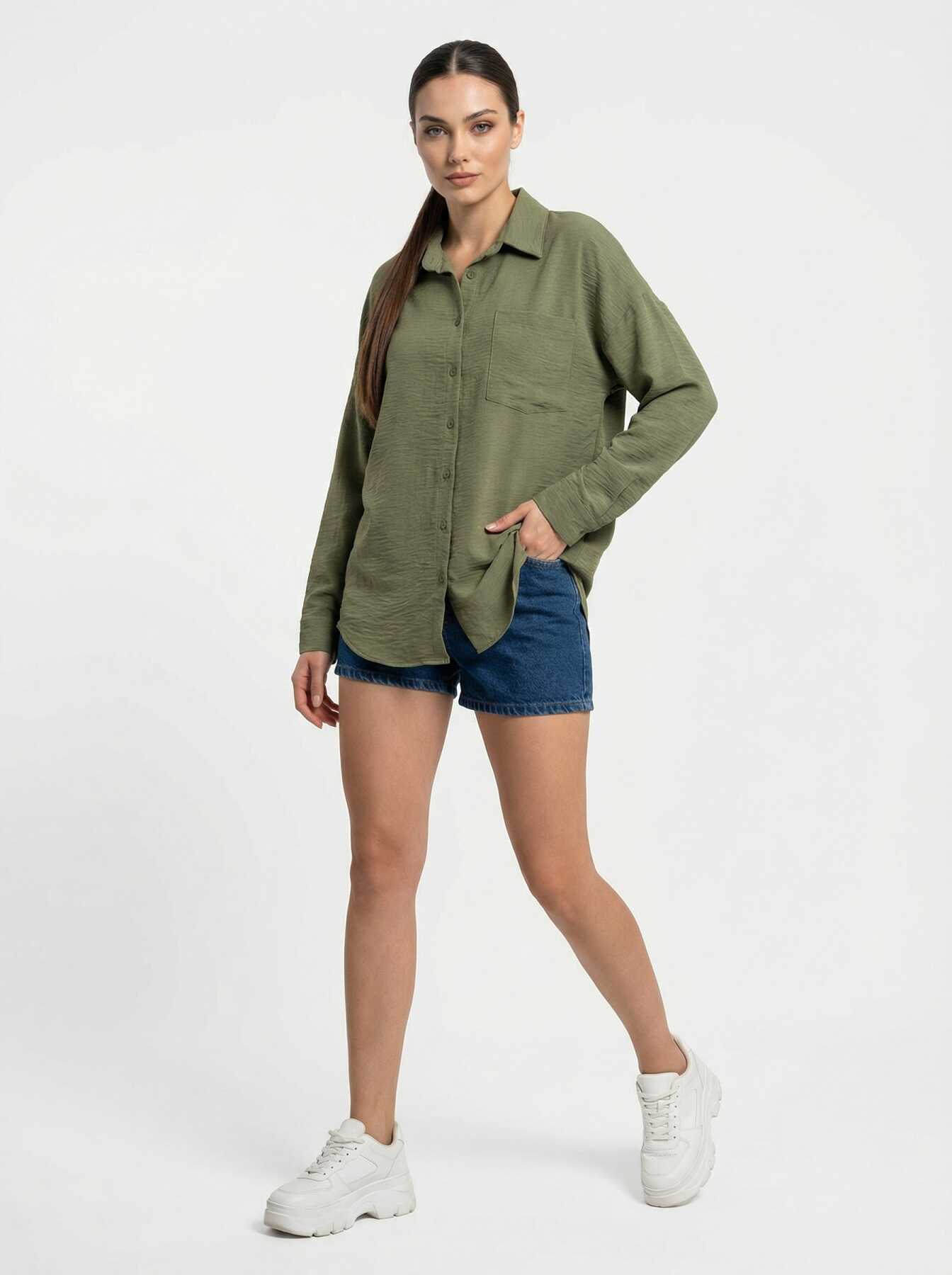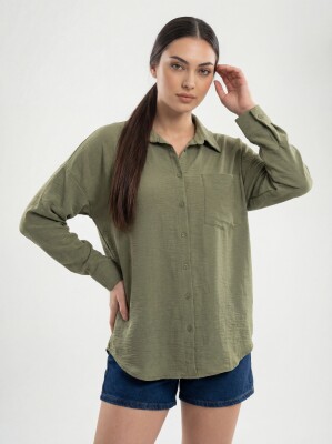 20153 Tek Cepli Oversize Keten Gömlek - A.Haki - Kombin