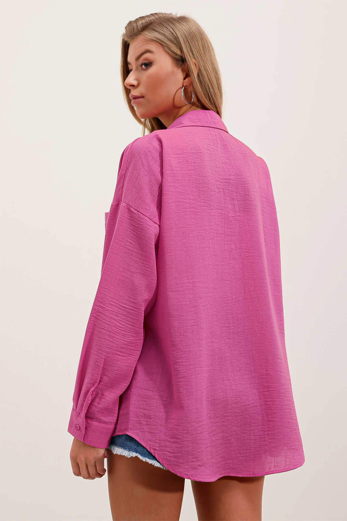 20153 Tek Cepli Oversize Keten Gömlek - A.Fuşya