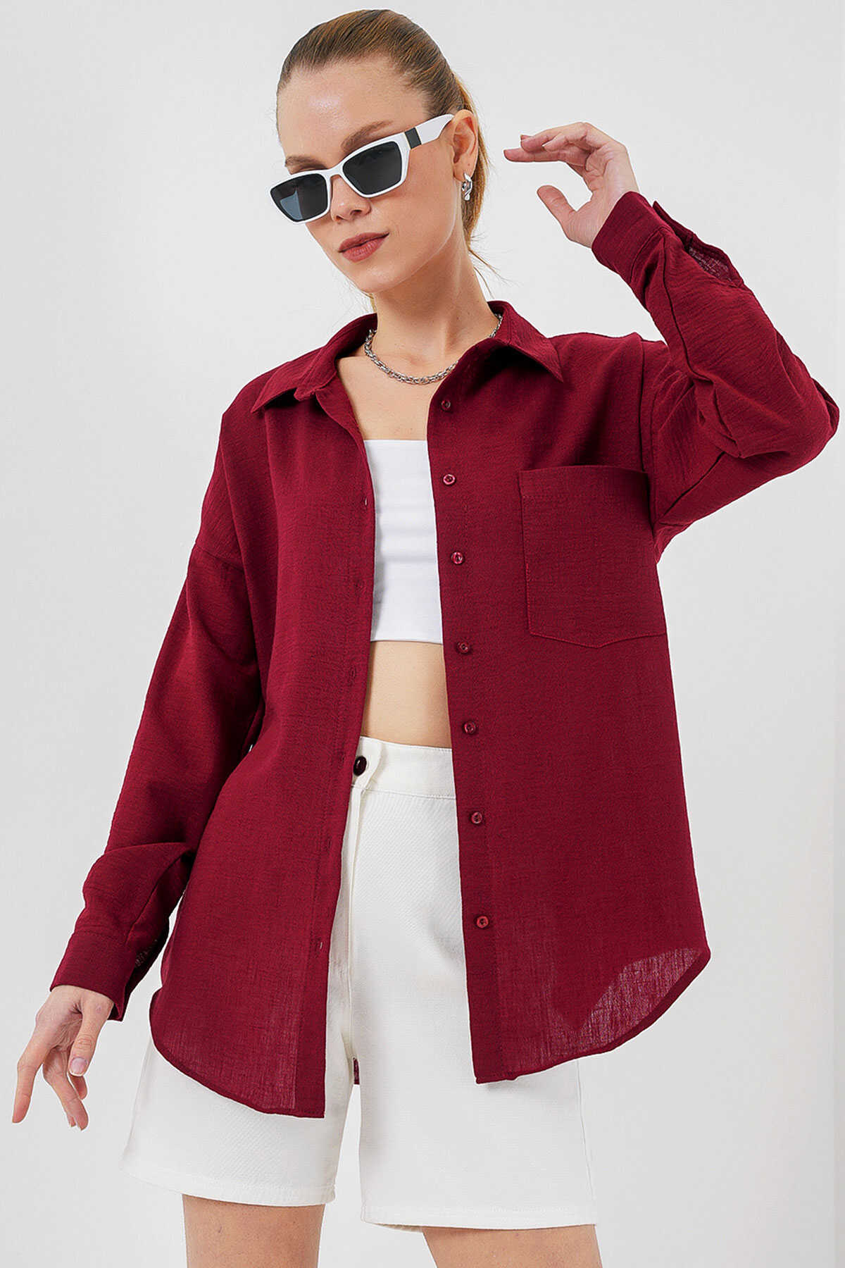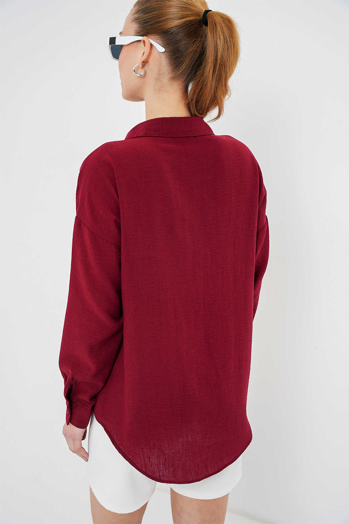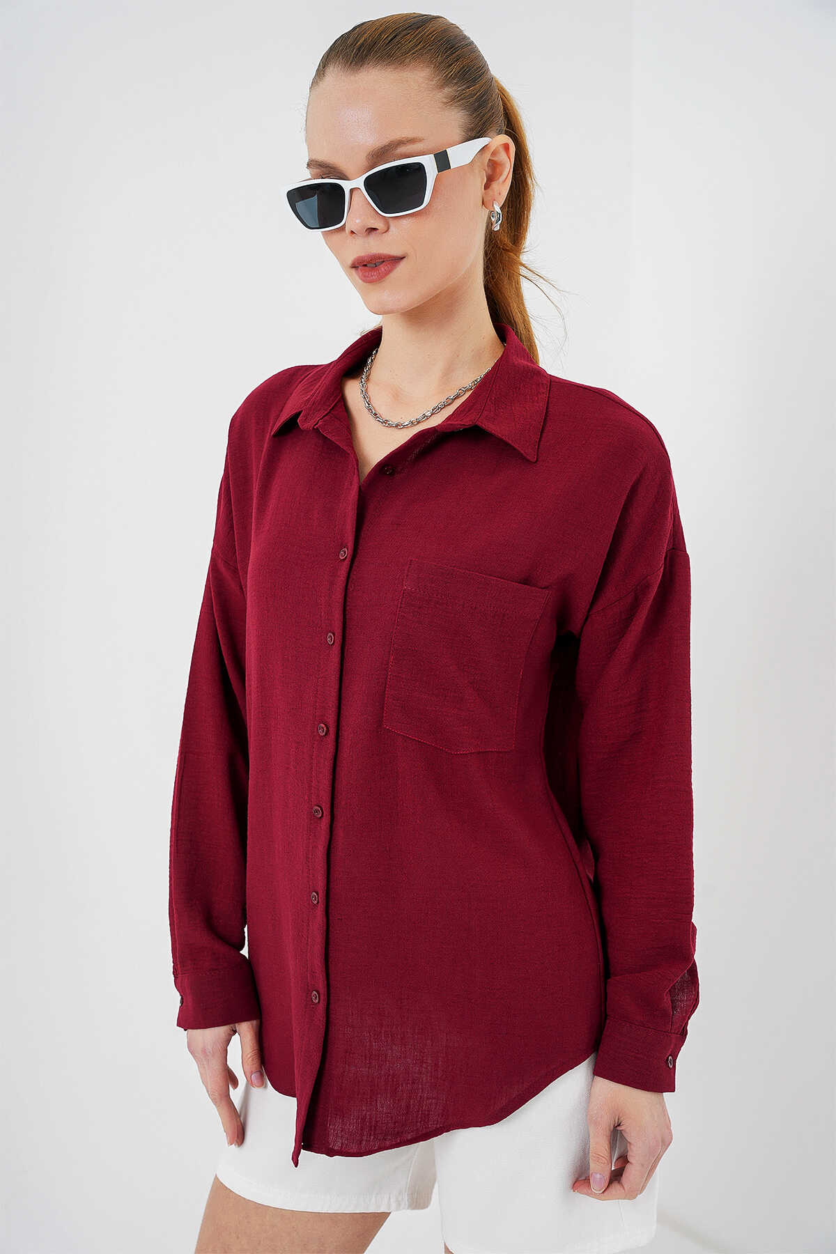 20153 Tek Cepli Oversize Keten Gömlek - Bordo - Kombin