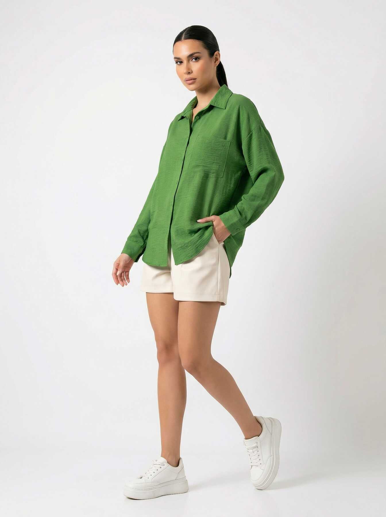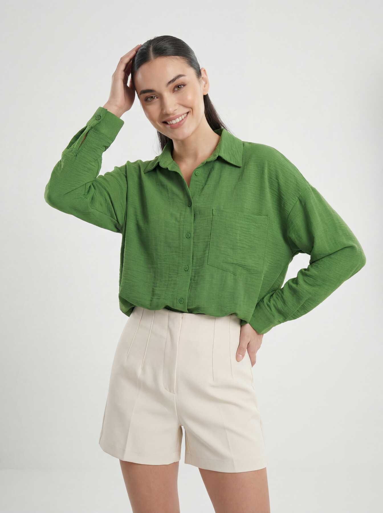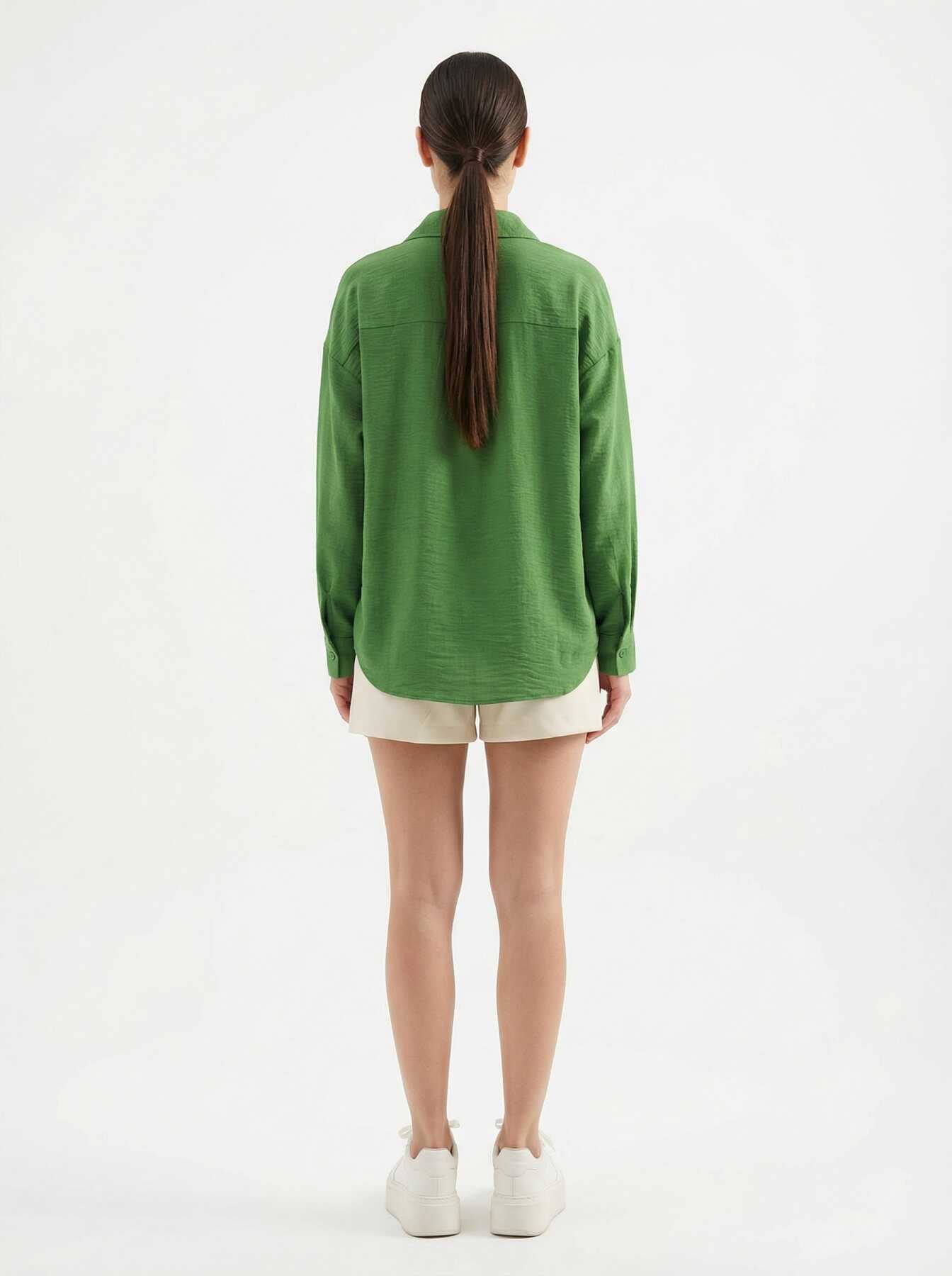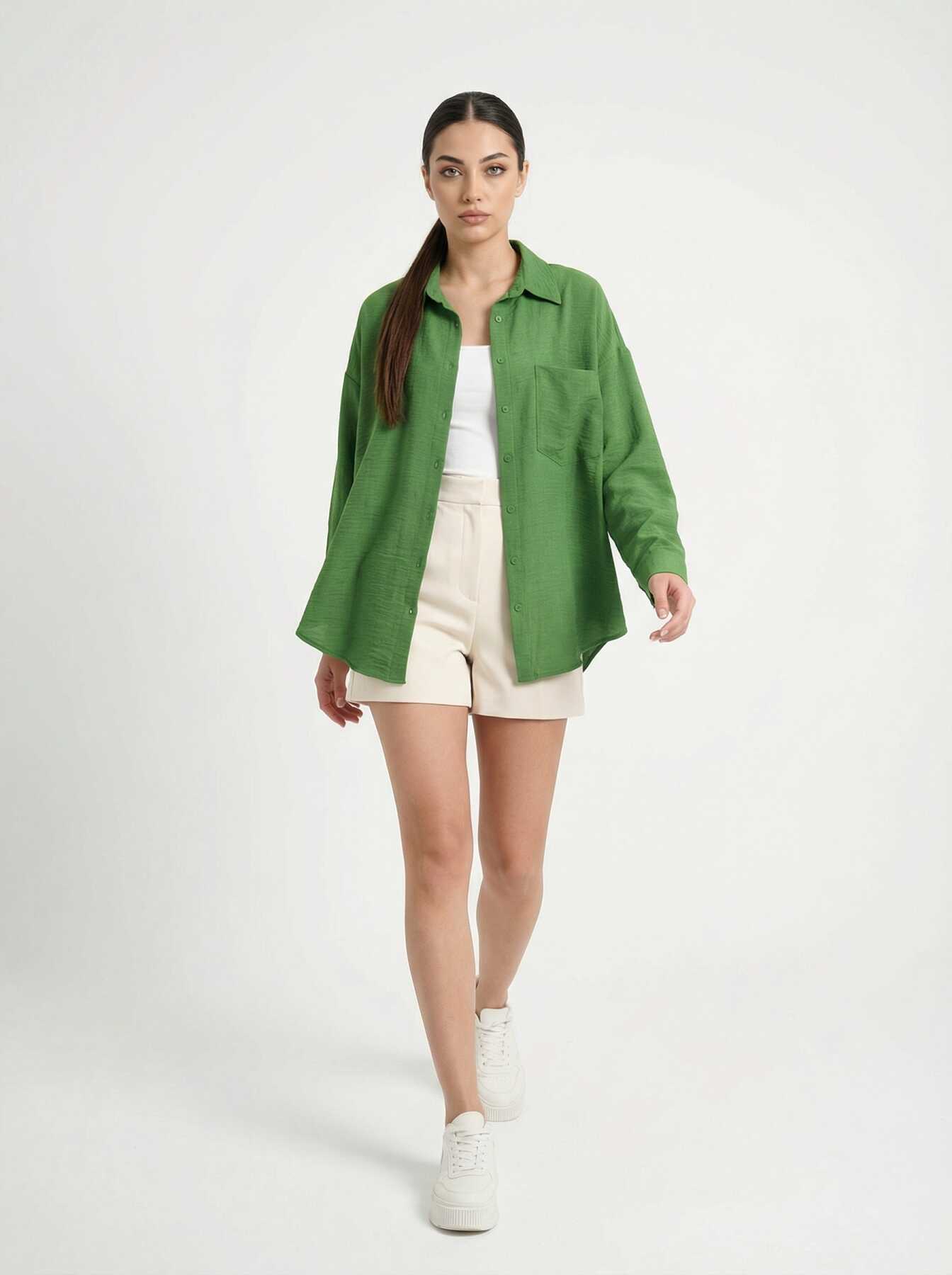20153 Tek Cepli Oversize Keten Gömlek - G.Yeşil - Kombin