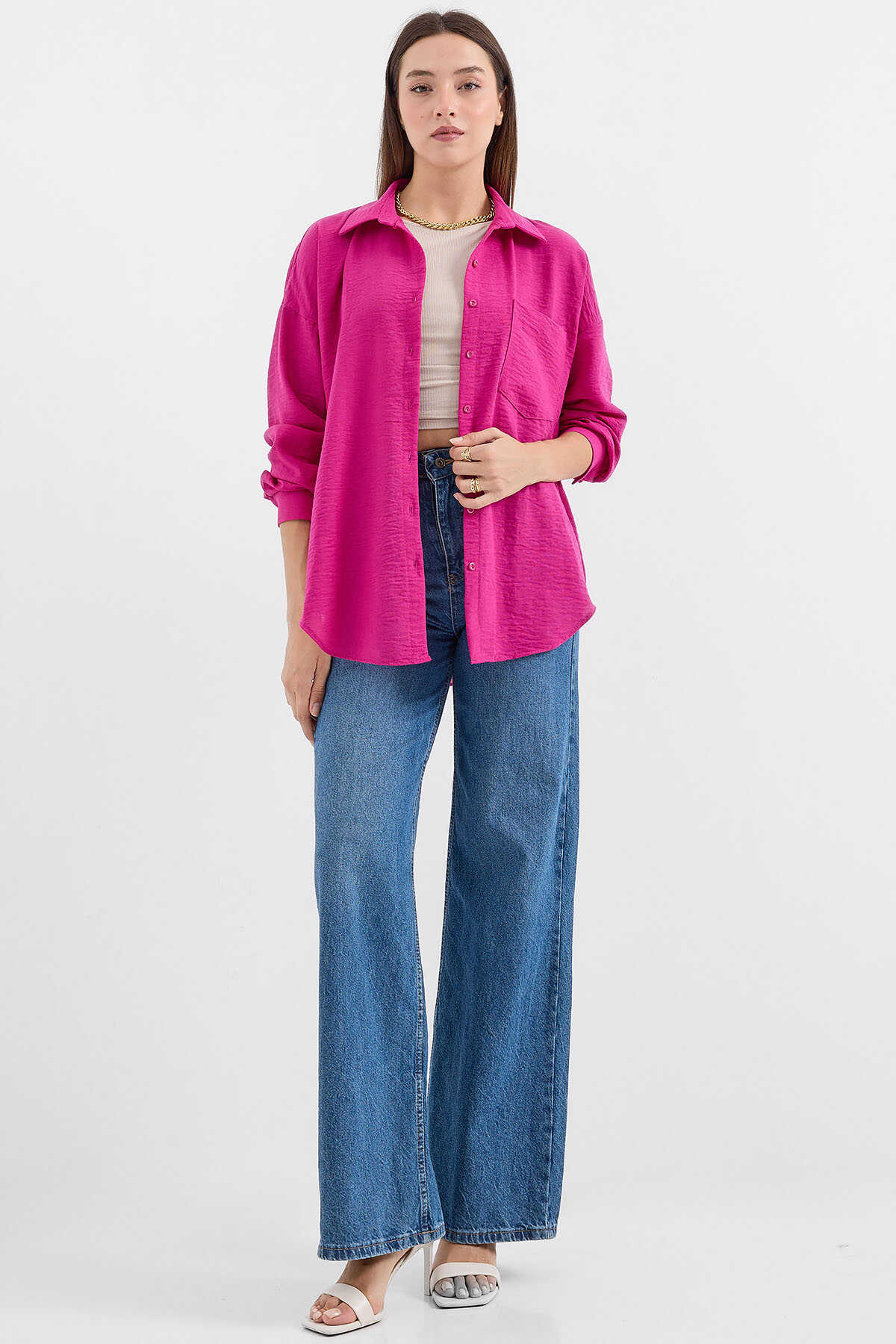 20153 Tek Cepli Oversize Keten Gömlek - Koyu Pembe - Kombin