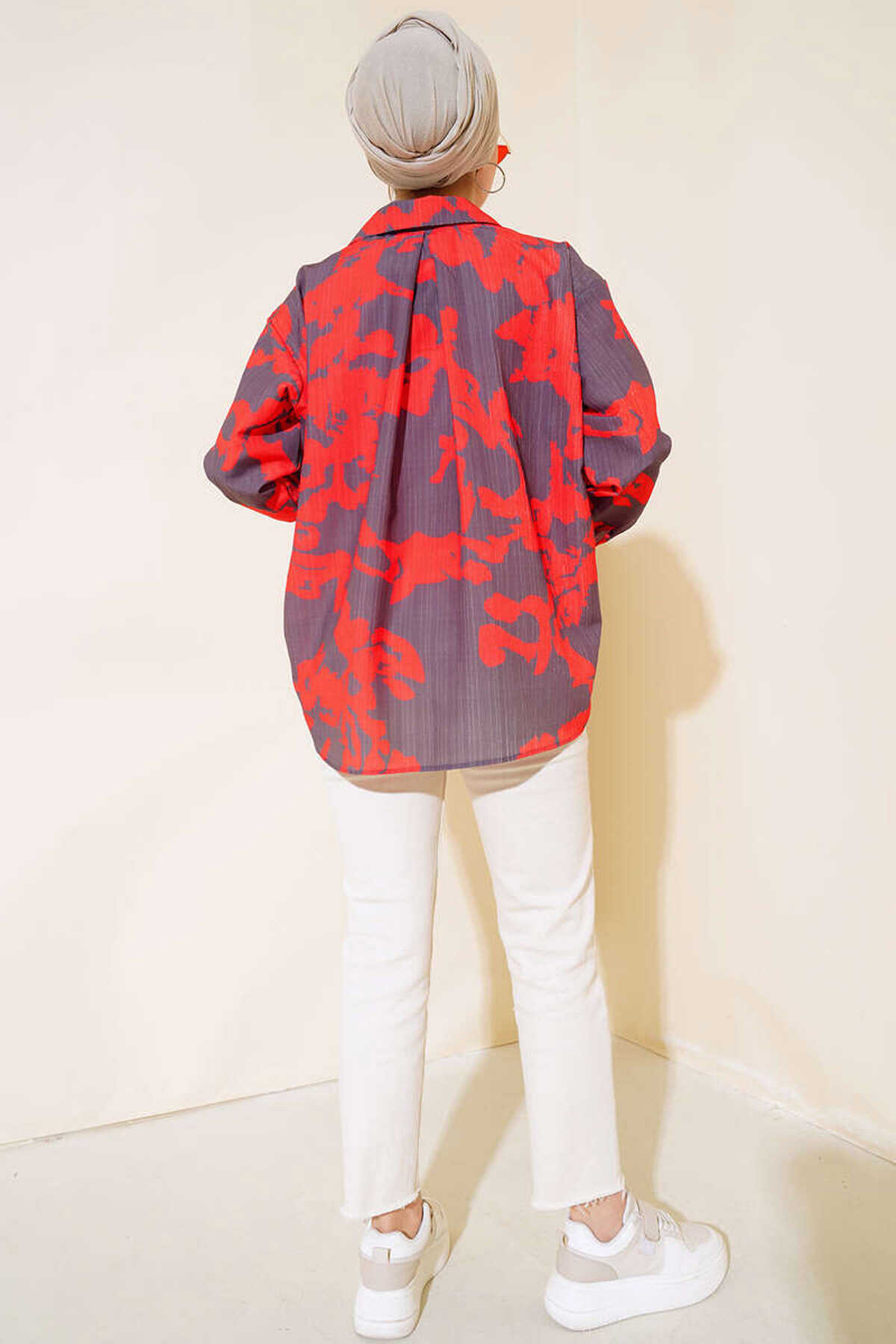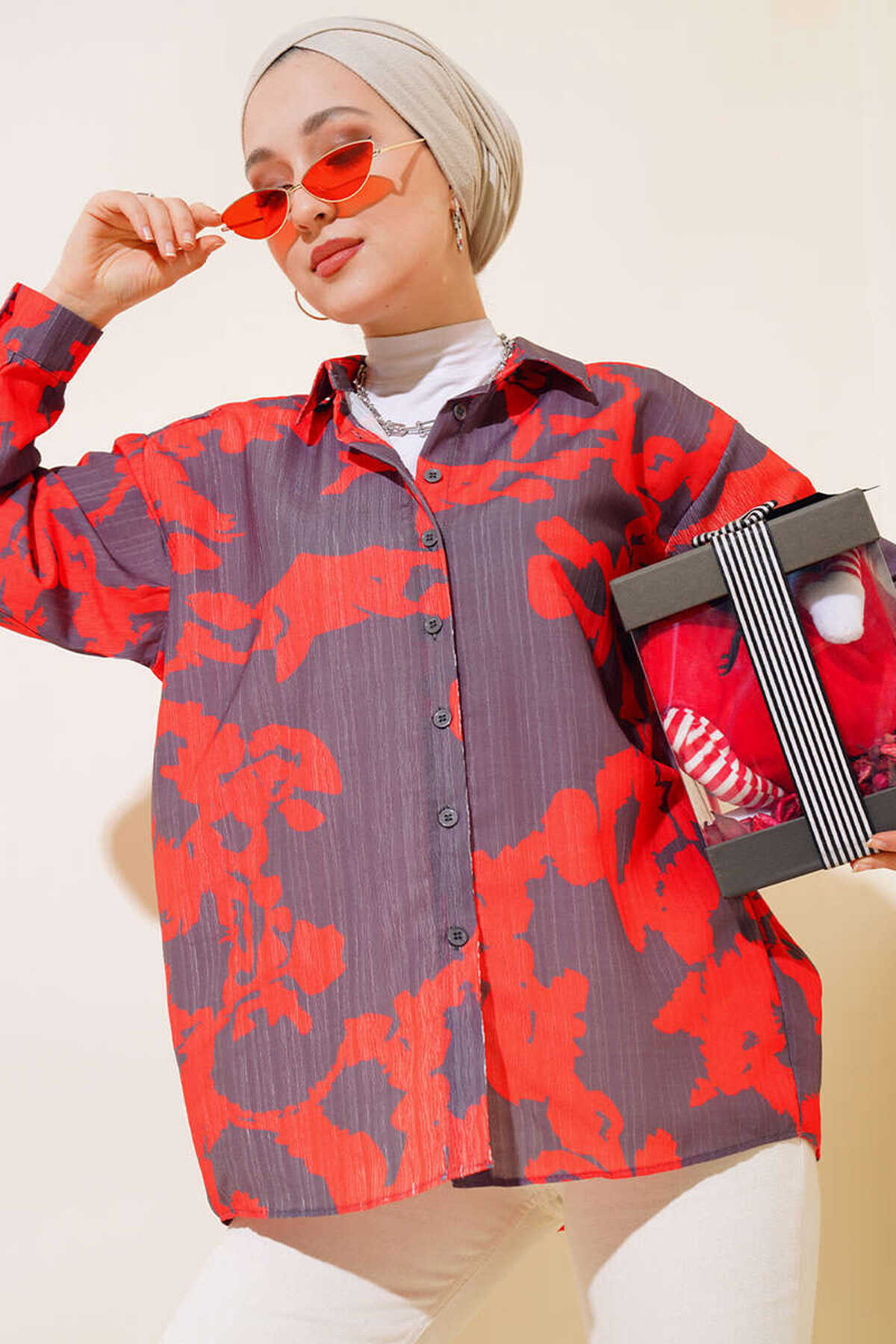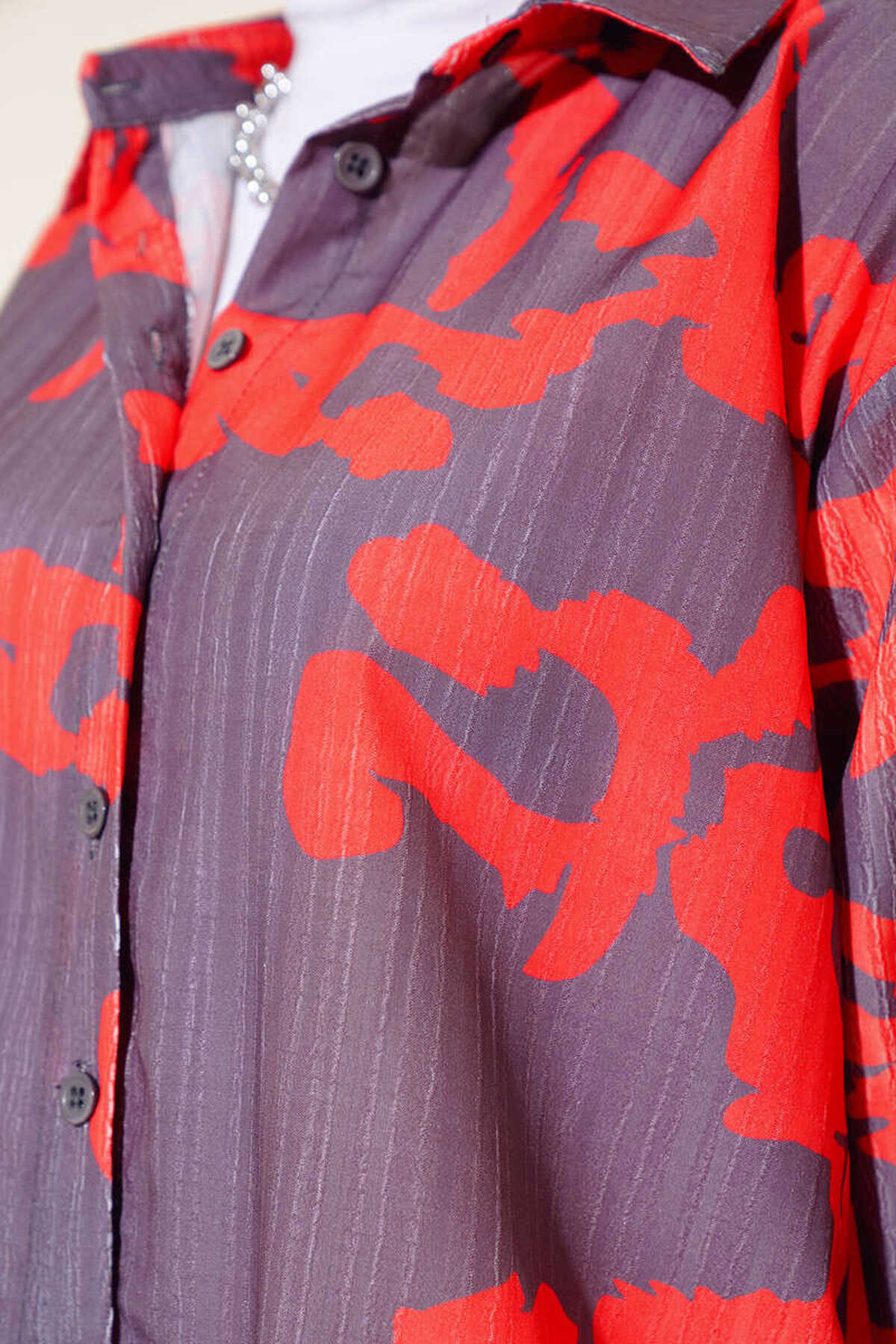 20179 Desenli Uzun Oversize Gömlek - Kırmızı