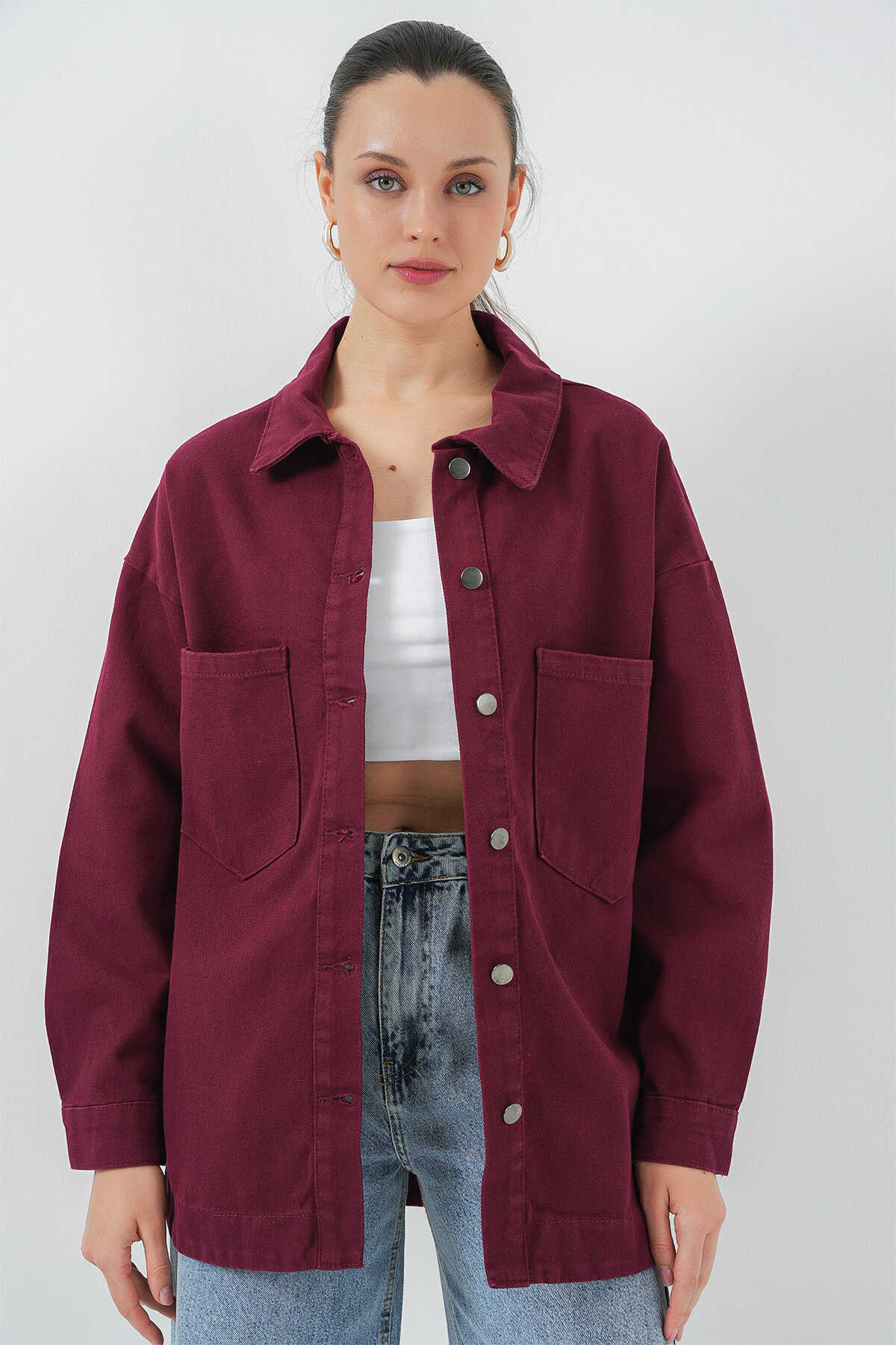 20192 Oversize Gabardin Gömlek Ceket - Bordo - Kombin