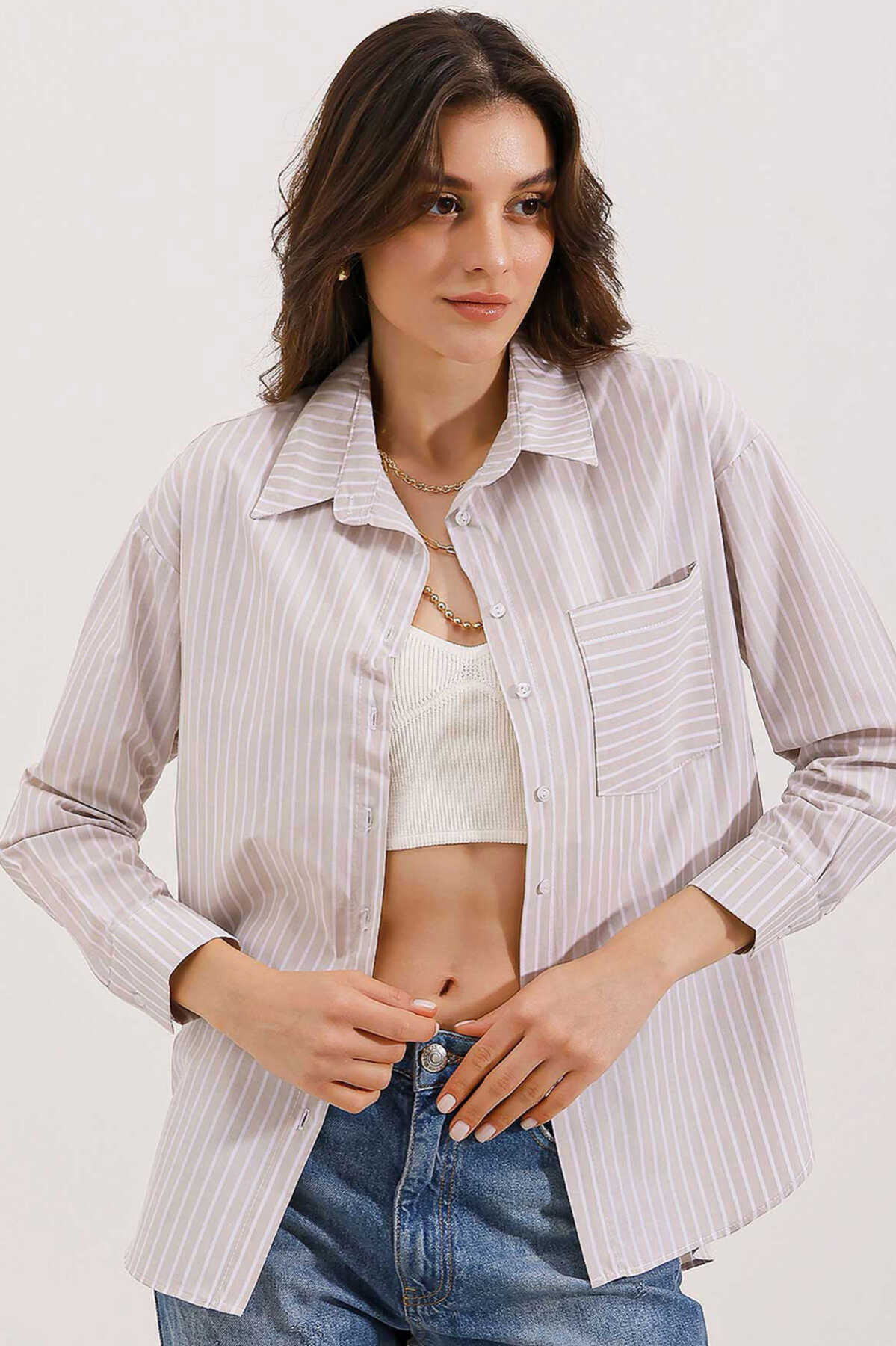 20205 Çizgili Oversize Gömlek - Krem