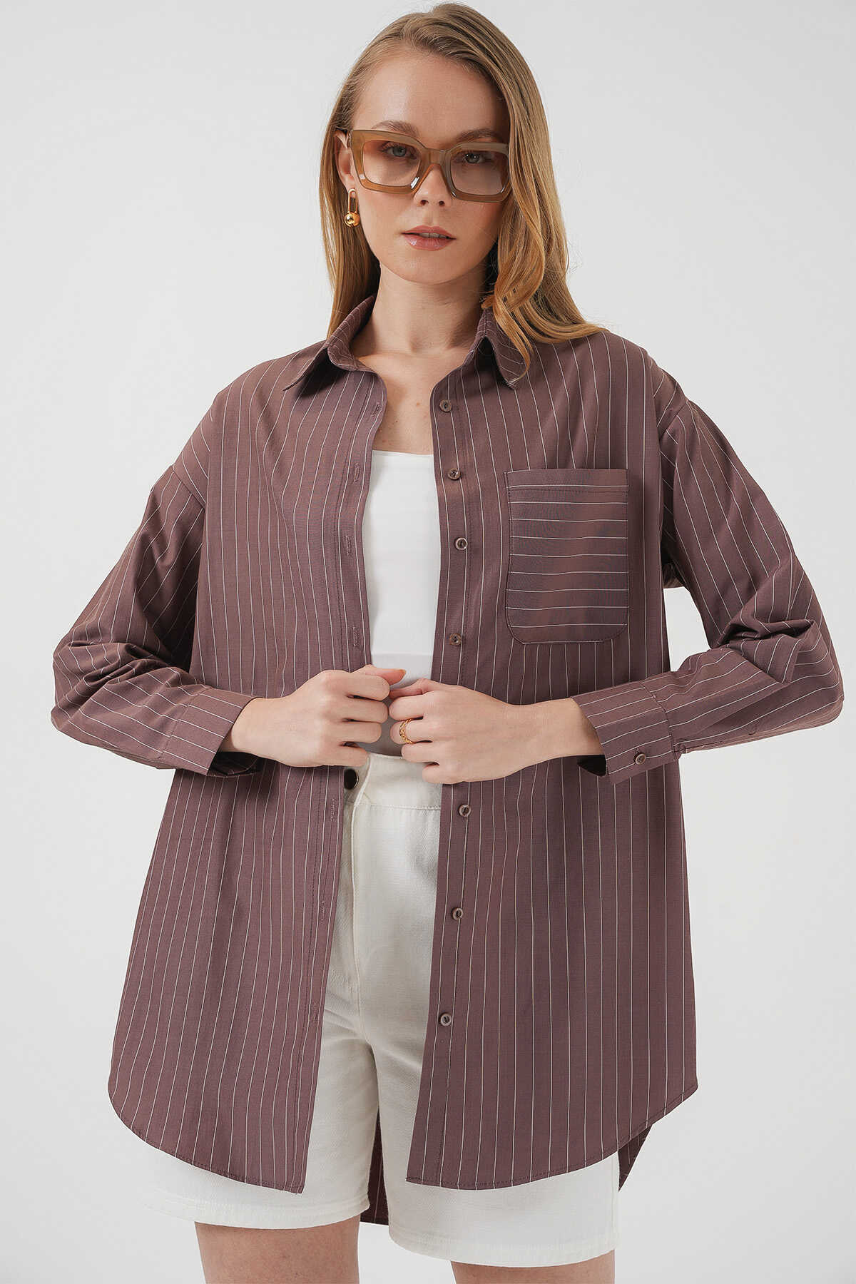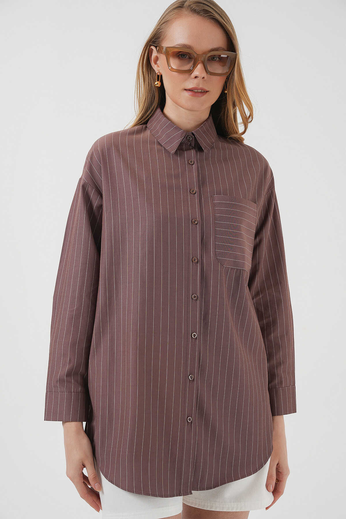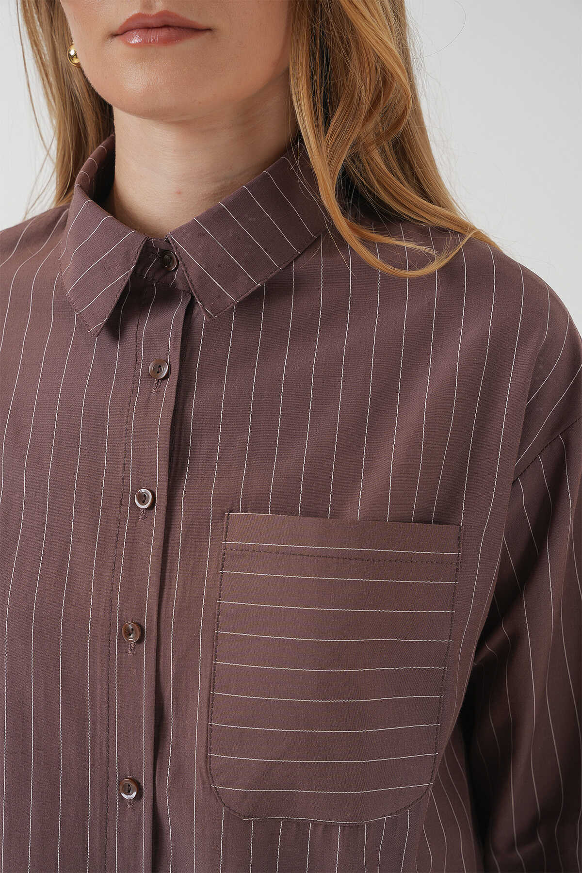 20217 Cep Detaylı Çizgili Oversize Gömlek - Kahverengi