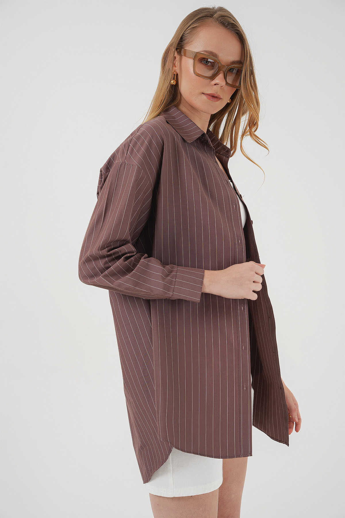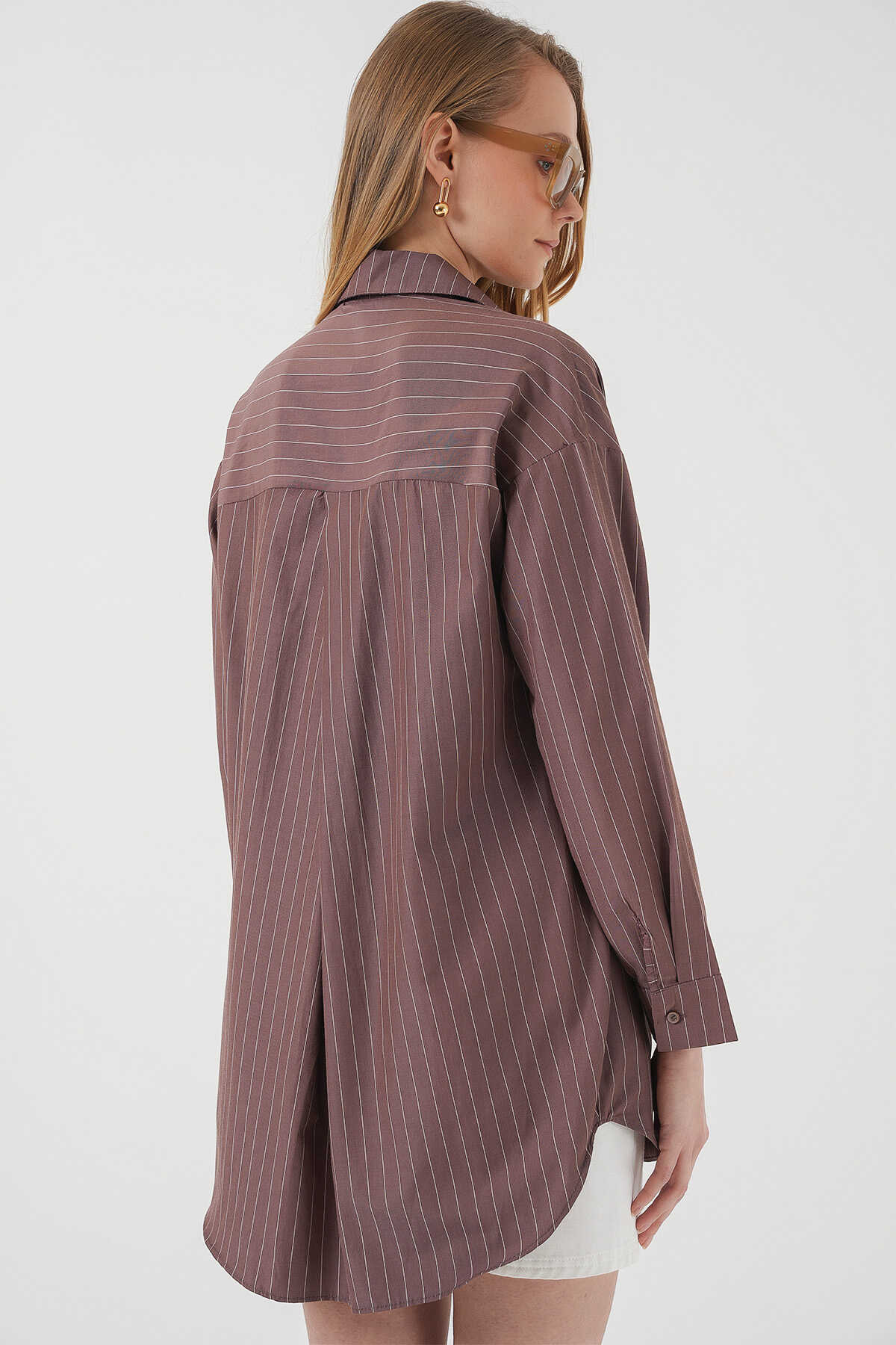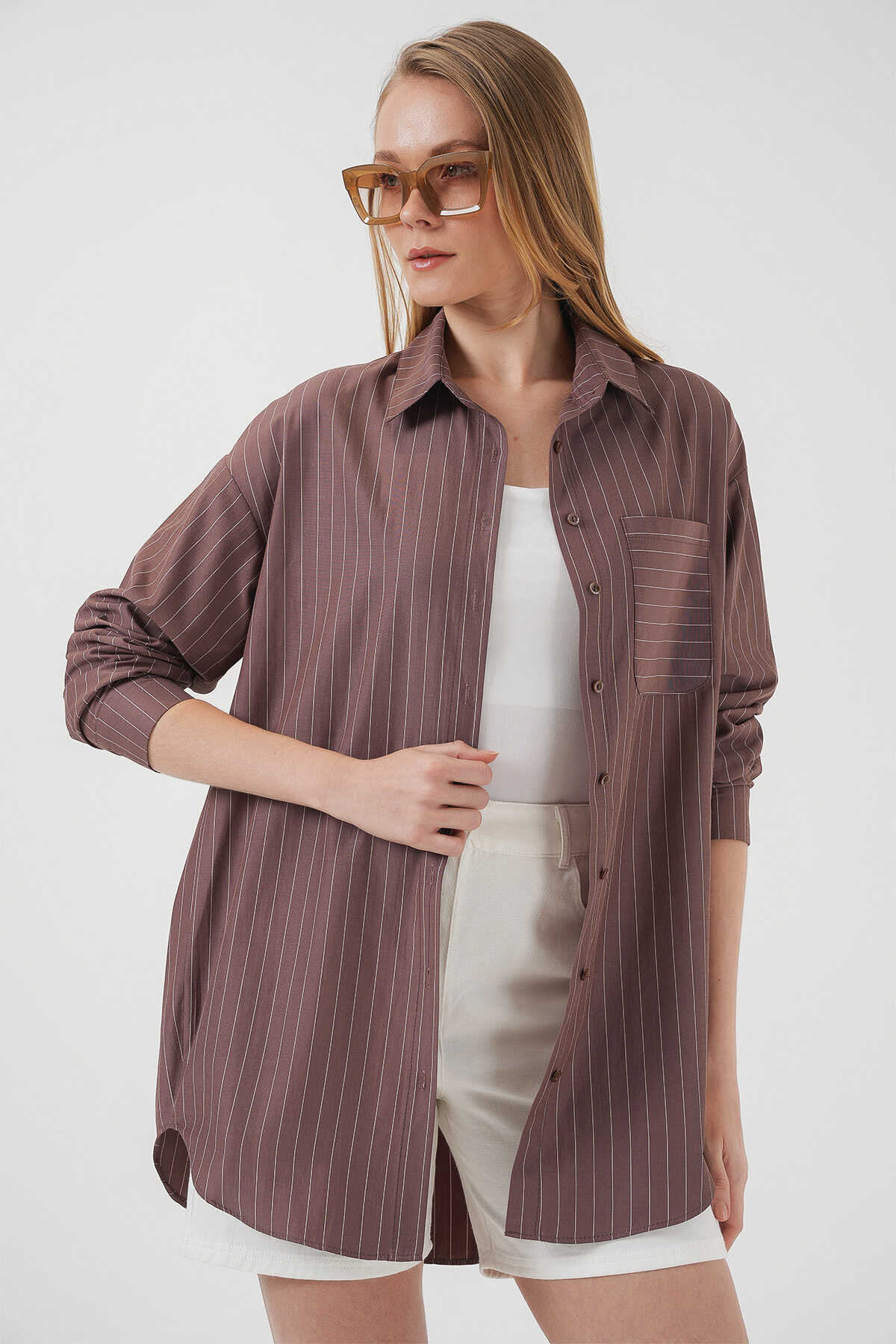 20217 Cep Detaylı Çizgili Oversize Gömlek - Kahverengi