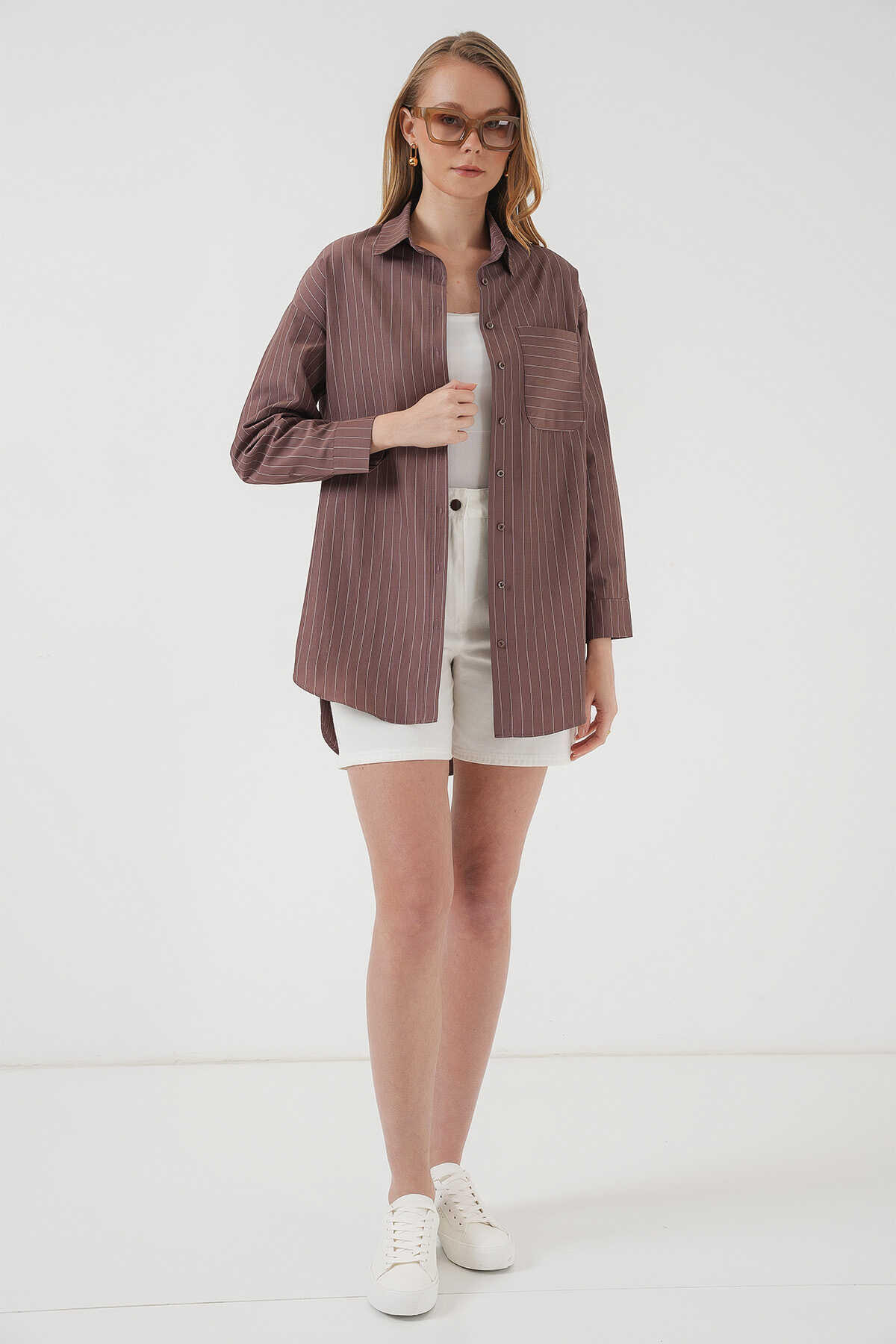 20217 Cep Detaylı Çizgili Oversize Gömlek - Kahverengi - Kombin