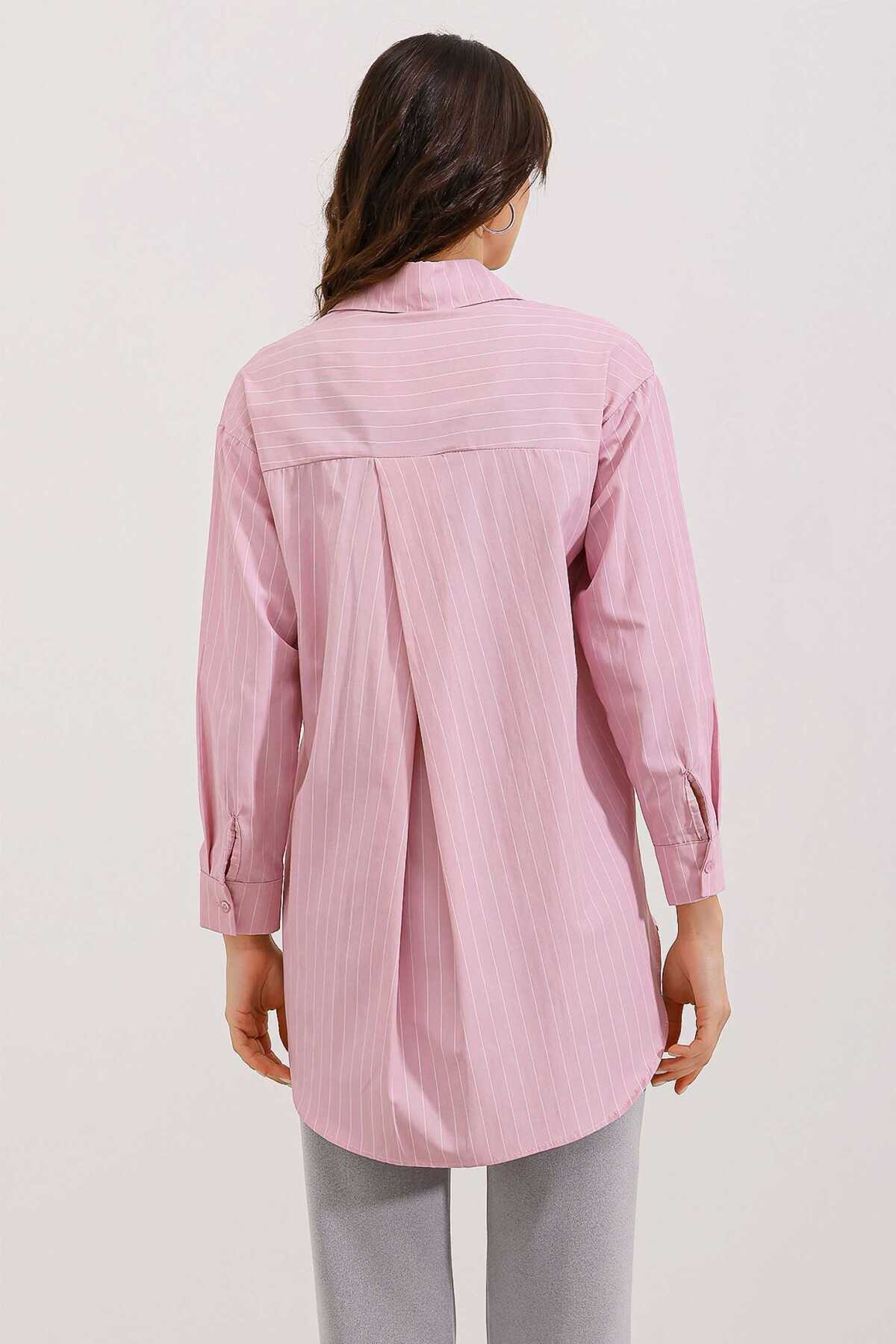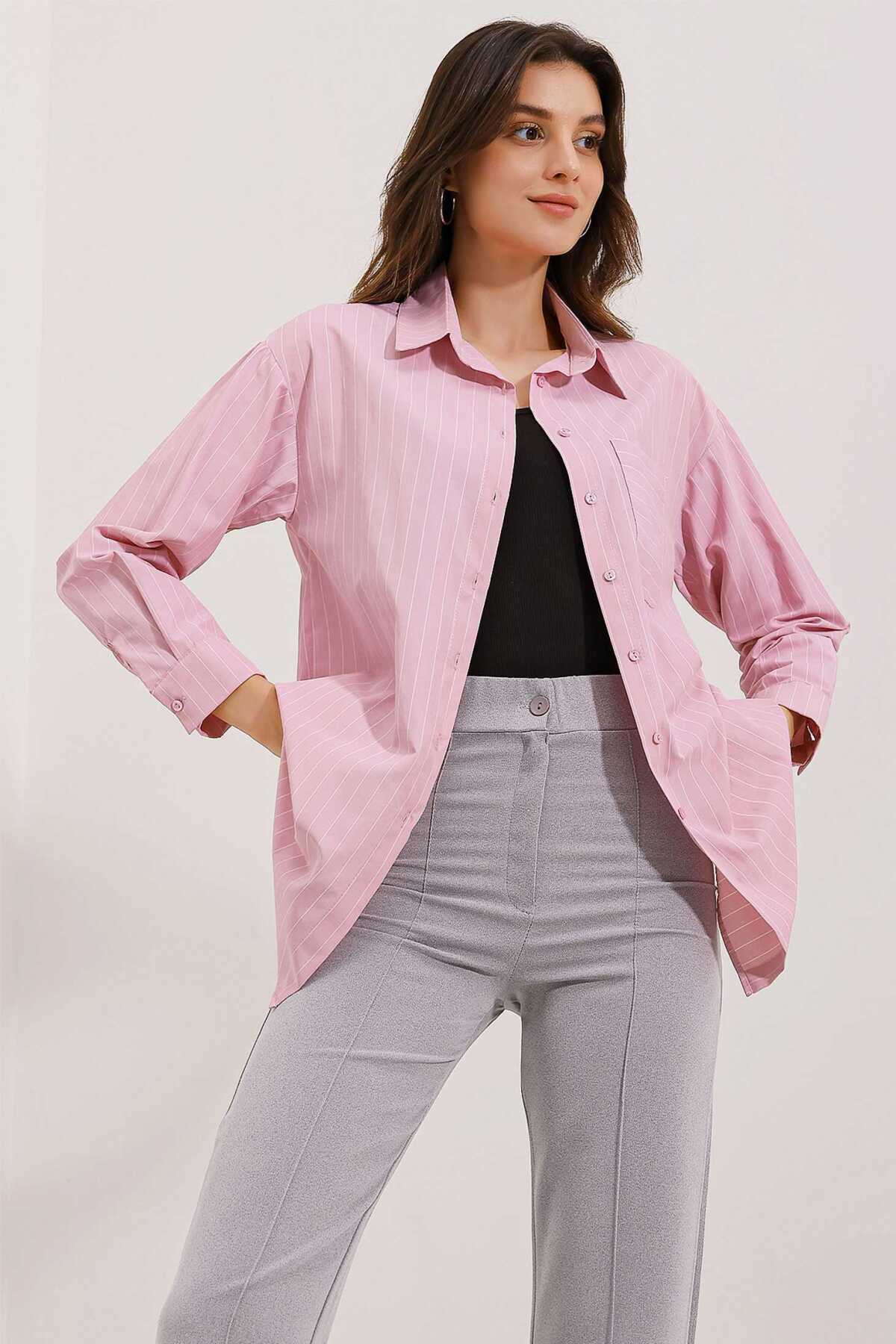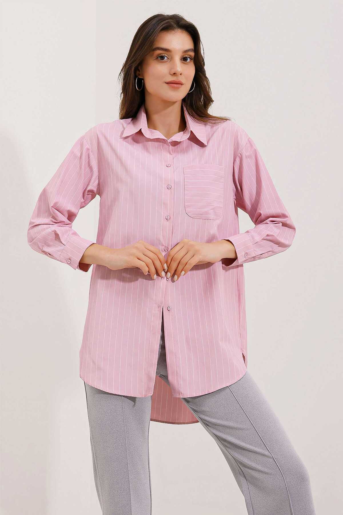 20217 Cep Detaylı Çizgili Oversize Gömlek - Pudra