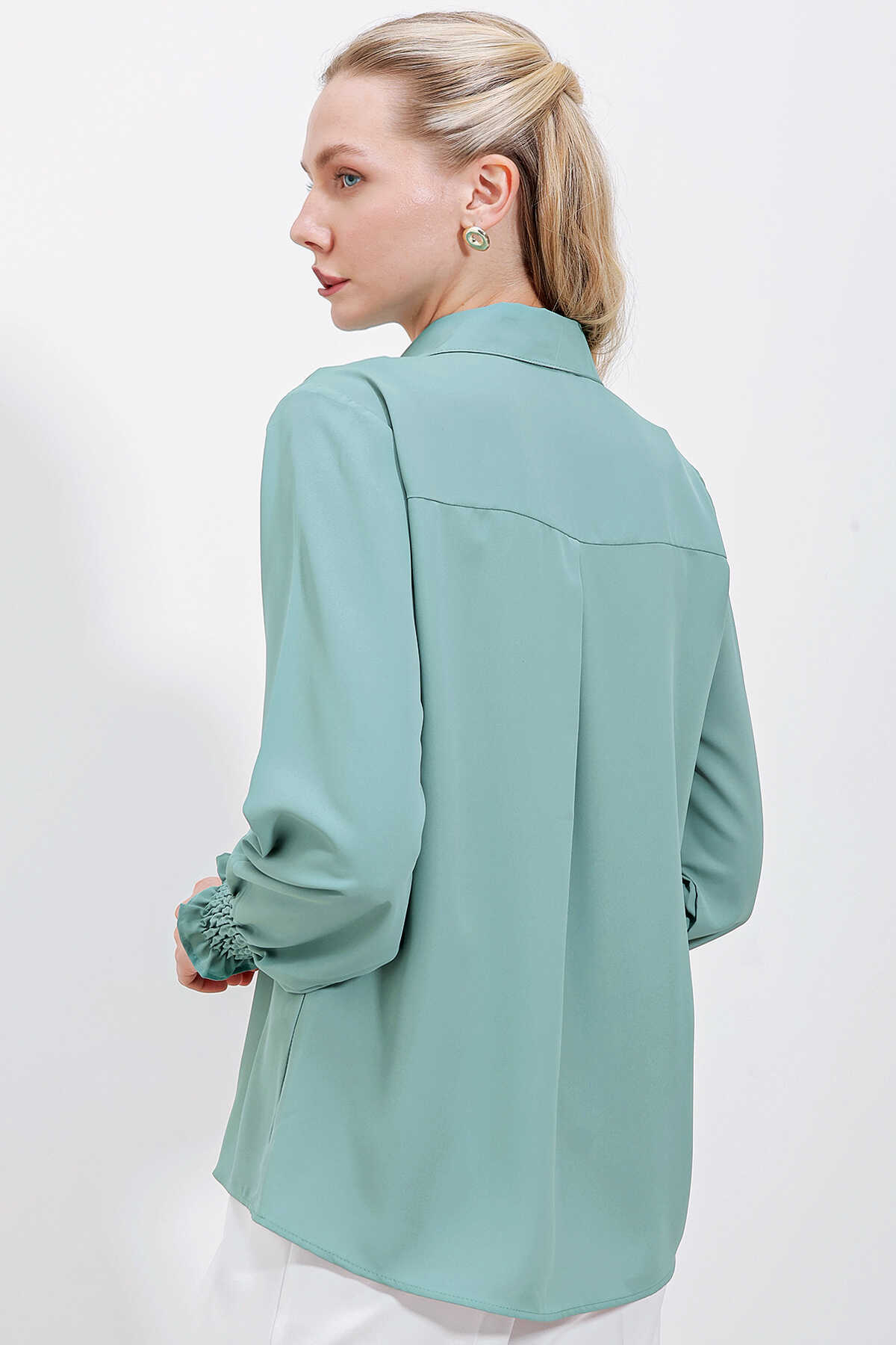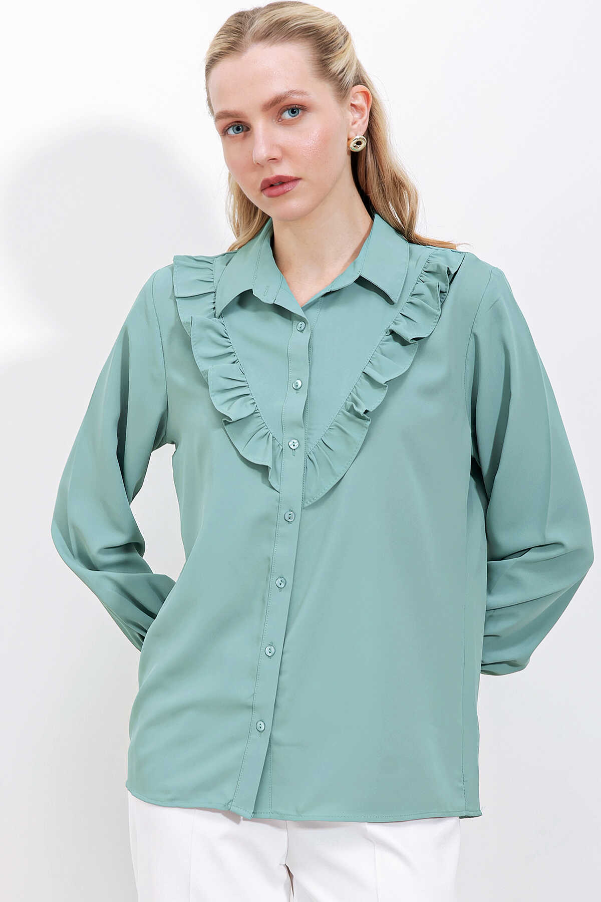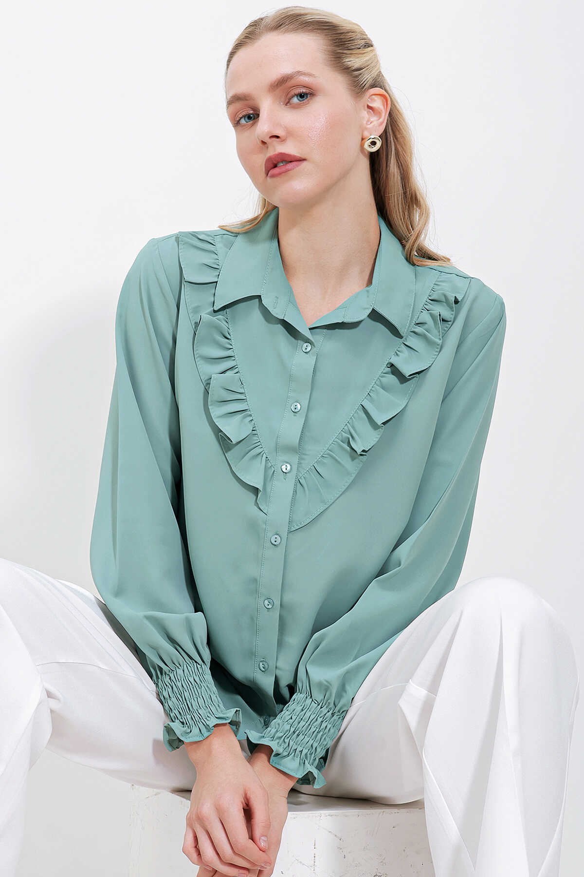 20223 Fırfırlı Uzun Kol Gömlek - Çağla - Kombin