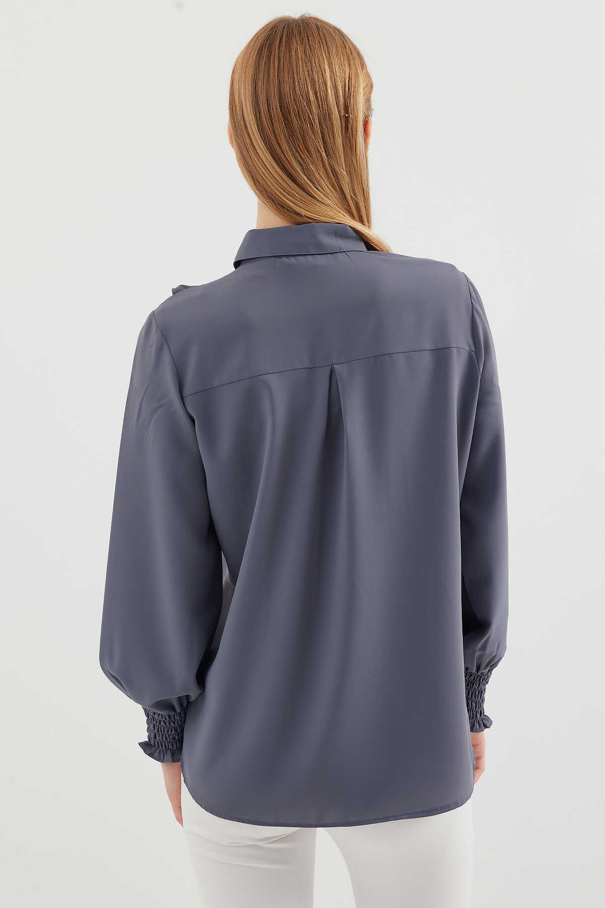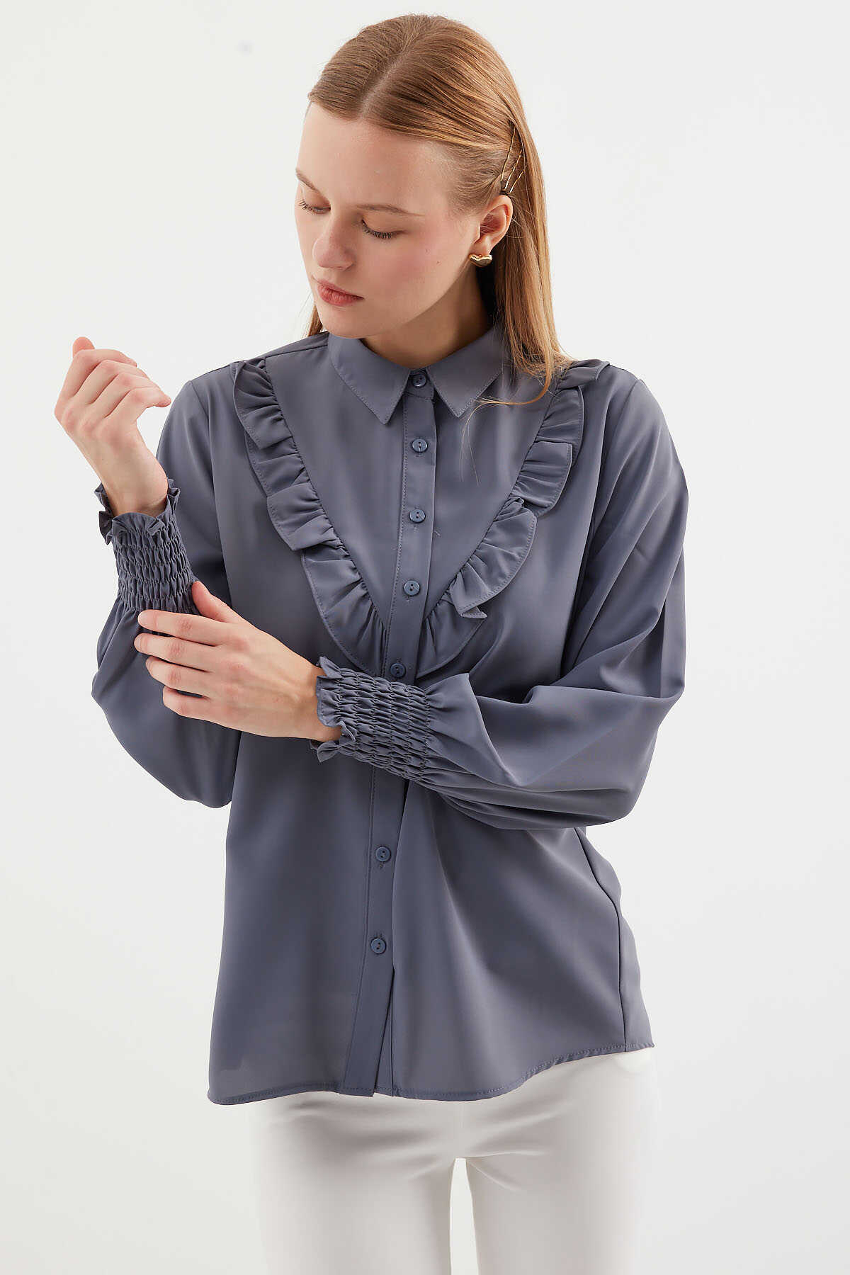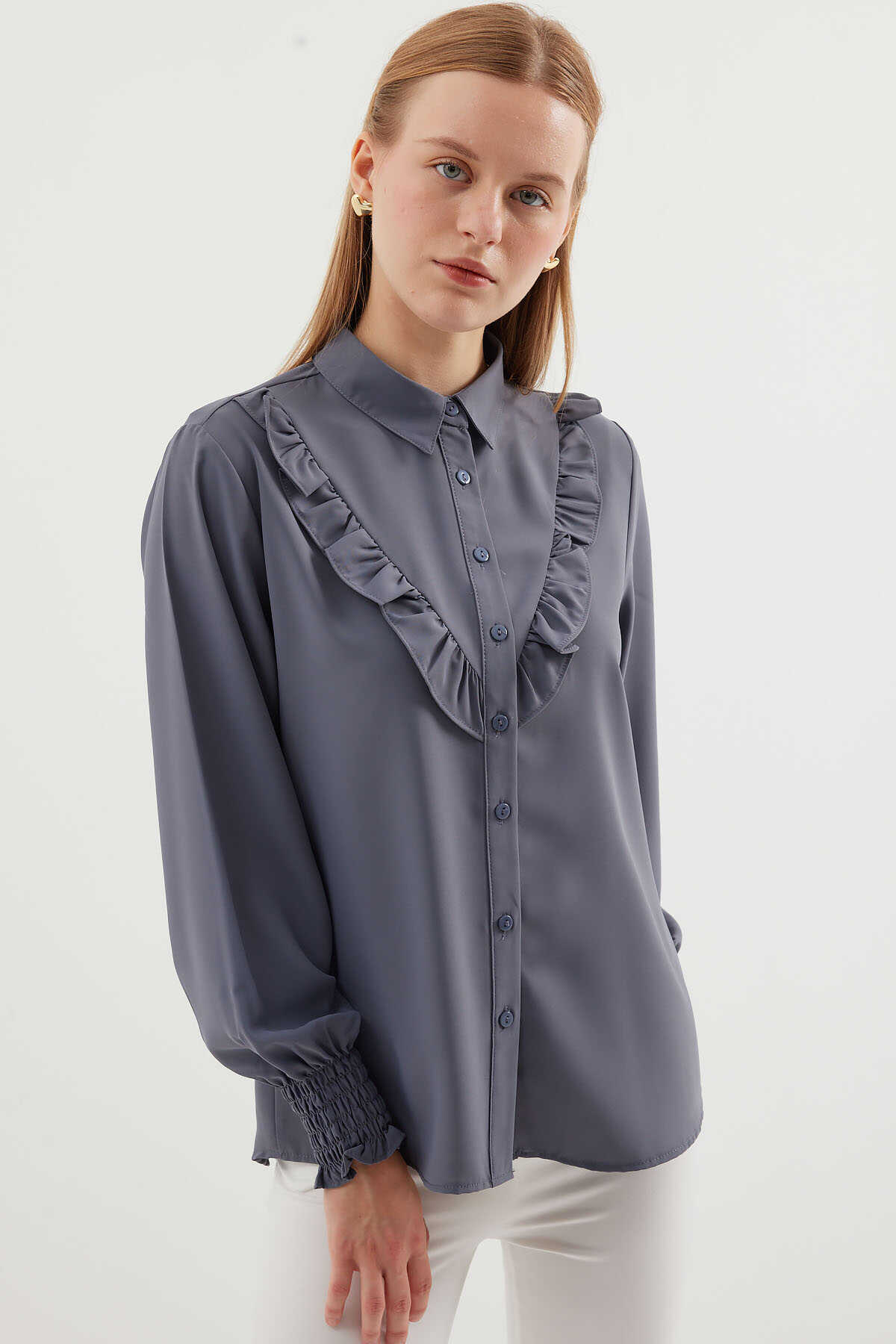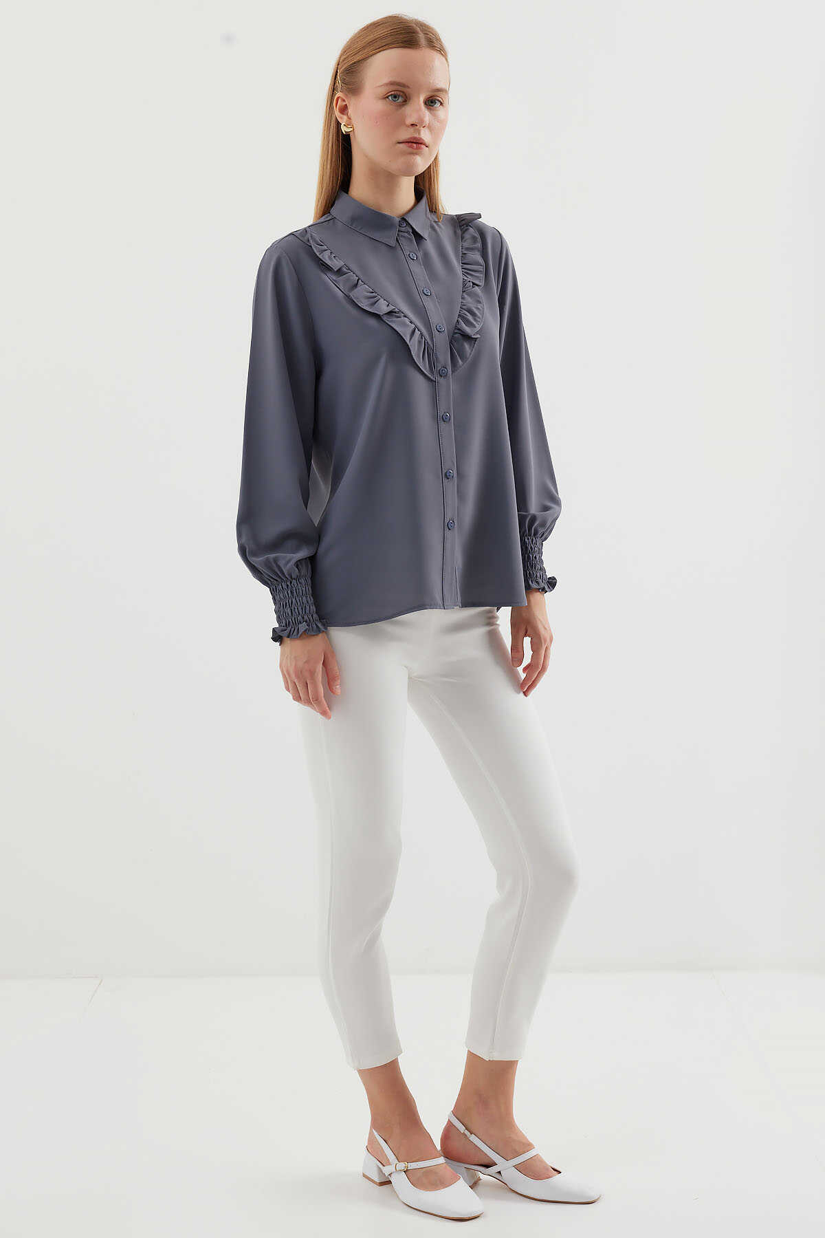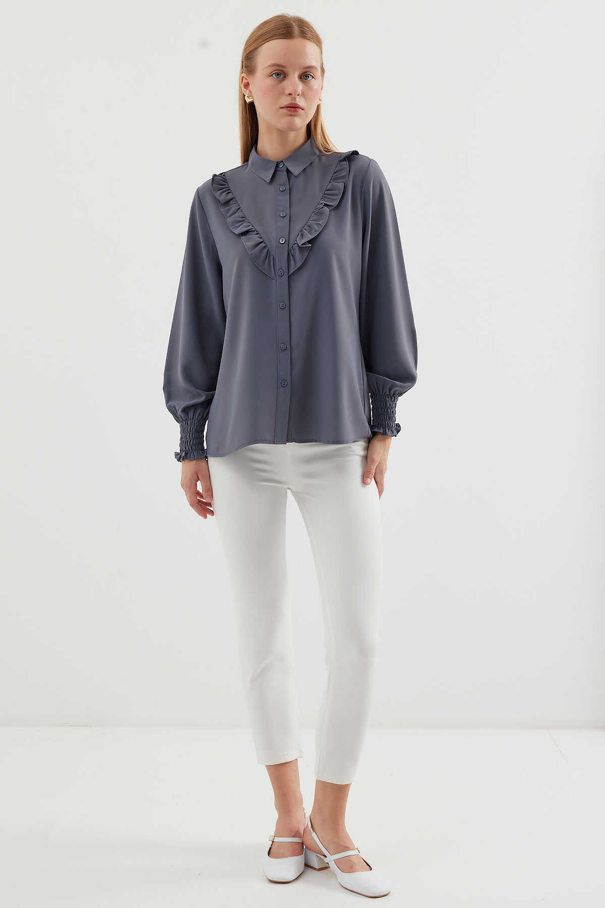 20223 Fırfırlı Uzun Kol Gömlek - Gri - Kombin