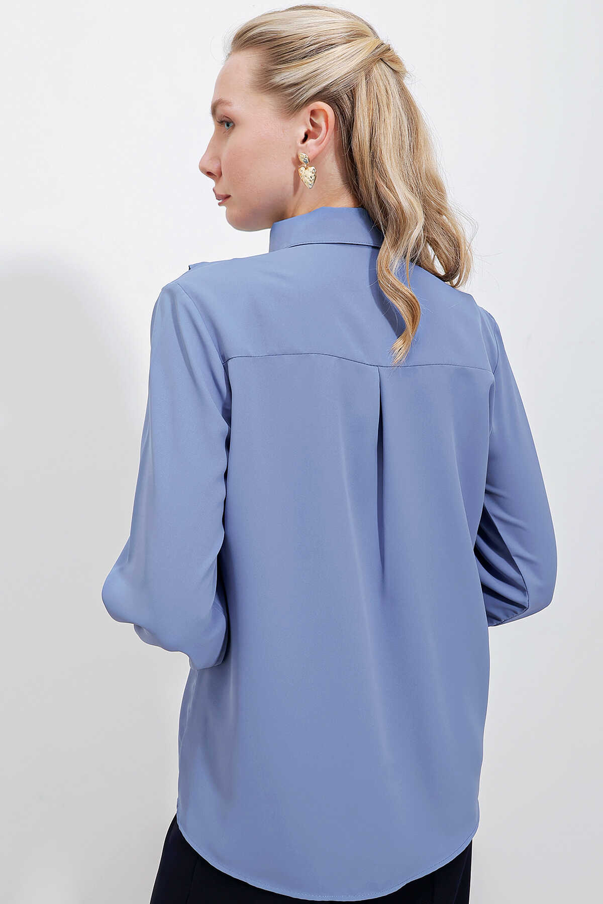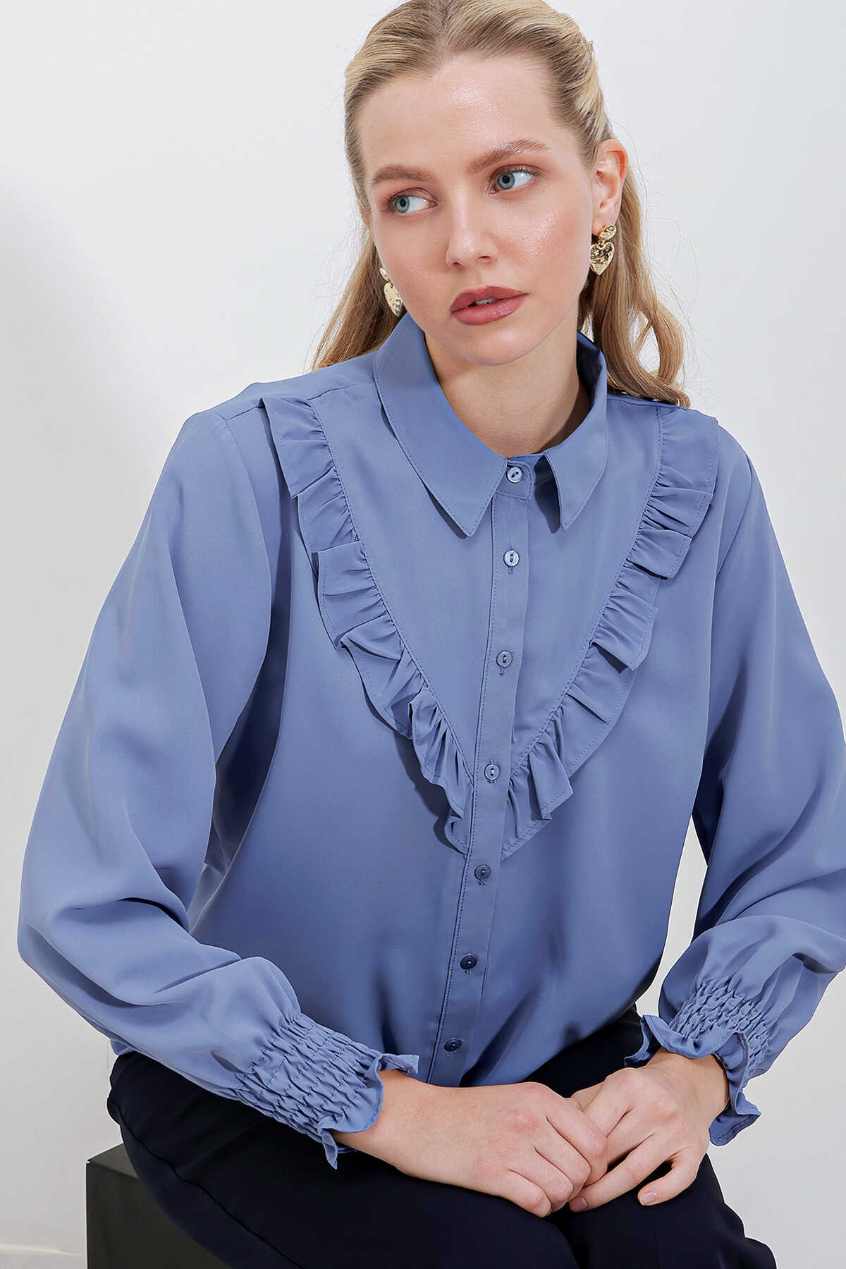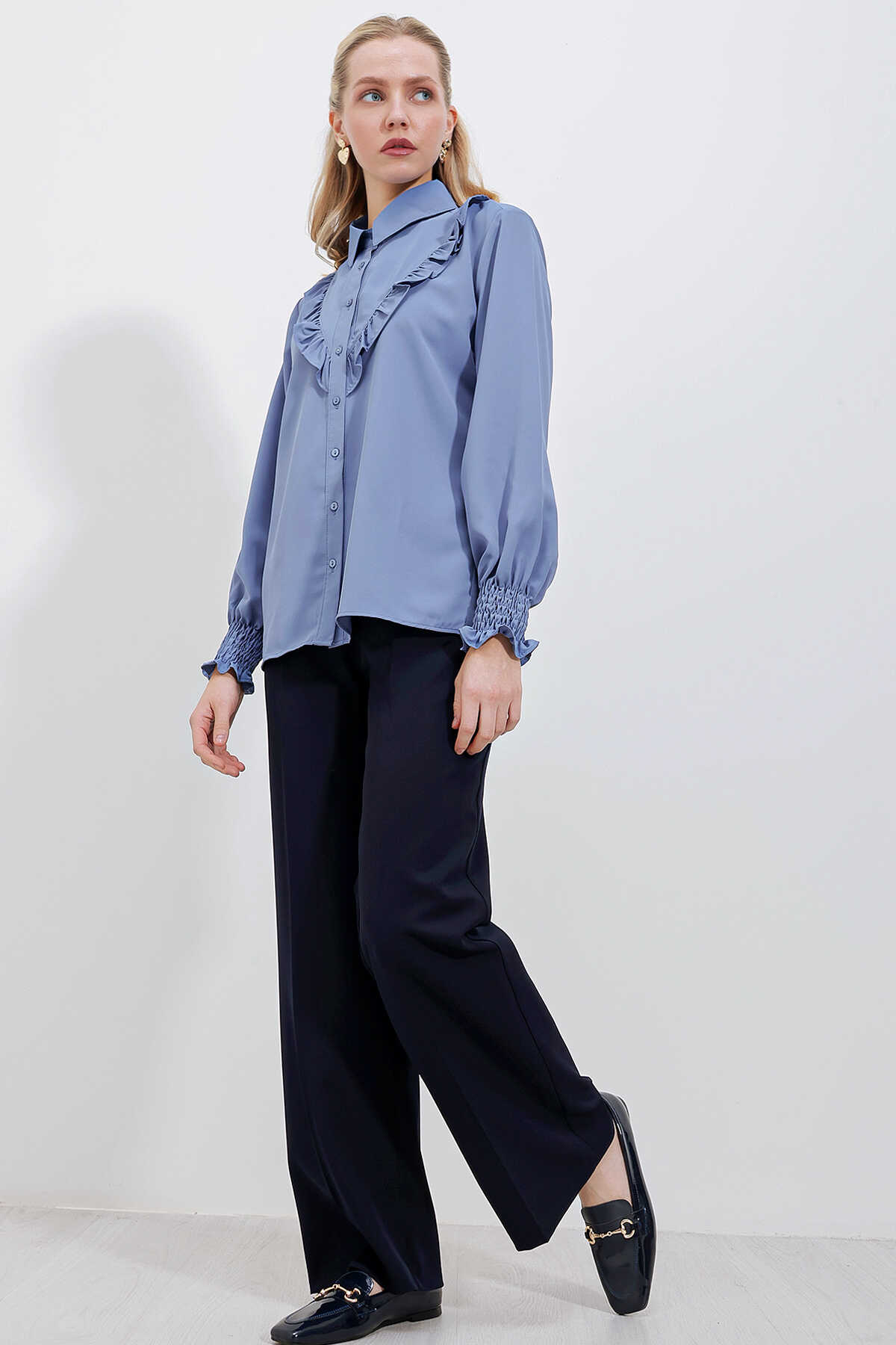 20223 Fırfırlı Uzun Kol Gömlek - İndigo - Kombin