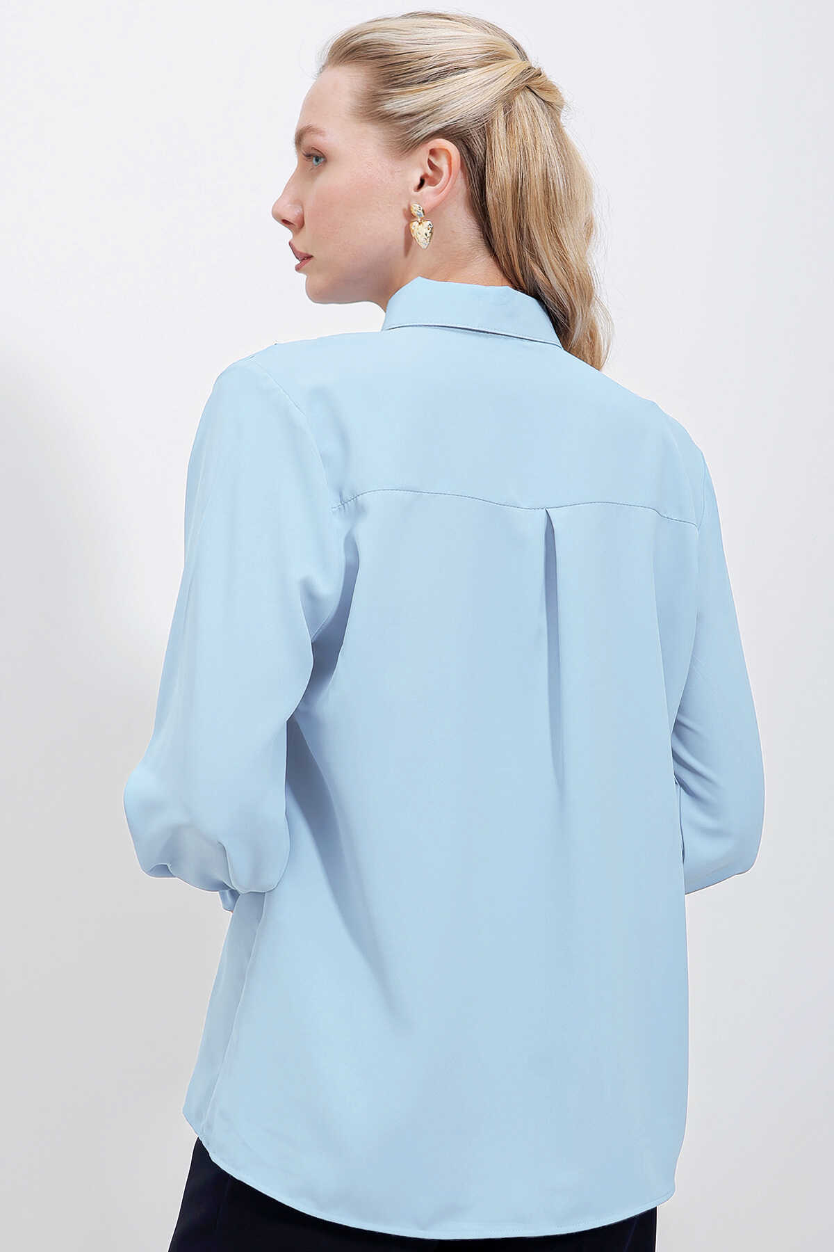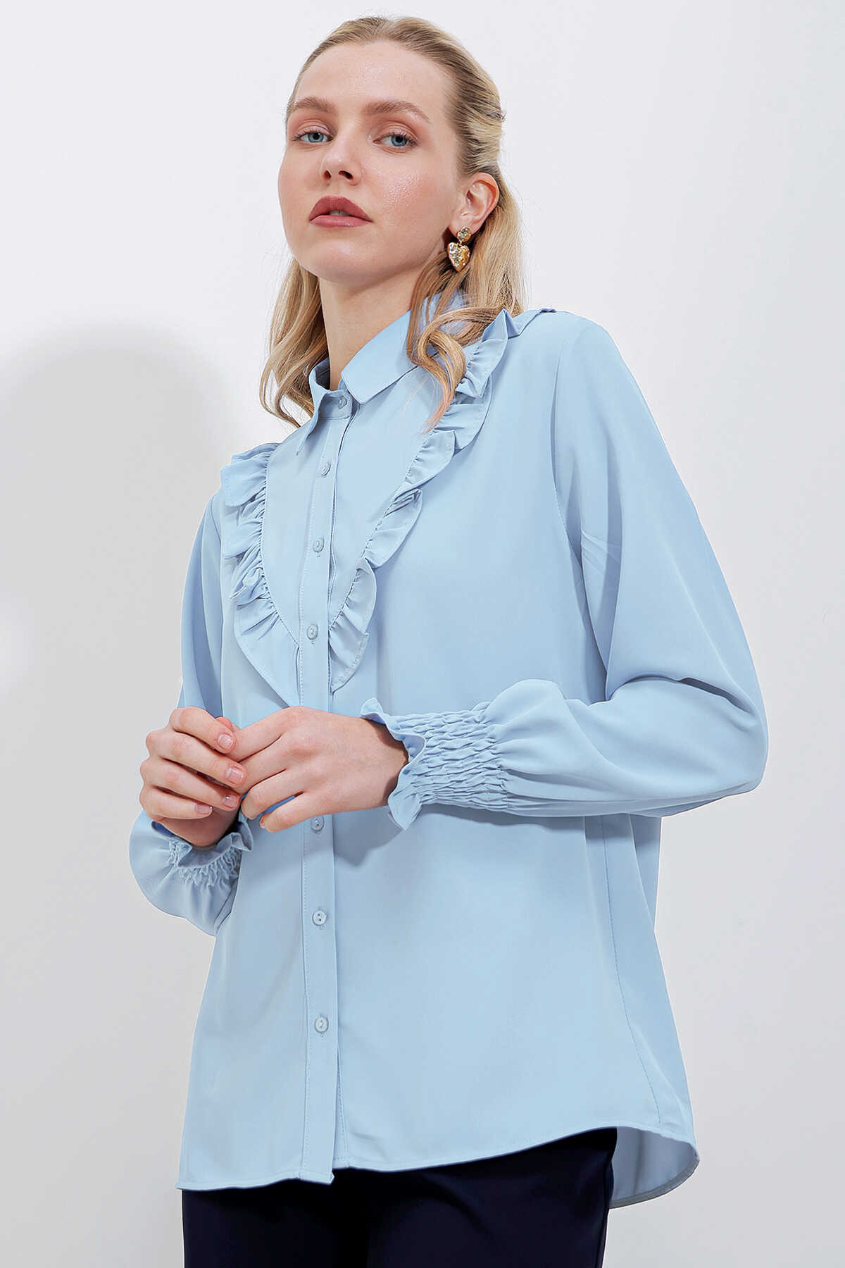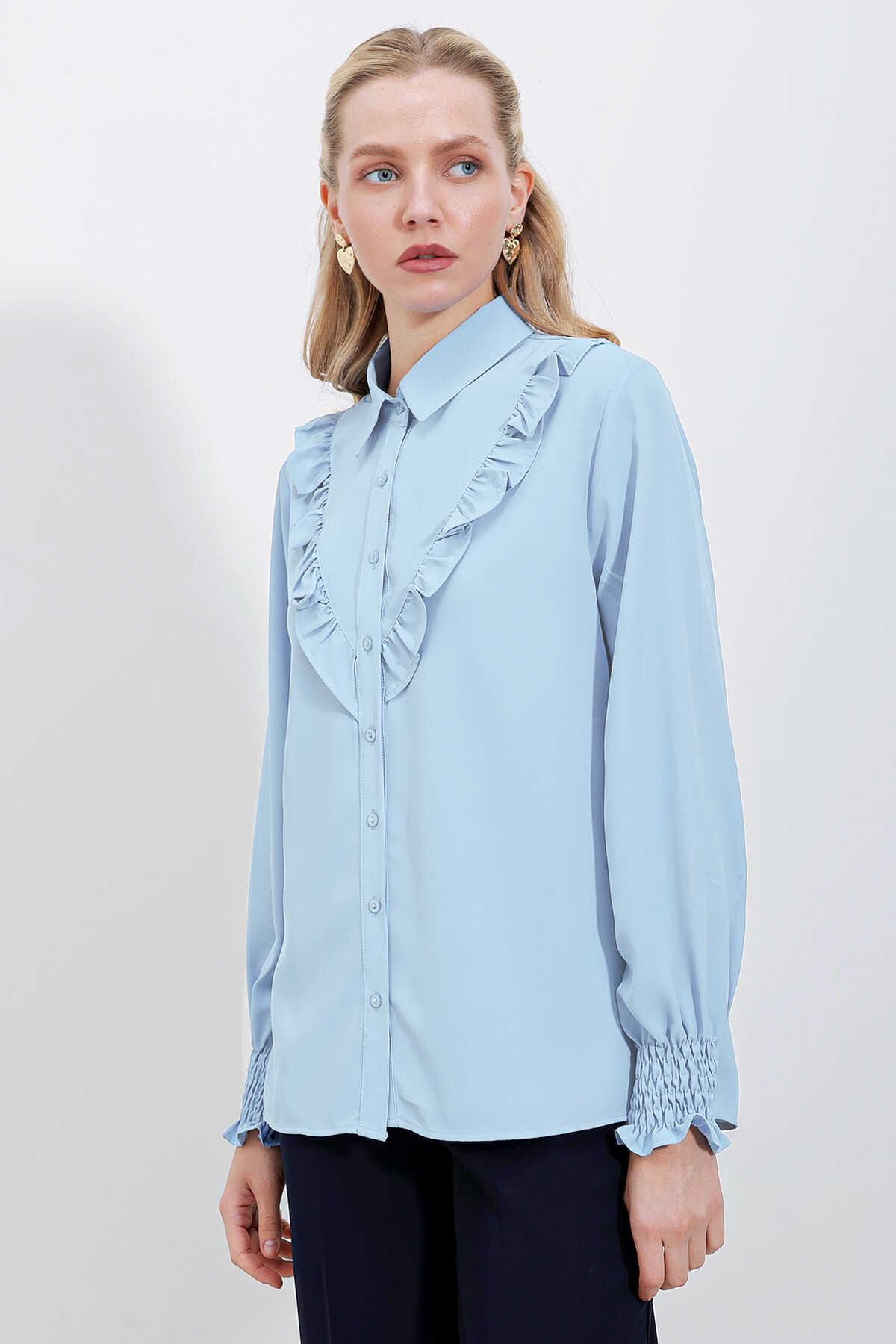 20223 Fırfırlı Uzun Kol Gömlek - Mavi - Kombin