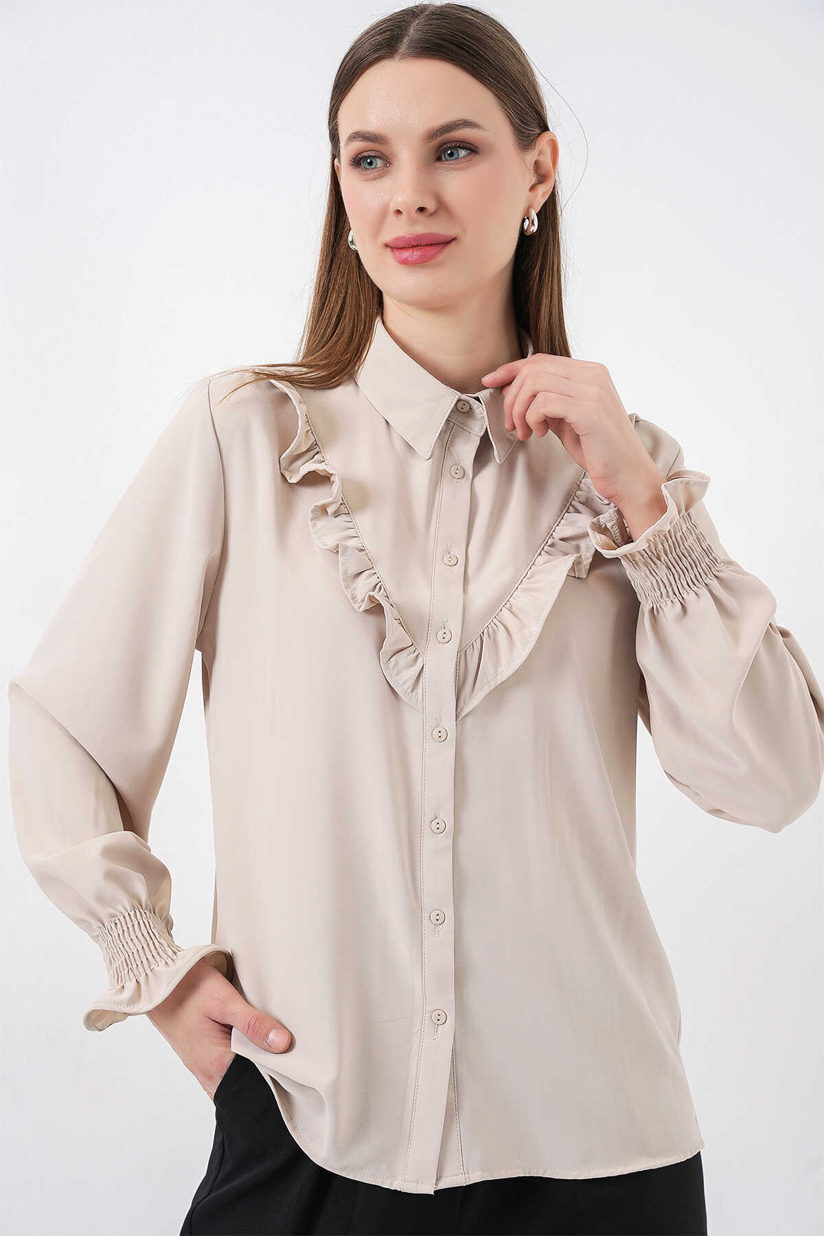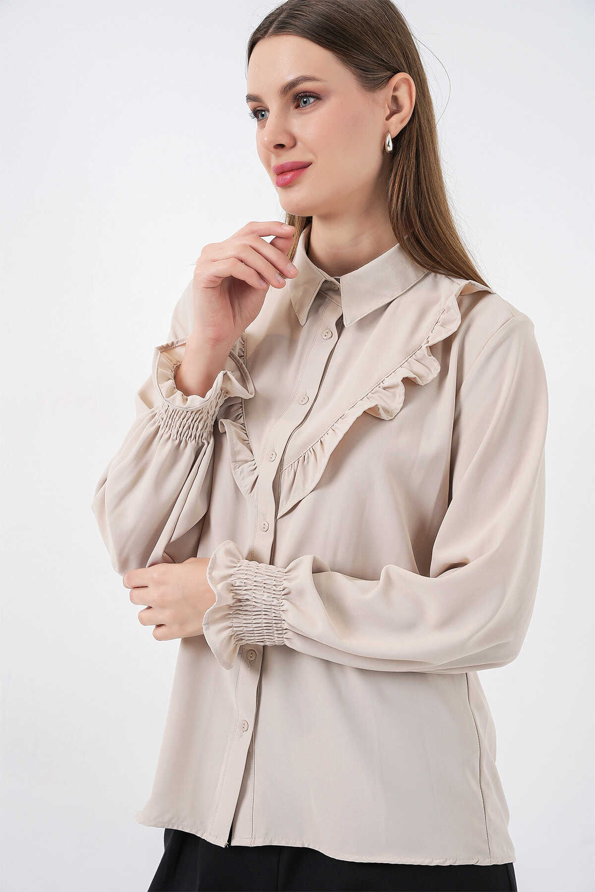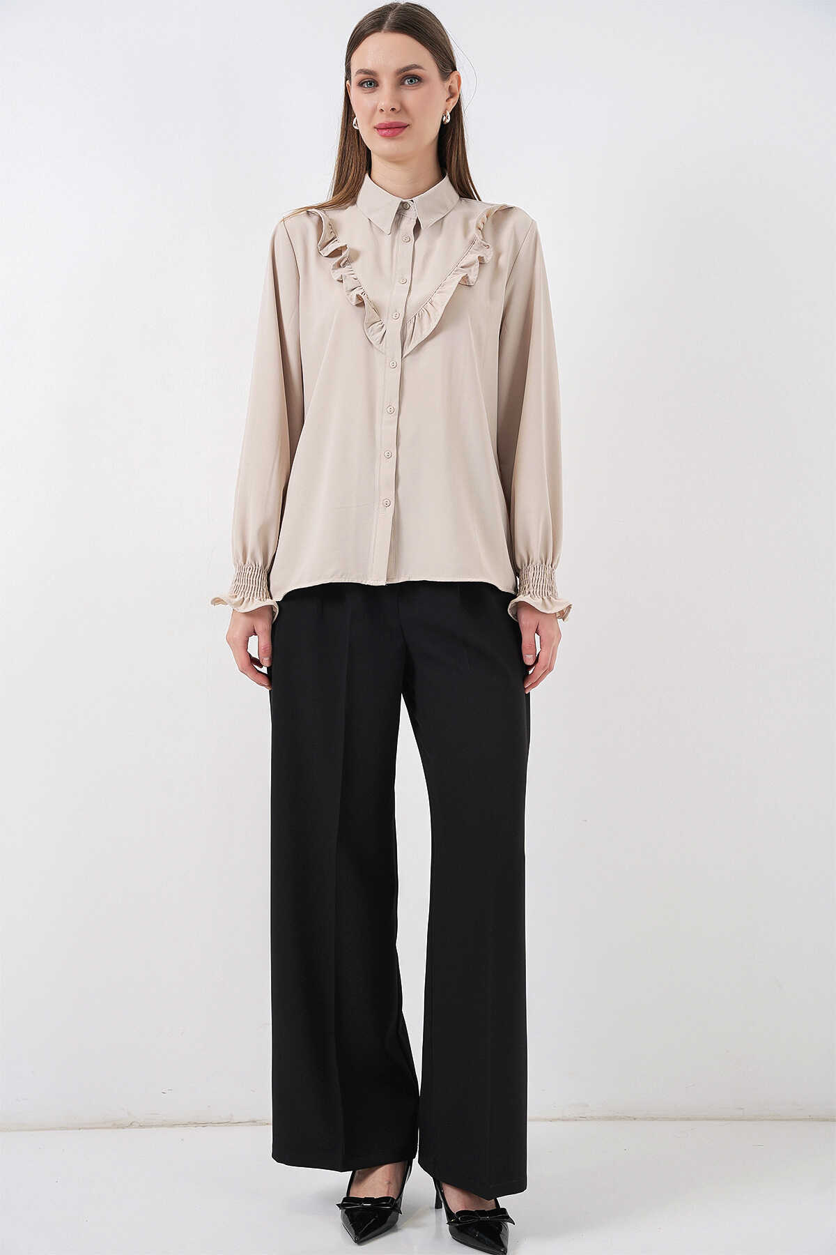 20223 Fırfırlı Uzun Kol Gömlek - Taş - Kombin