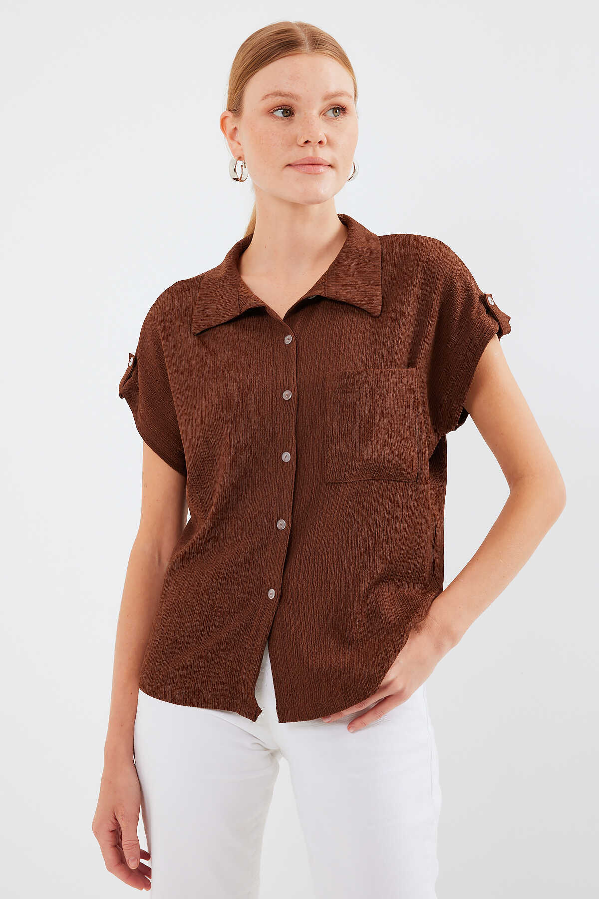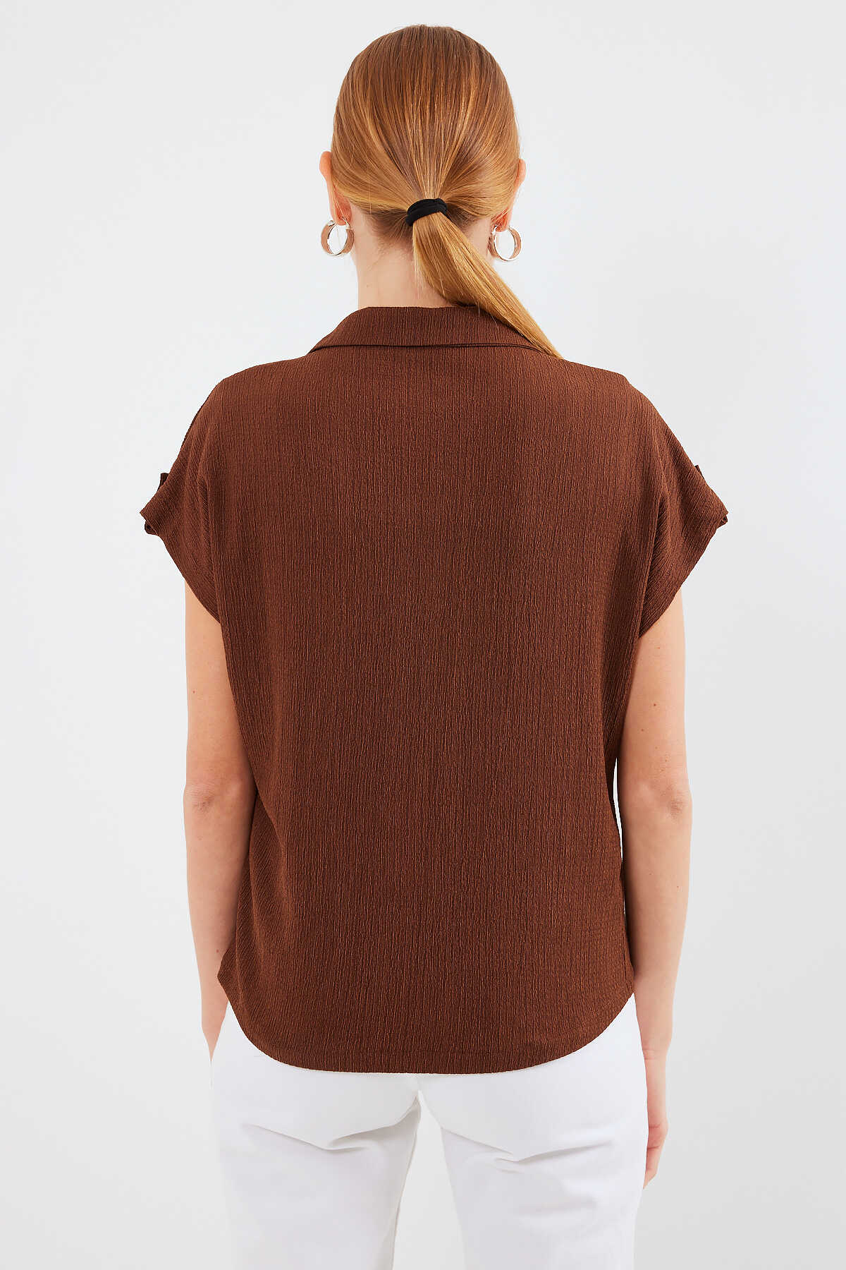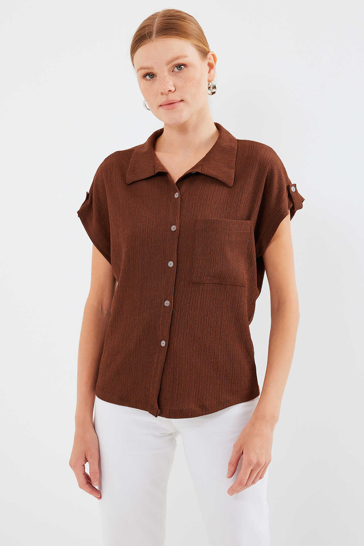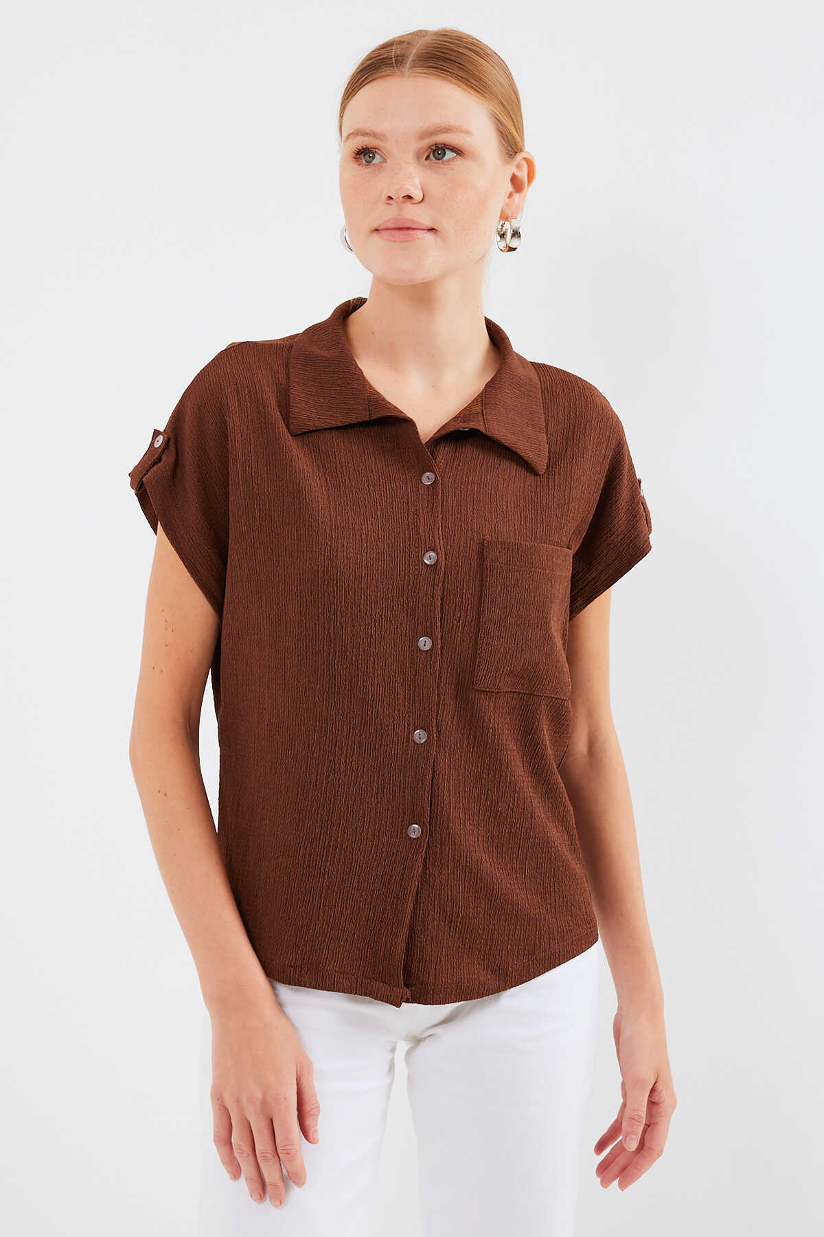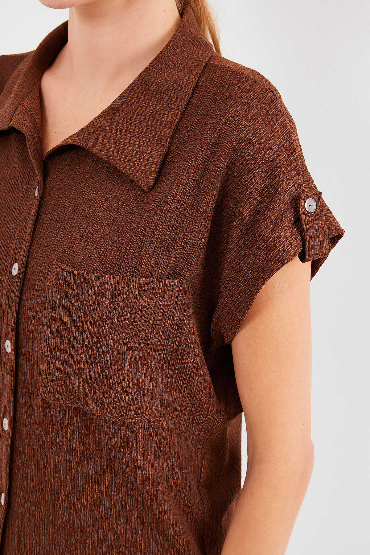 20256 Manşetli Double Kısa Kollu Gömlek - Kahverengi