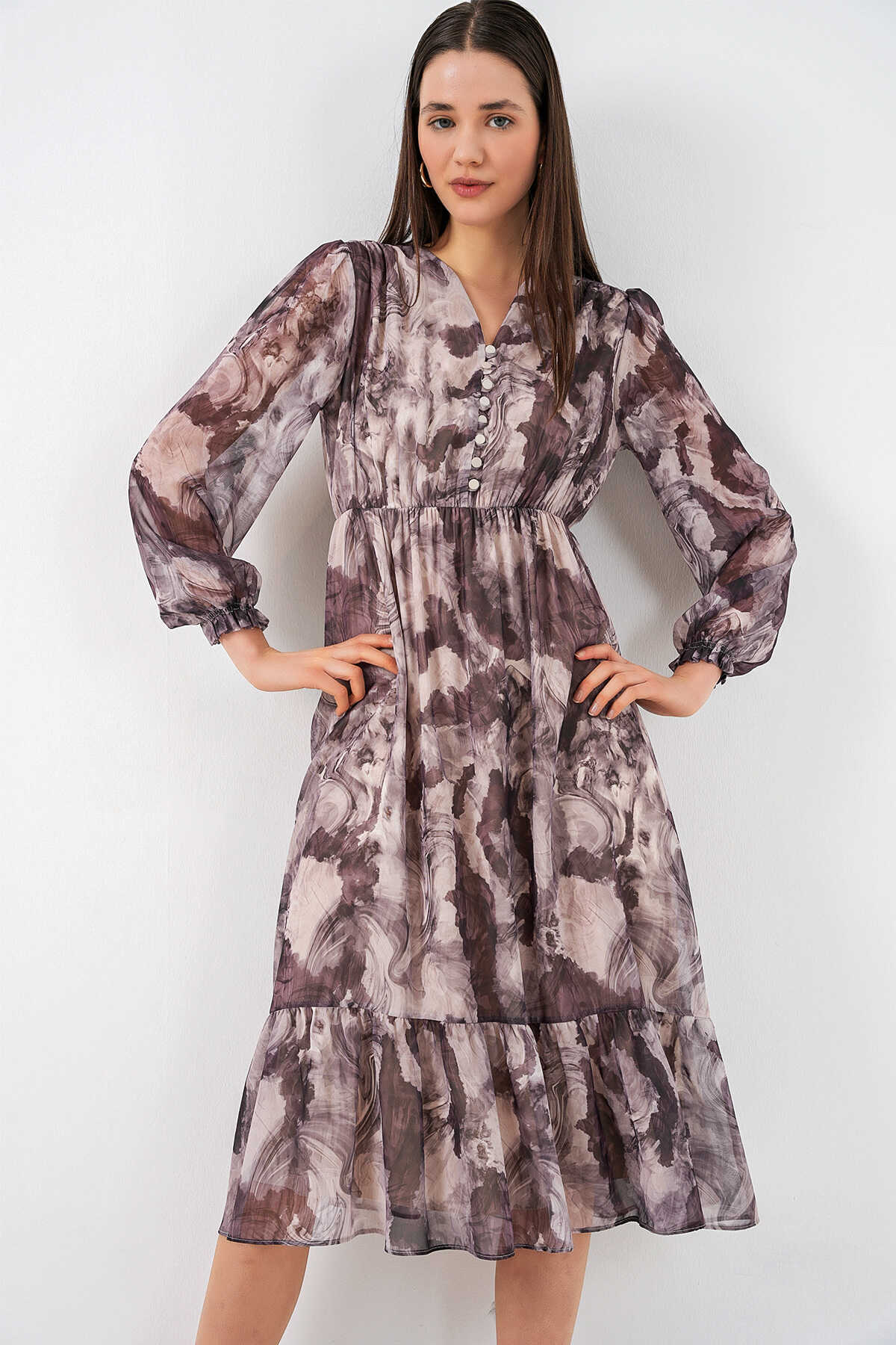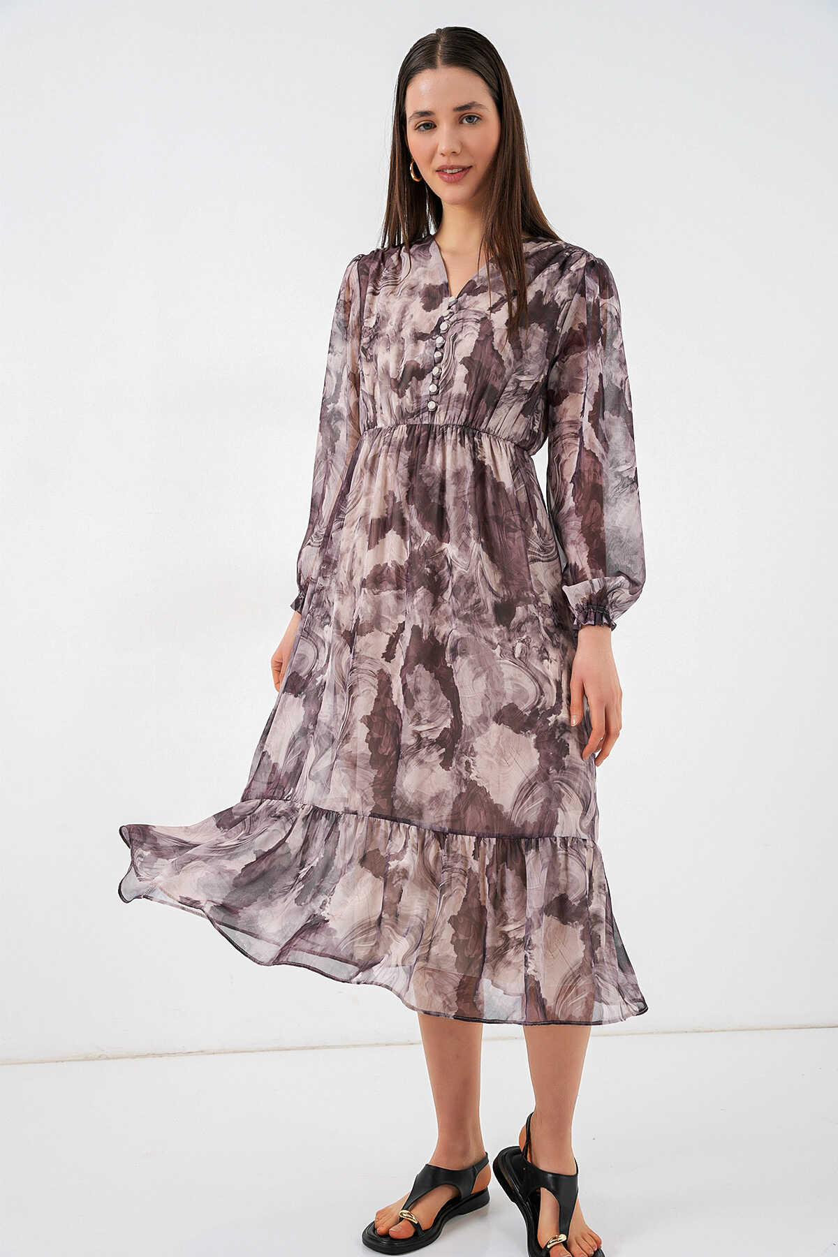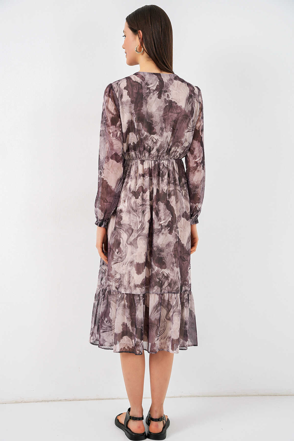 2137 Desenli Şifon Elbise - A.Bej - Kombin