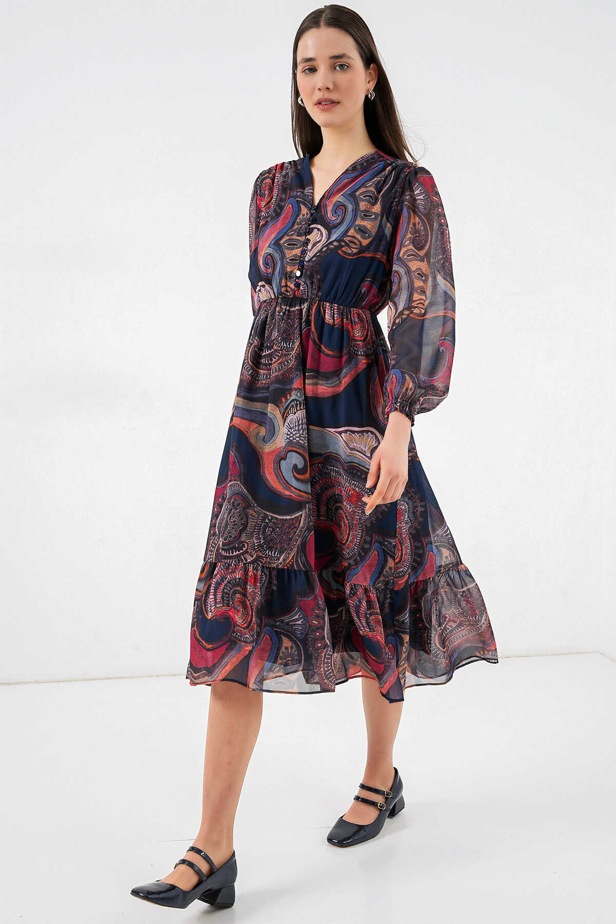 2137 Desenli Şifon Elbise - Çok Renkli - Kombin