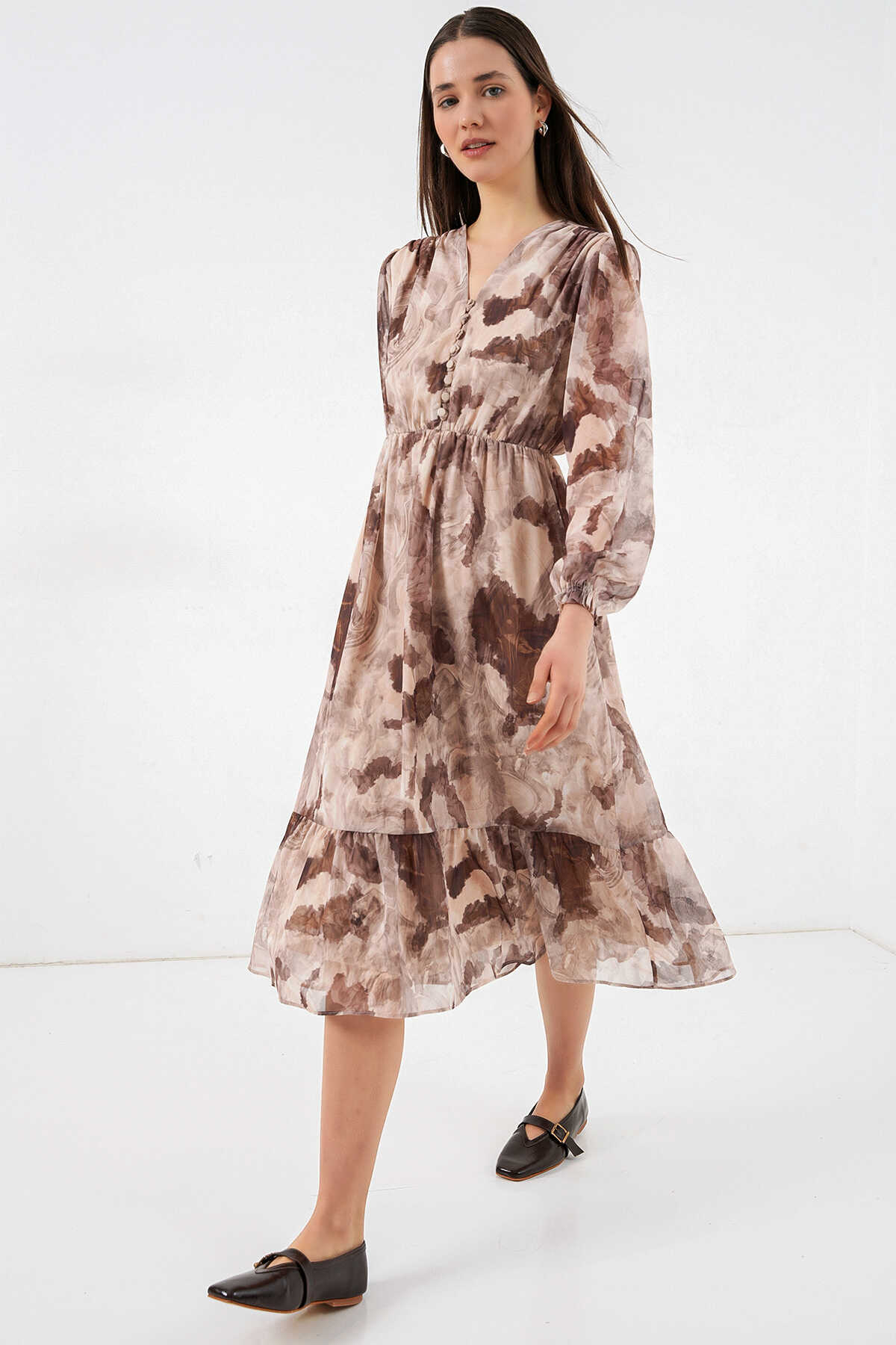 2137 Desenli Şifon Elbise - K. Bej - Kombin