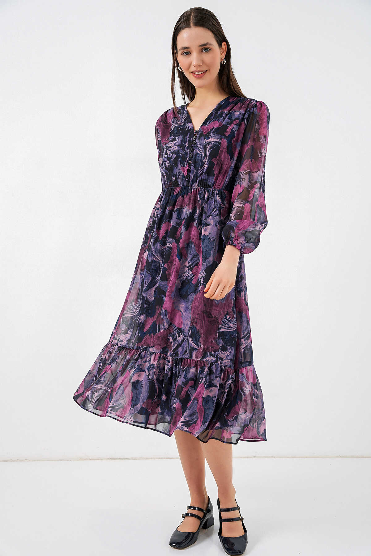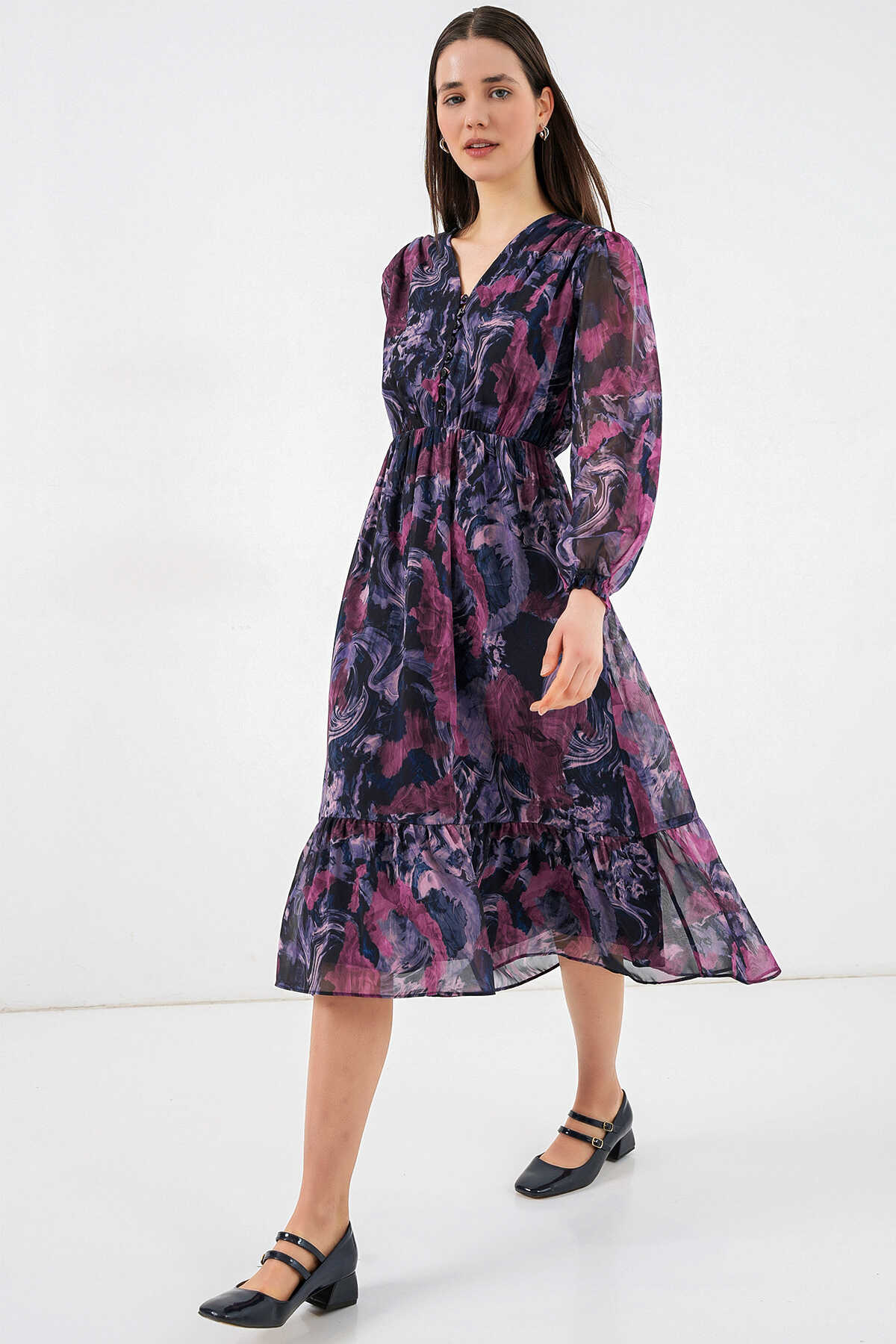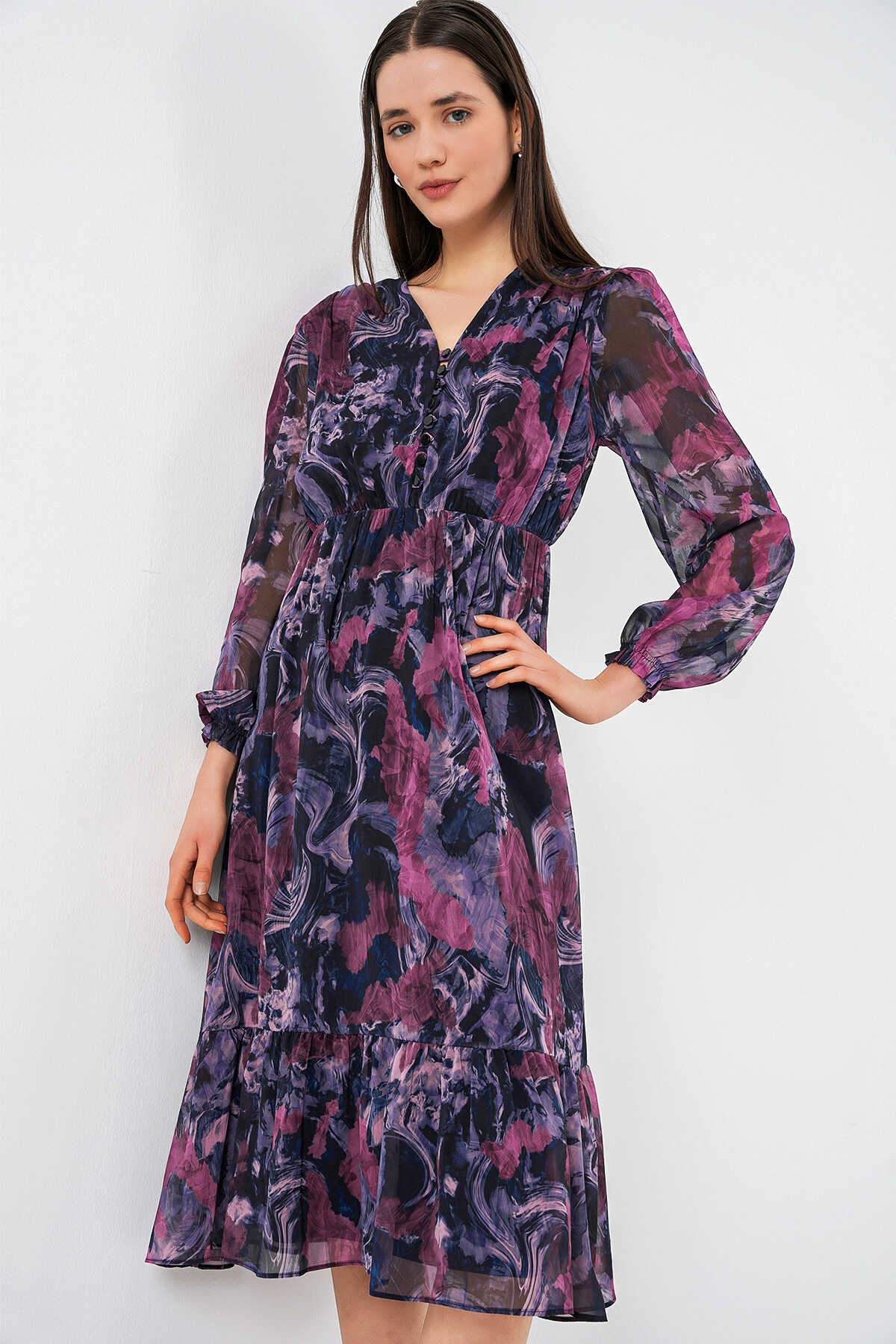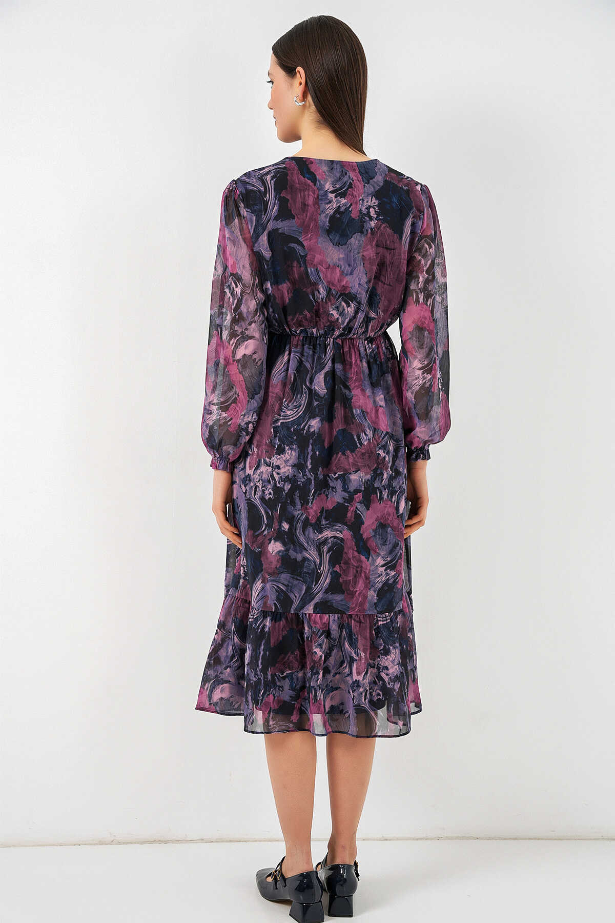 2137 Desenli Şifon Elbise - Koyu Lila - Kombin