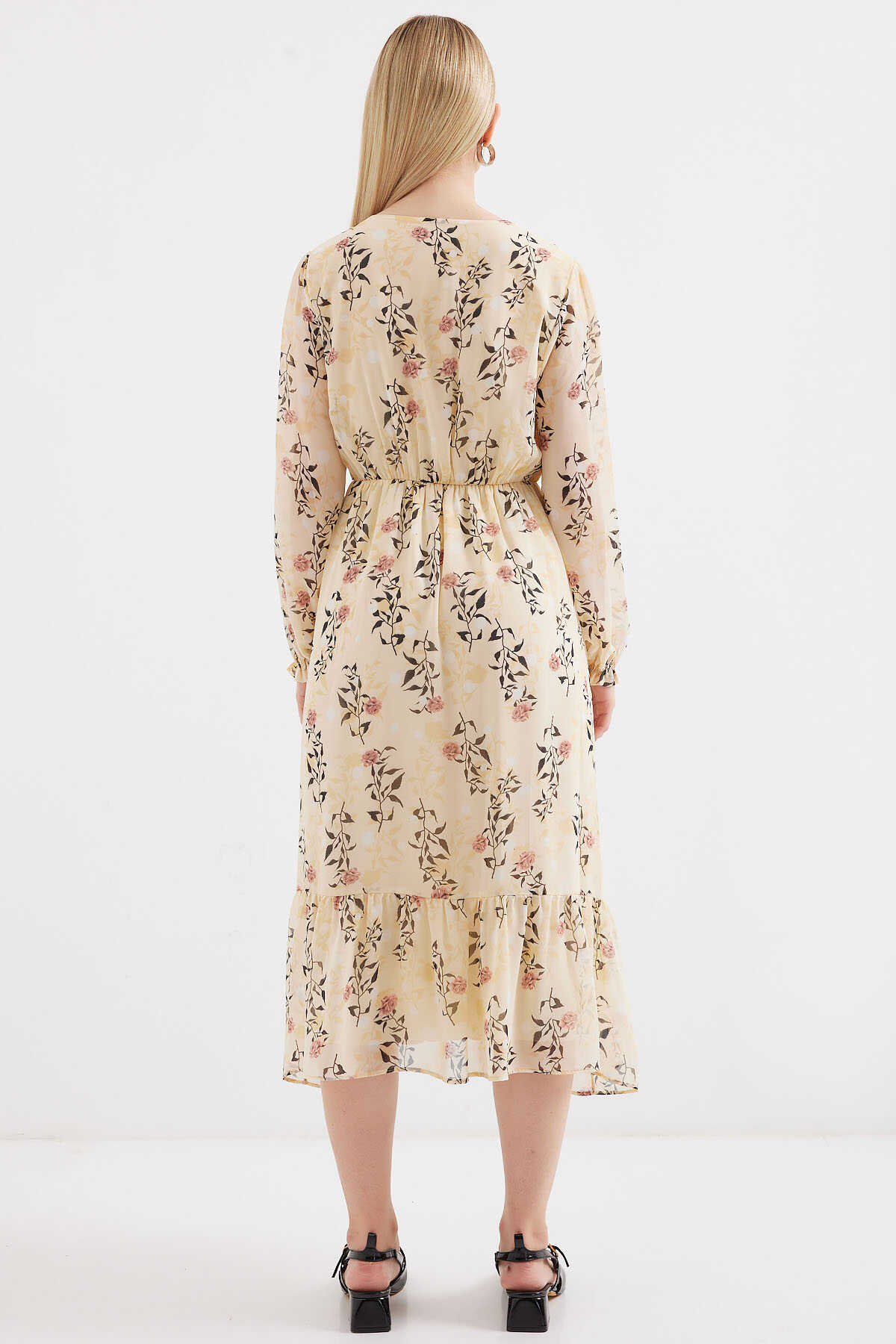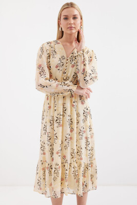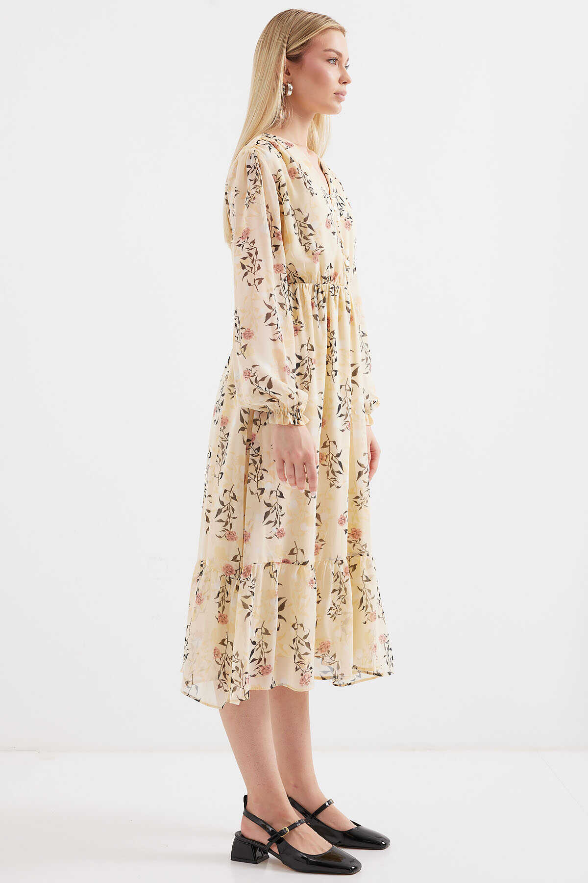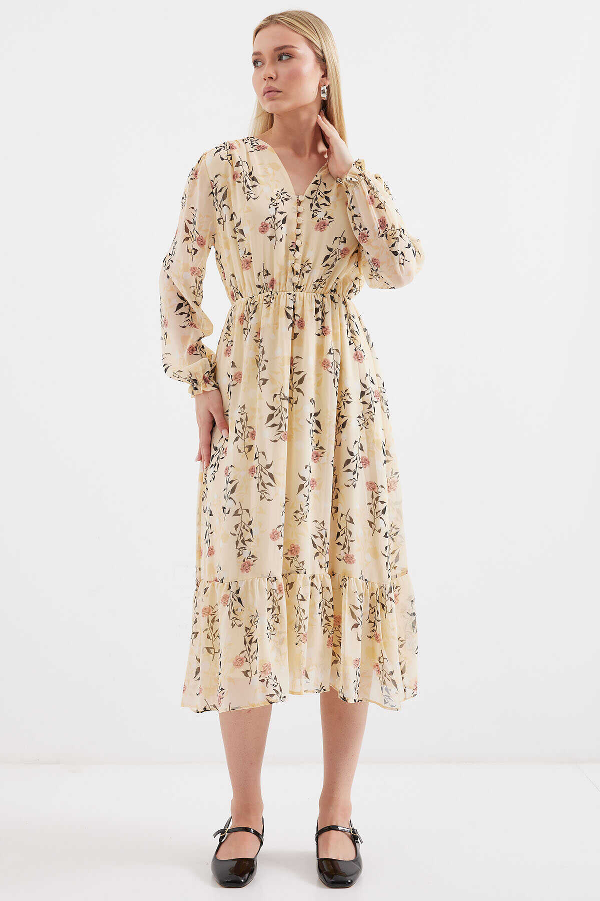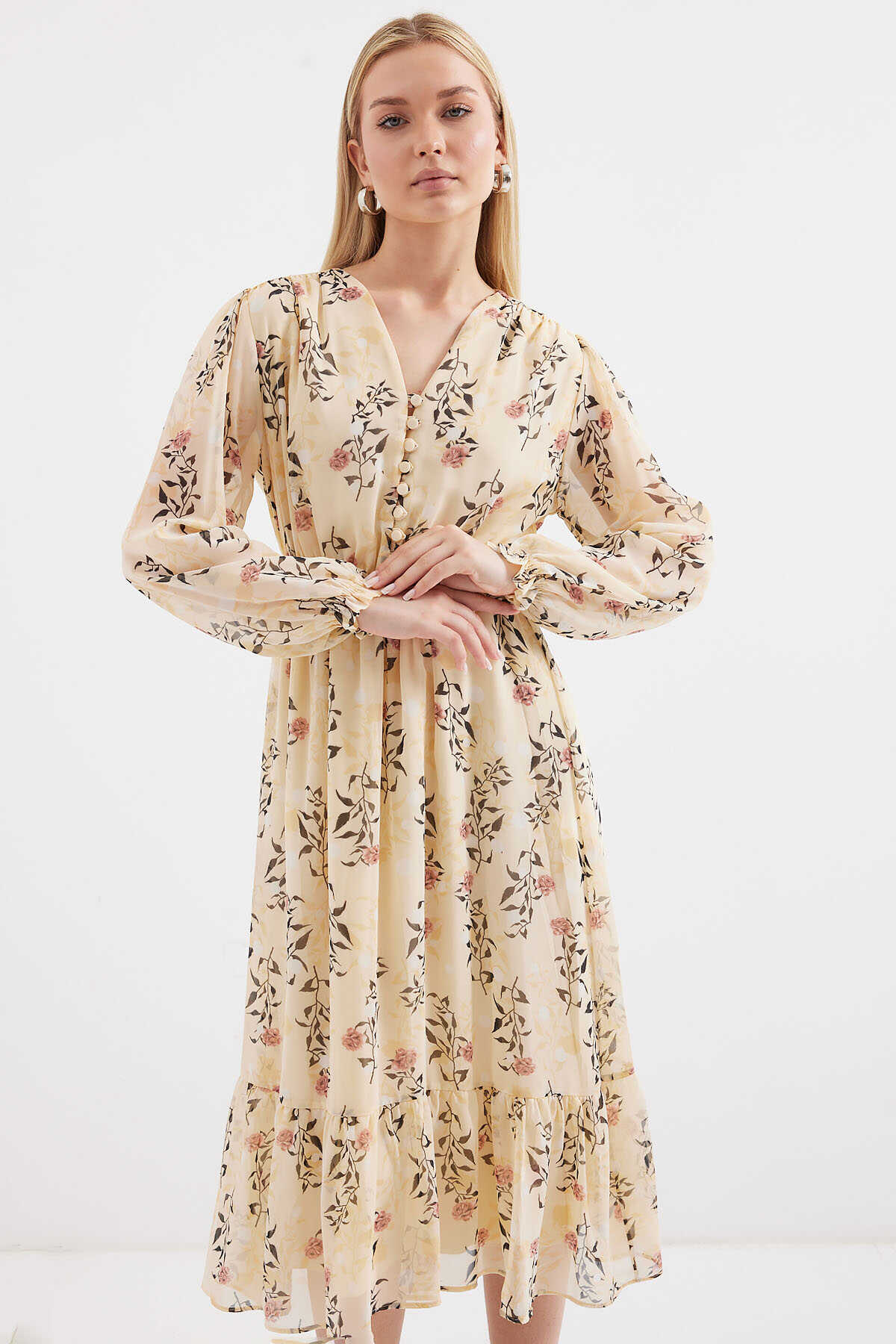 Desenli Sifon Elbise,Içi Astarli Sifon Elbise, V Yaka Sifon Elbise, Dügmeli Sifon Elbise