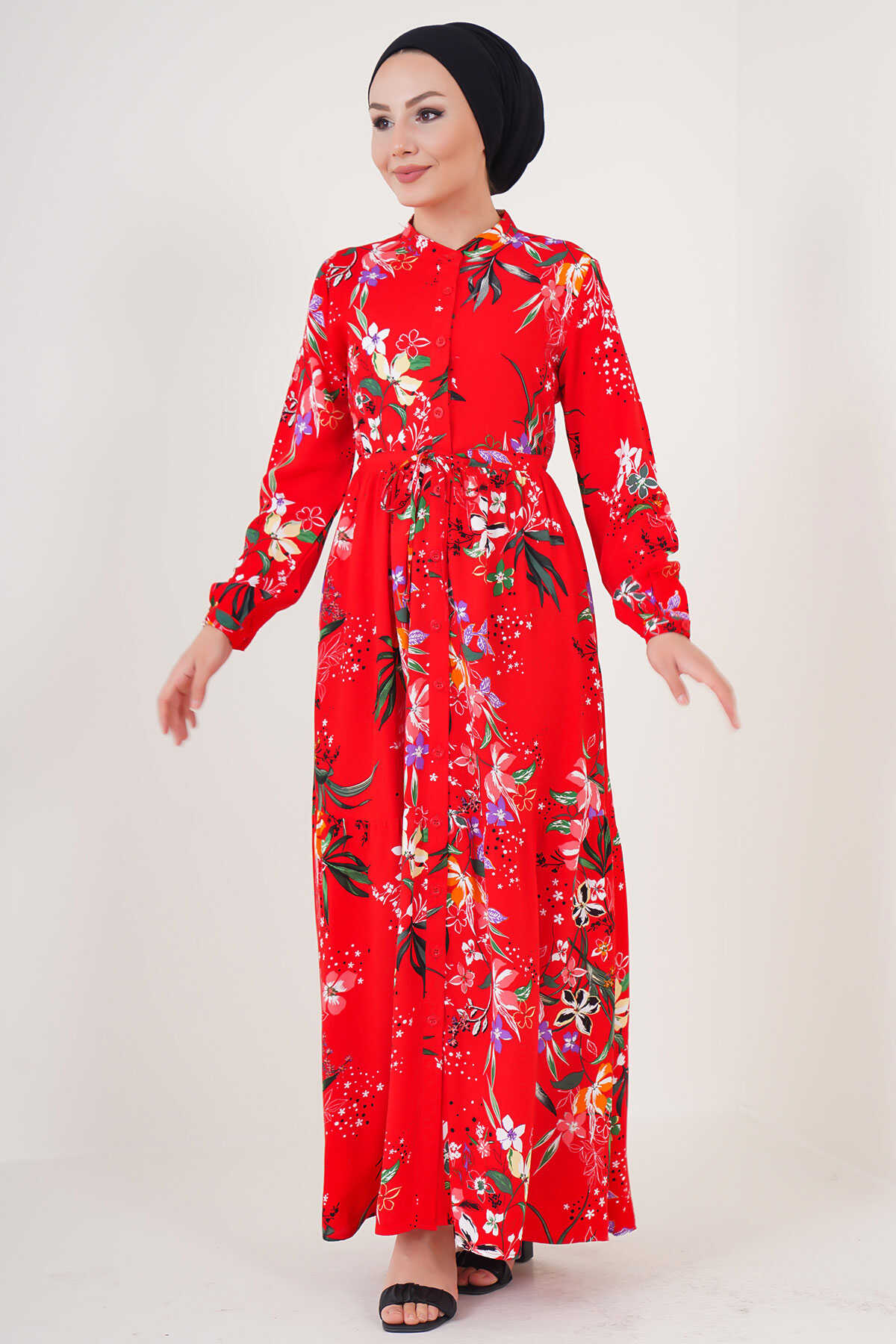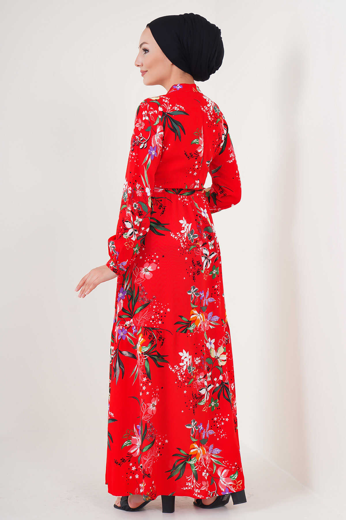 2144 Hakim Yaka Tesettür Elbise - A.Kırmızı