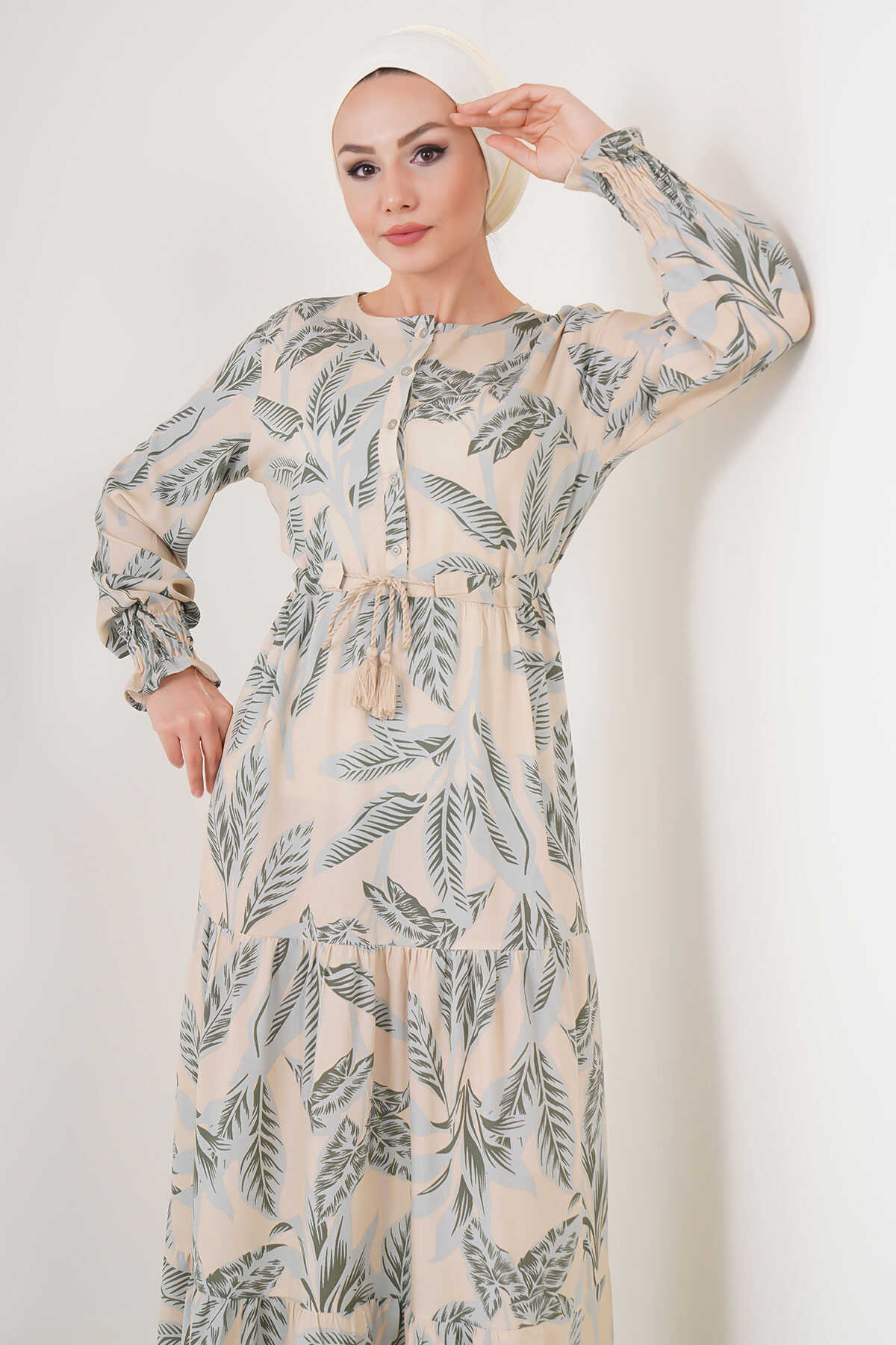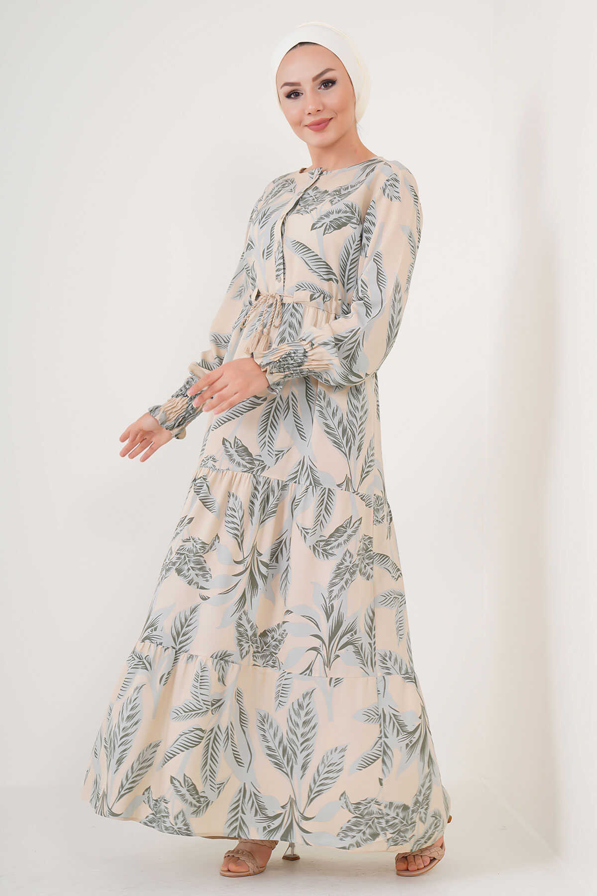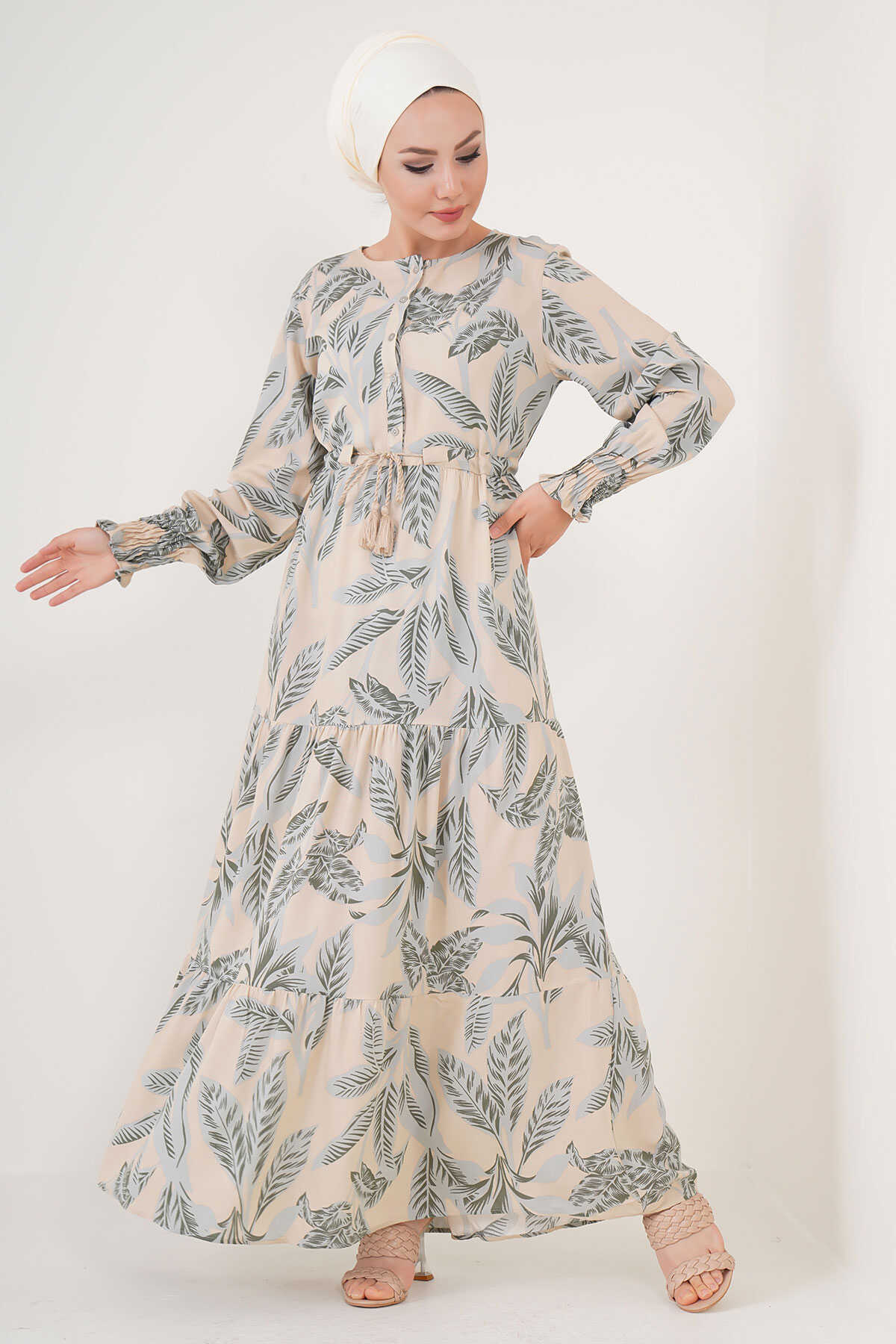 2145 Desenli Tesettür Elbise - Bej - Kombin